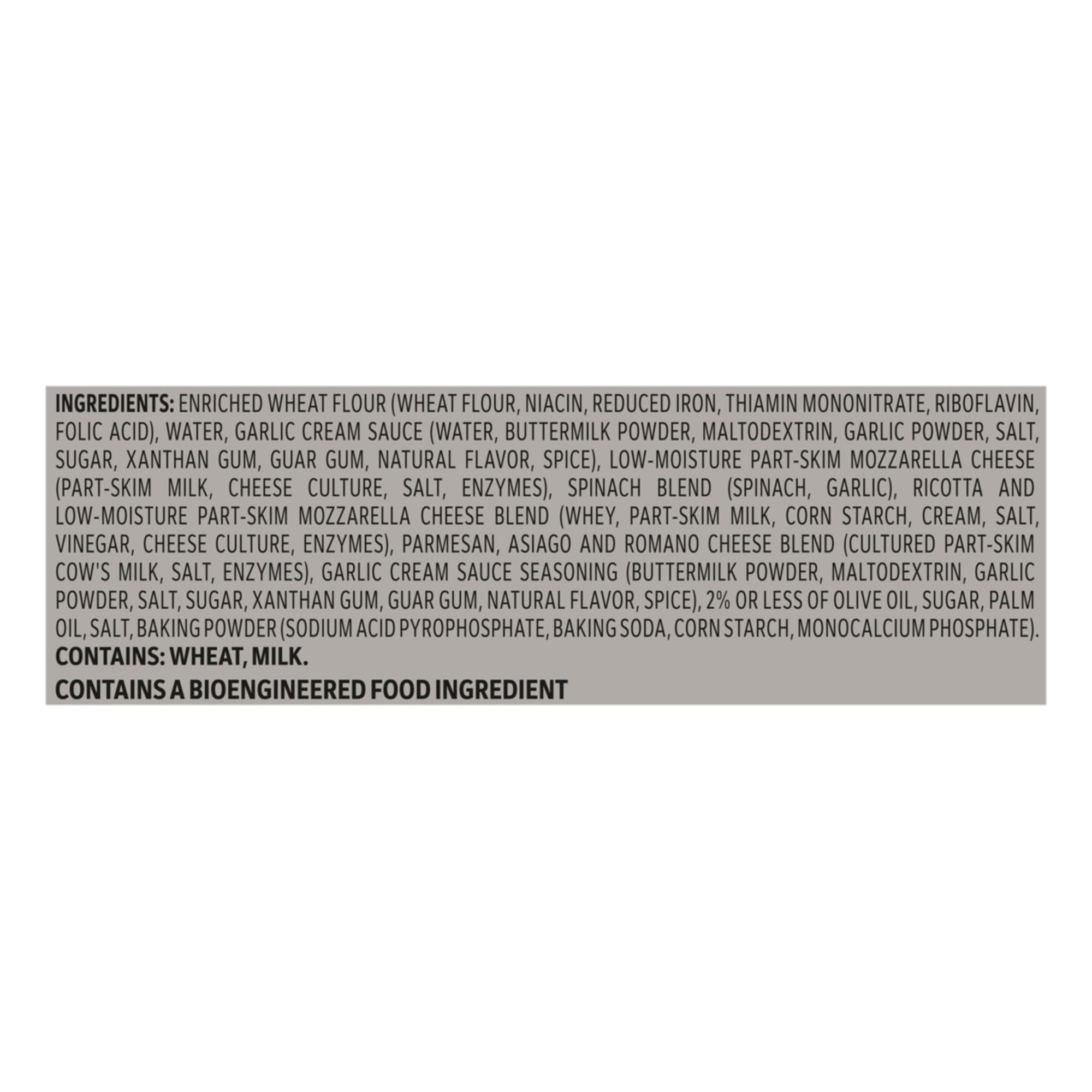 Ingredients: Enriched Wheat Flour (Wheat Flour, Niacin, Reduced Iron, Thiamin Mononitrate, Riboflavin, Folic Acid), Water, Garlic Cream Sauce (Water, Buttermilk Powder, Maltodextrin, Garlic Powder, Salt, Sugar, Xanthan Gum, Guar Gum, Natural Flavor, Spice), Low-moisture Part-skim Mozzarella Cheese (Part-skim Milk, Cheese Culture, Salt, Enzymes), Spinach Blend (Spinach, Garlic), Ricotta And Low-moisture Part-skim Mozzarella Cheese Blend (Whey, Part-skim Milk, Corn Starch, Cream, Salt, Vinegar, Cheese Culture, Enzymes), Parmesan, Asiago And Romano Cheese Blend (Cultured Part-skim Cow's Milk, Salt, Enzymes), Garlic Cream Sauce Seasoning (Buttermilk Powder, Maltodextrin, Garlic Powder, Salt, Sugar, Xanthan Gum, Guar Gum, Natural Flavor, Spice), 2% Or Less Of Olive Oil, Sugar, Palm Oil, Salt, Baking Powder (Sodium Acid Pyrophosphate, Baking Soda, Corn Starch, Monocalcium Phosphate).