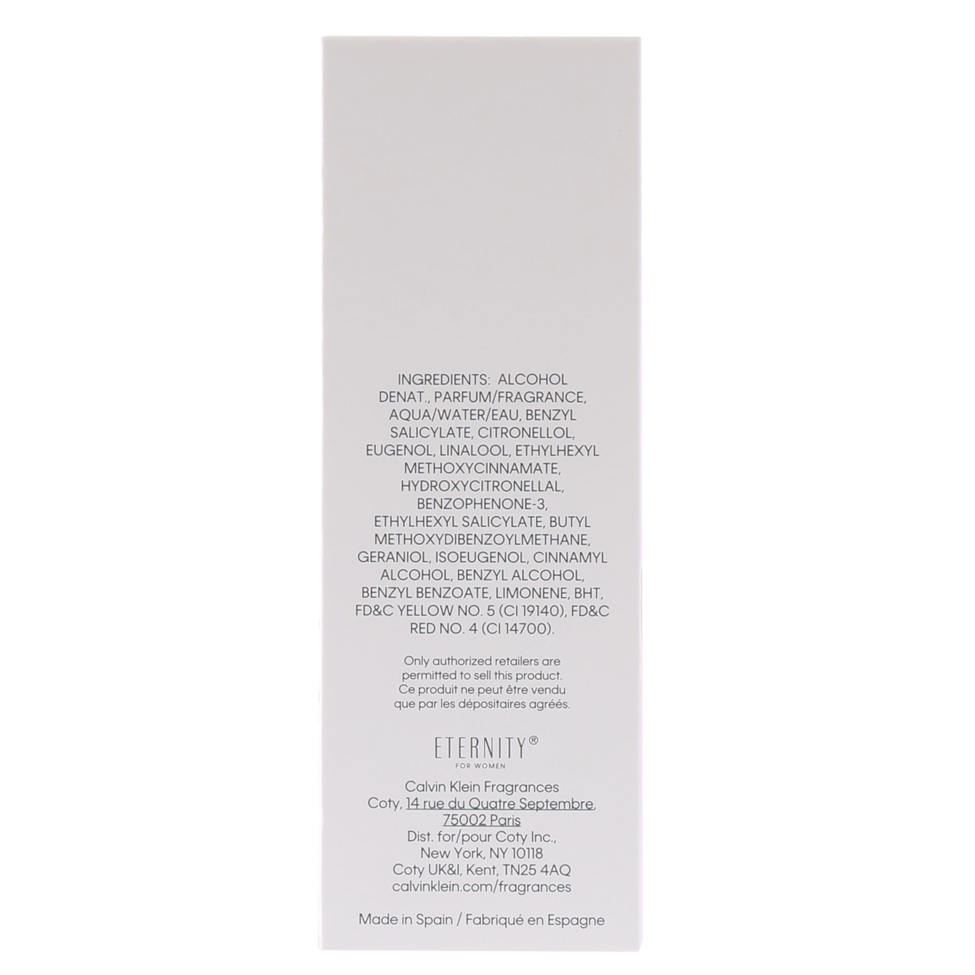 Ingredients: Alcohol Denat., Parfum/Fragrance, Aqua/Water/Eau, Benzyl Salicylate, Butylphenyl Methylpropional, Citronellol, Eugenol, Linalool, Ethylhexyl Methoxycinnamate, Hydroxycitronellal, Benzophenone-3, Ethylhexyl Salicylate, Butyl Methoxydibenzoylmethane, Hydroxyisohexyl 3-Cyclohexene Carboxaldehyde, Geraniol, Isoeugenol, Cinnamyl Alcohol, Limonene, BHT, Propylene Glycol, Benzyl Alcohol, Benzyl Benzoate, Acrylates/Octylacrylamide Copolymer, Hydrolyzed Jojoba Esters, FD&C Yellow No. 5 (CI 19140), FD&C Red No. 4 (CI 14700).