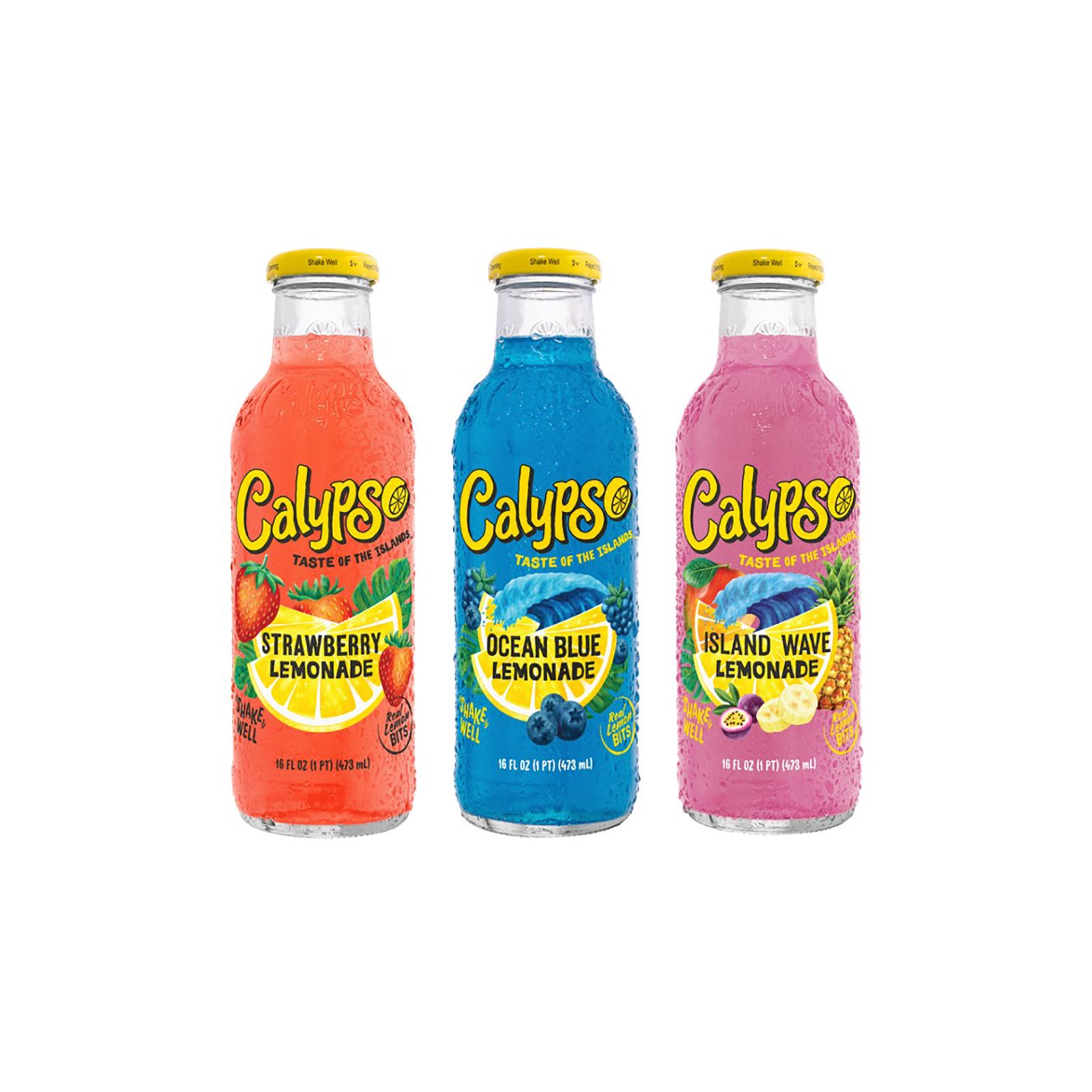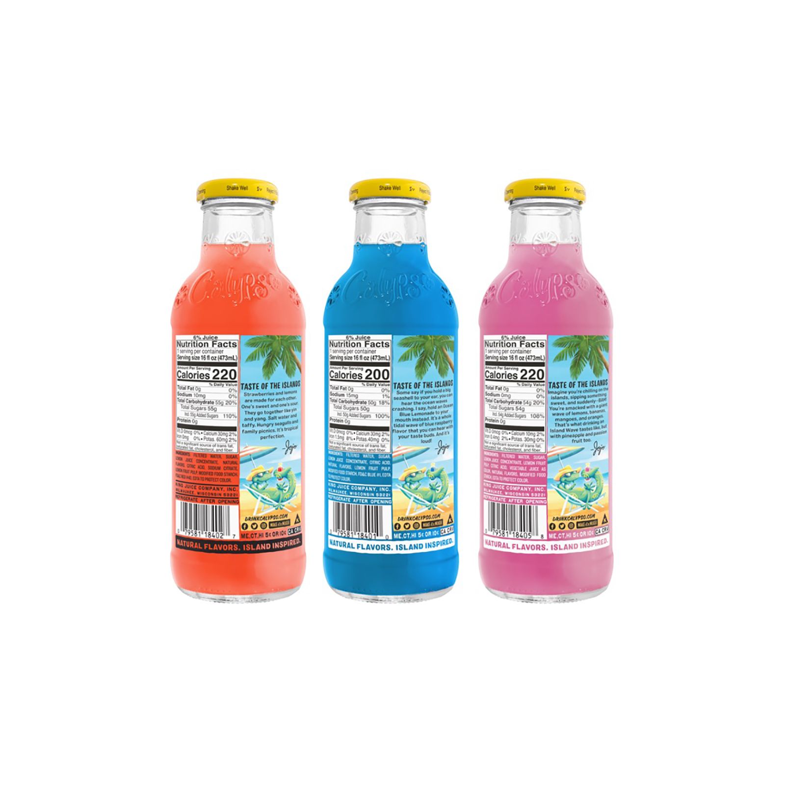 Made with real lemon, real sugar, natural flavors, and served in premium custom glass bottles Inspired by the fruits, flavors and spirt of the islands Based on Claypso's Original Lemonade recipe Includes 12 pack of 16-oz. glass bottles (four Ocean Blue, four Island Wave, and four Strawberry Lemonade)