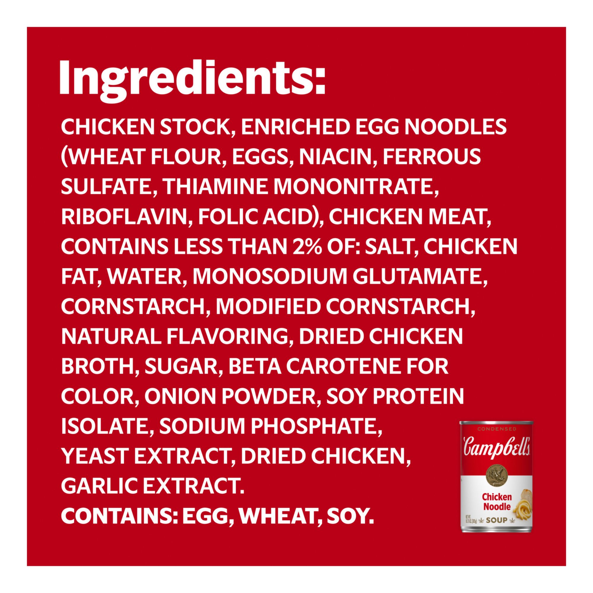 Ingredients: Chicken Stock, Enriched Egg Noodles (Wheat Flour, Eggs, Niacin, Ferrous Sulfate, Thiamine Mononitrate, Riboflavin, Folic Acid), Chicken Meat, Contains Less Than 2% Of: Salt, Chicken Fat, Water, Monosodium Glutamate, Cornstarch, Modified Cornstarch, Natural Flavoring, Dried Chicken Broth, Sugar, Beta Carotene For Color, Onion Powder, Soy Protein Isolate, Sodium Phosphate, Yeast Extract, Dried Chicken, Garlic Extract. Contains: Egg, Wheat, Soy.