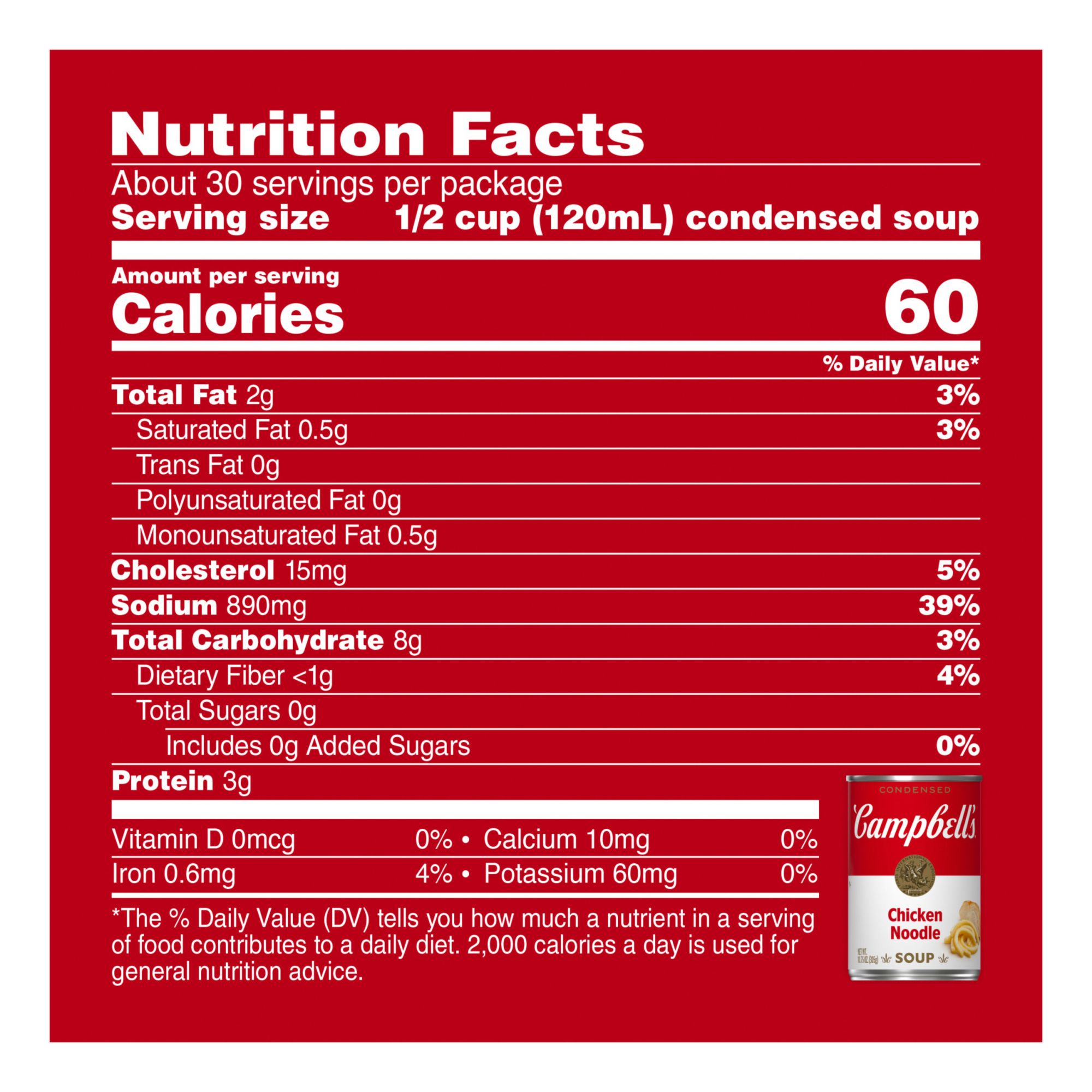 Campbell’s Condensed Chicken Noodle Soup is made with chicken meat with no antibiotics and delicious, fresh noodles. America's favorite soup, Campbell's Condensed Soup has over 125 years of excellence, and is the start to a great meal. Campbell's Chicken Noodle Soup has a nostalgic flavor that warms both body and soul. Heat it up and pair with crackers or a sandwich for a quick, comforting meal. This convenient canned soup is a year-round pantry staple and the perfect comfort food on a chilly day or when you’re feeling under the weather. Simply mix the condensed soup with 1 can of water and microwave on high for 2.5 to 3 minutes in a covered microwave-safe bowl, or heat in a pot on the stove, stirring occasionally. Each 10.75 oz. recyclable can contains about 2.5 servings of microwave soup and features a non-BPA lining. From Chicken Noodle to Cream of Mushroom and everything in between, Campbell’s makes delicious soups in flavors your family knows and loves, with quality, farm-grown ingredients in every can. M’m! M’m! Good!