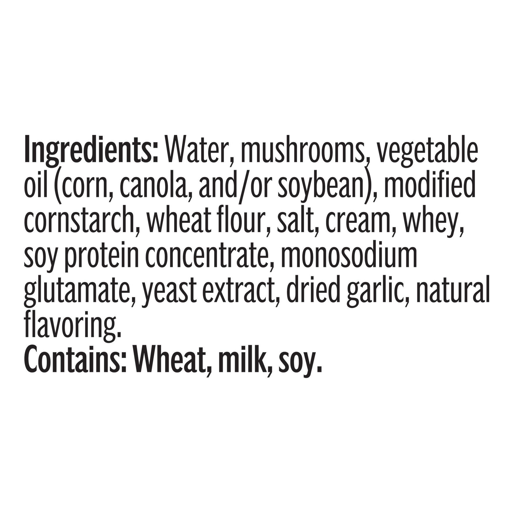 • Ingredients: Water, Mushrooms, Vegetable Oil (Corn, Canola, And/or Soybean), Modified Cornstarch, Wheat Flour, Salt, Cream, Whey, Soy Protein Concentrate, Monosodium Glutamate, Yeast Extract, Dried Garlic, Natural Flavoring. Contains: Wheat, Milk, Soy.