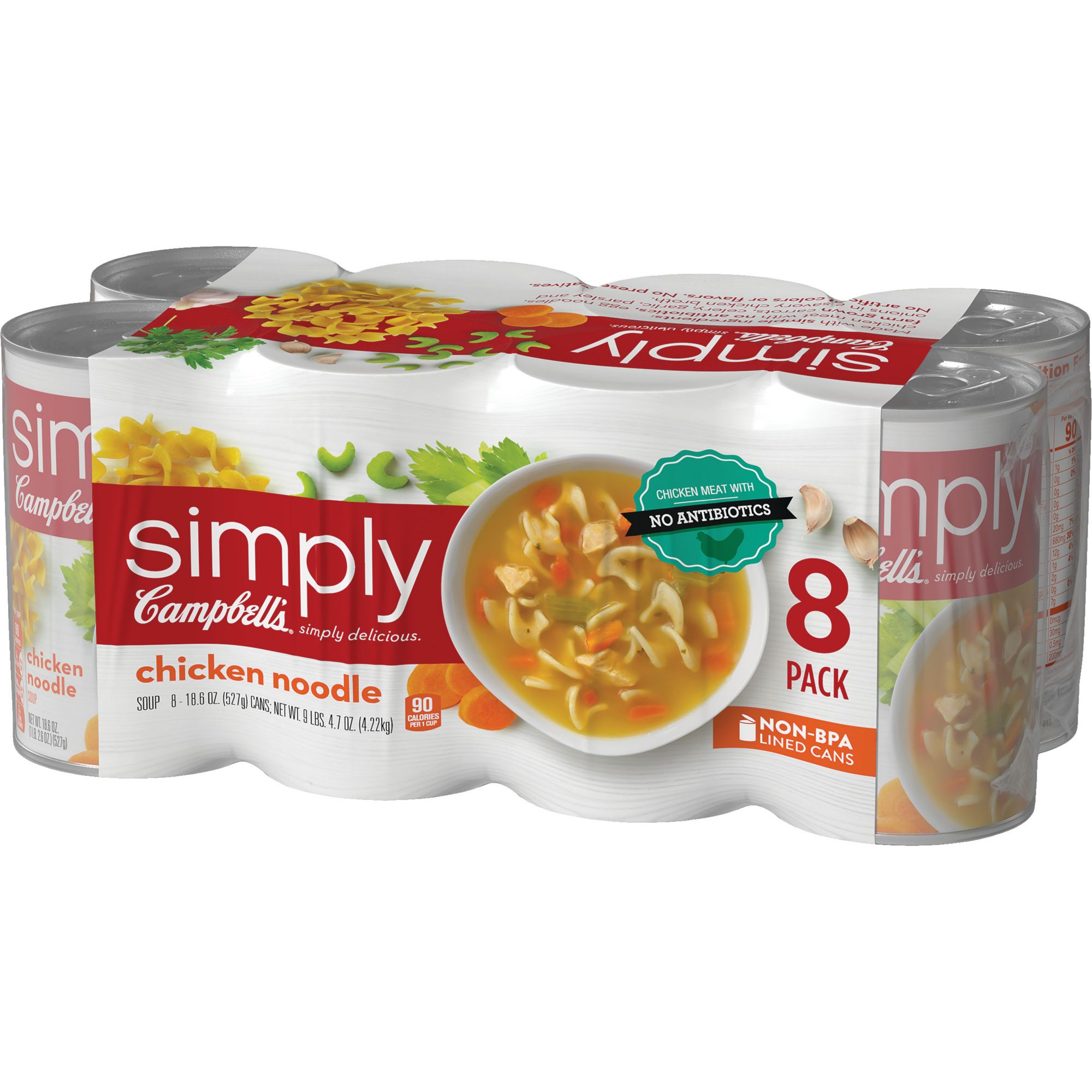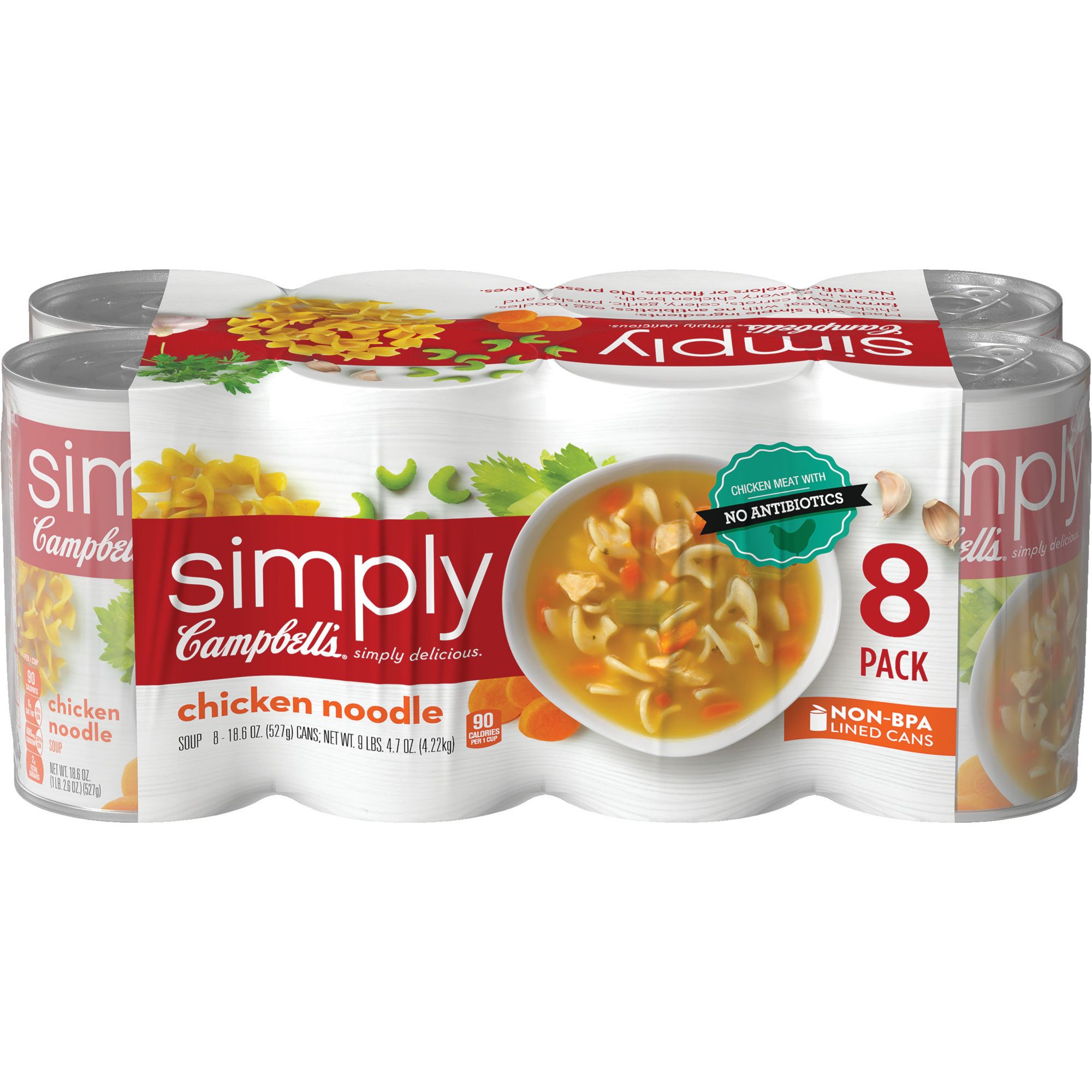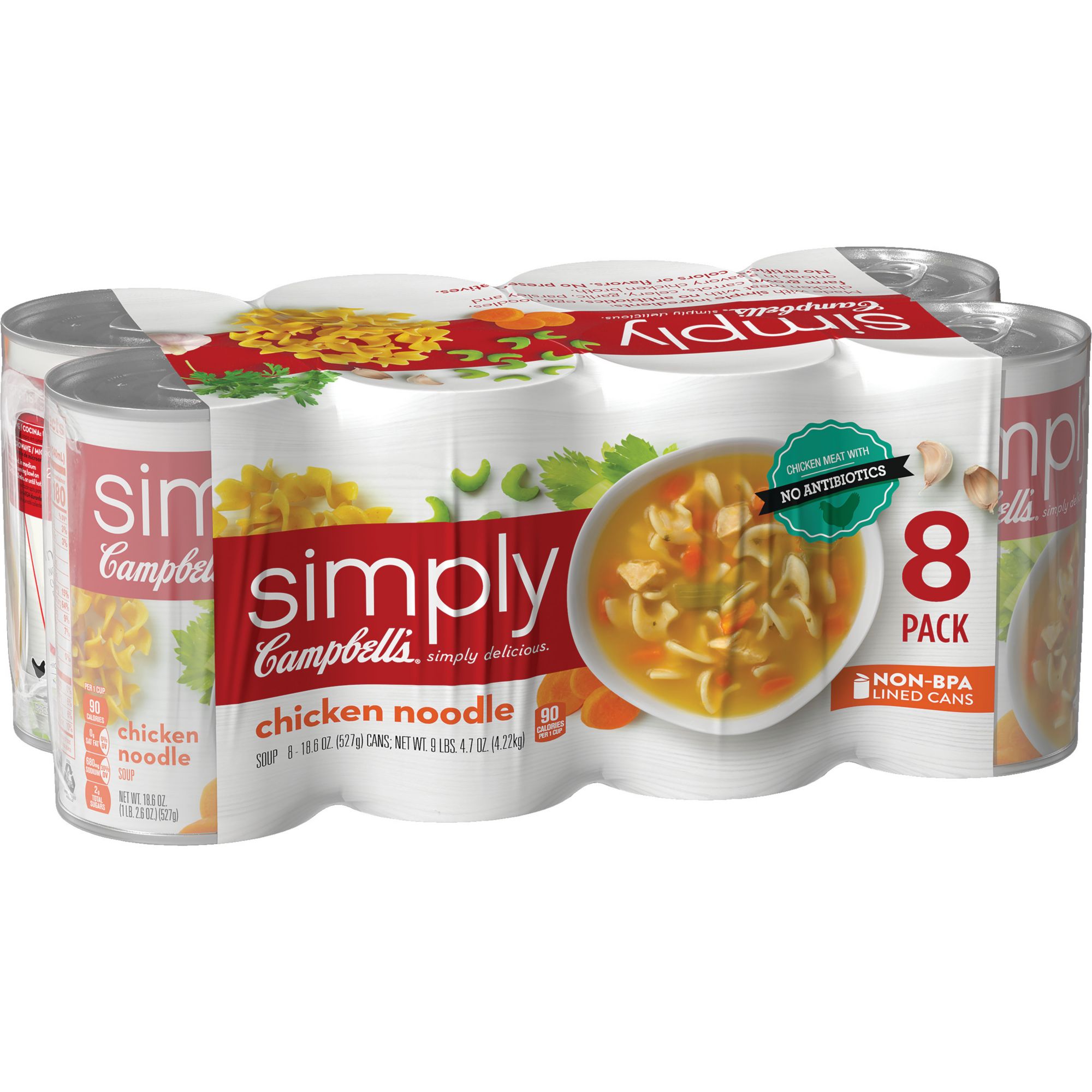 Wholesome chicken noodle soup made with simple ingredients like tender chicken meat, egg noodles, farm-grown carrots, celery and onions Non-BPA lined cans Crafted with chicken meat with no antibiotics No preservatives, artificial colors or flavors 90 calories per 1 cup serving Includes eight 18.8-oz. chicken noodle soup cans