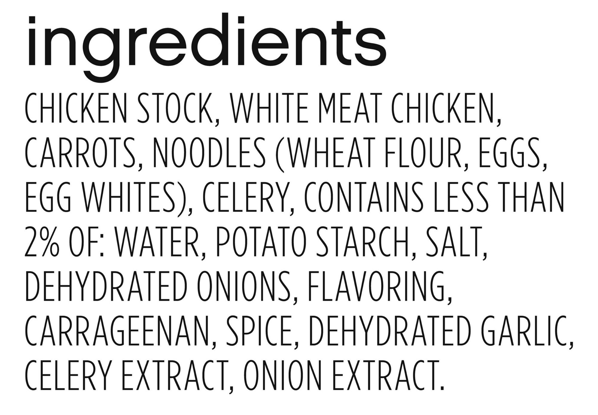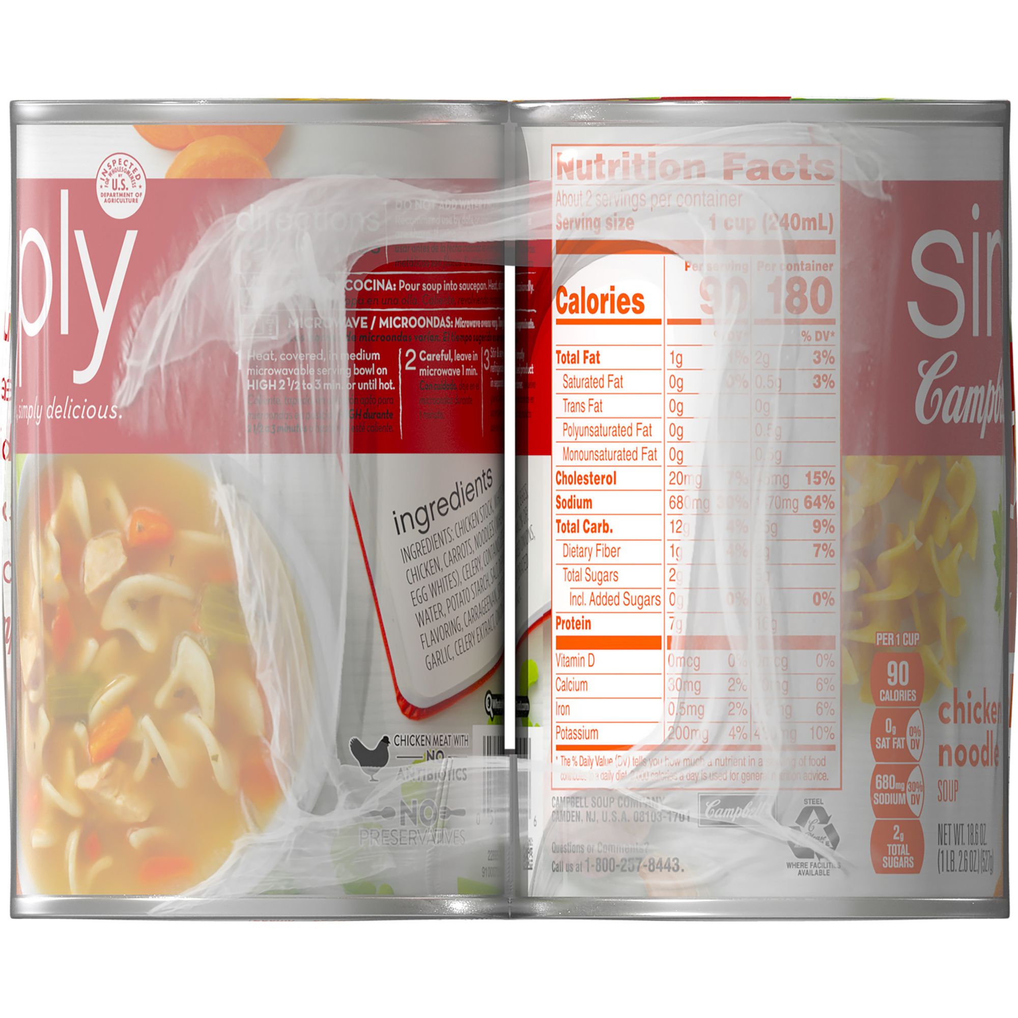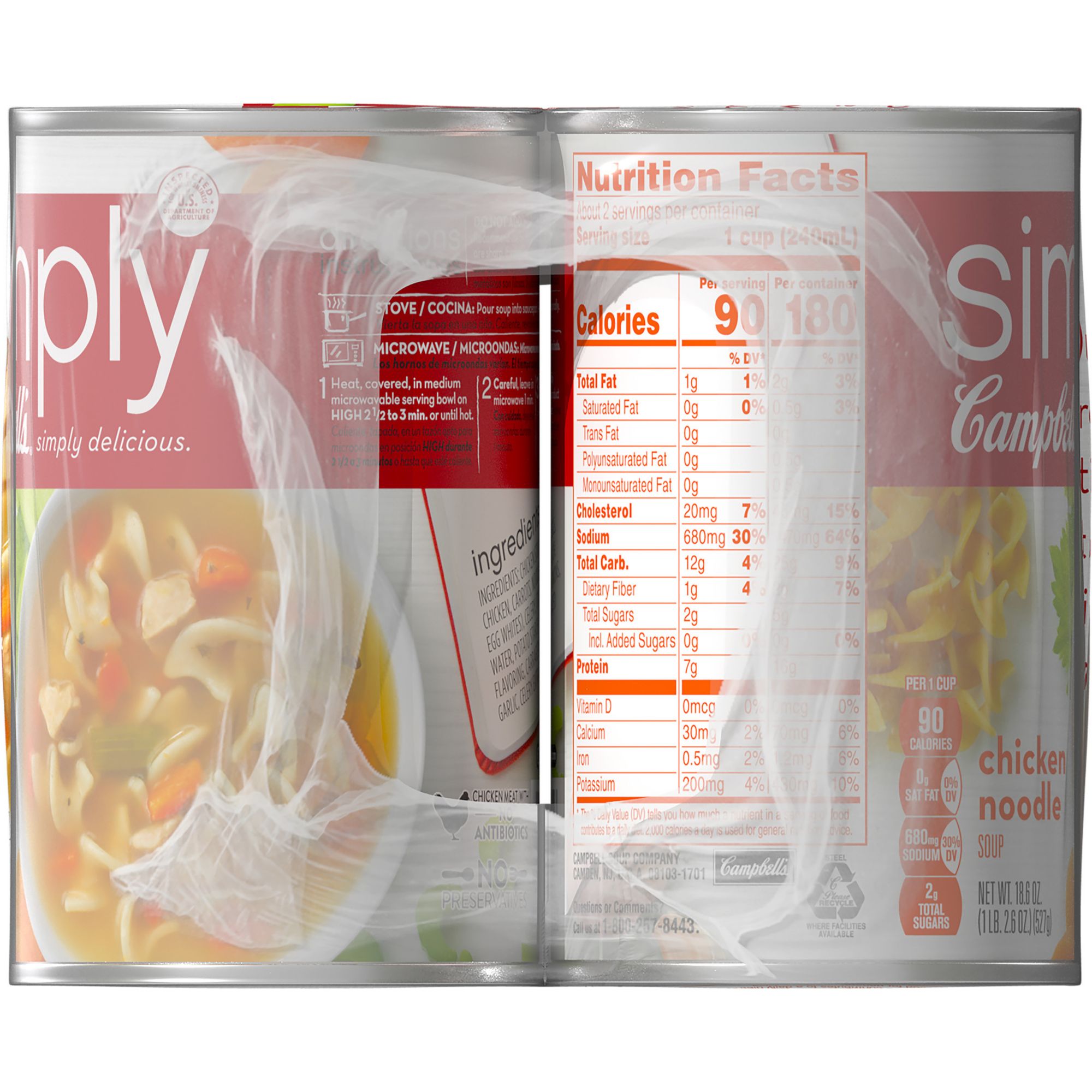 Wholesome chicken noodle soup made with simple ingredients like tender chicken meat, egg noodles, farm-grown carrots, celery and onions Non-BPA lined cans Crafted with chicken meat with no antibiotics No preservatives, artificial colors or flavors 90 calories per 1 cup serving Includes eight 18.8-oz. chicken noodle soup cans