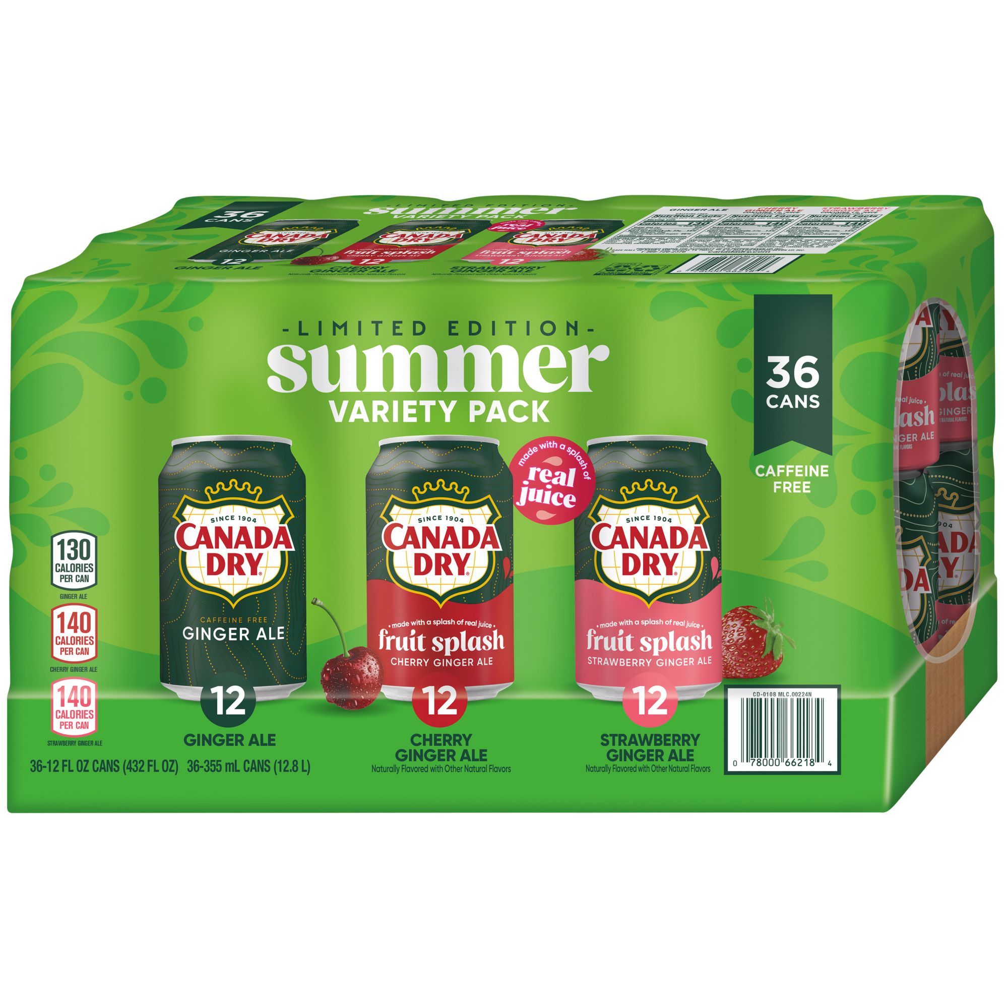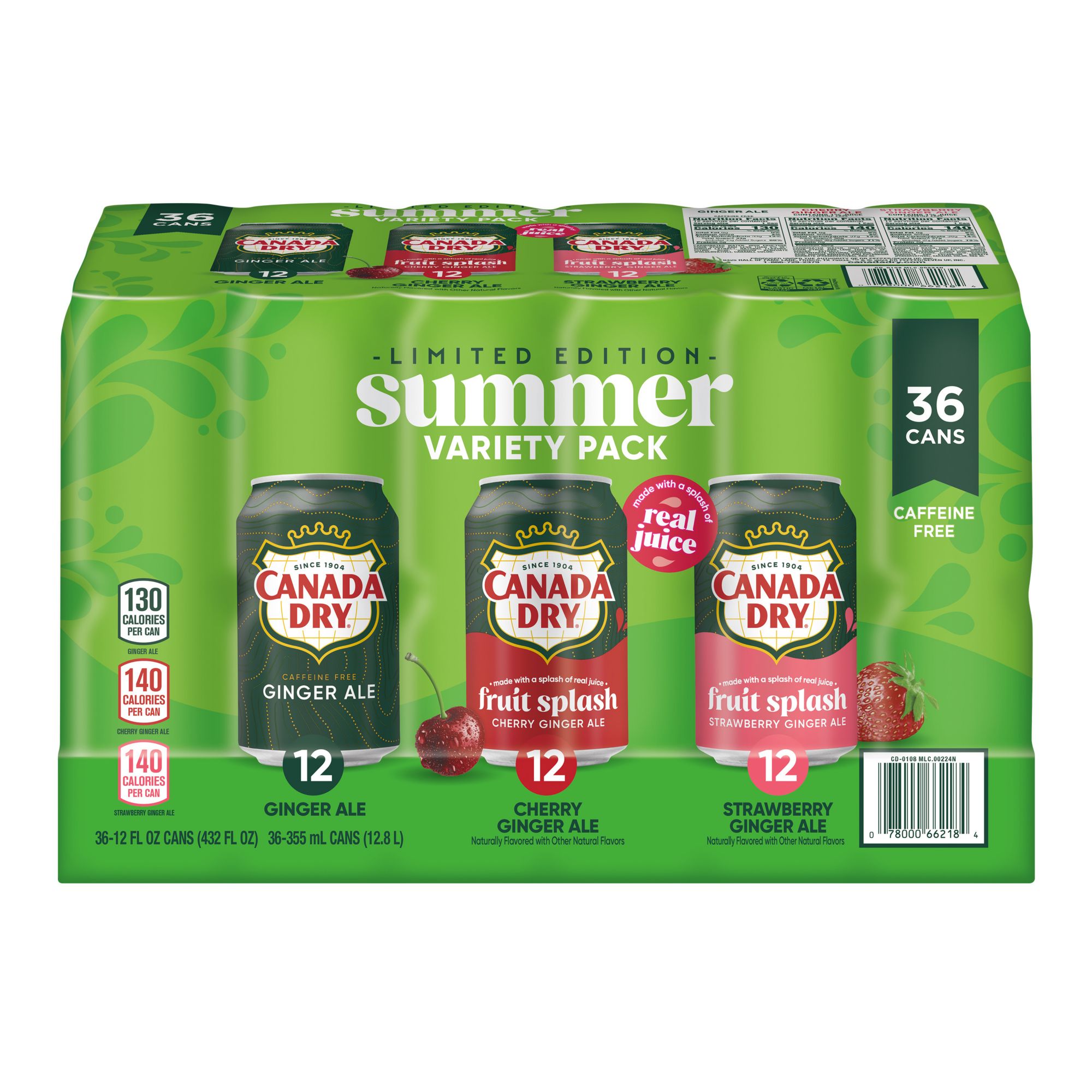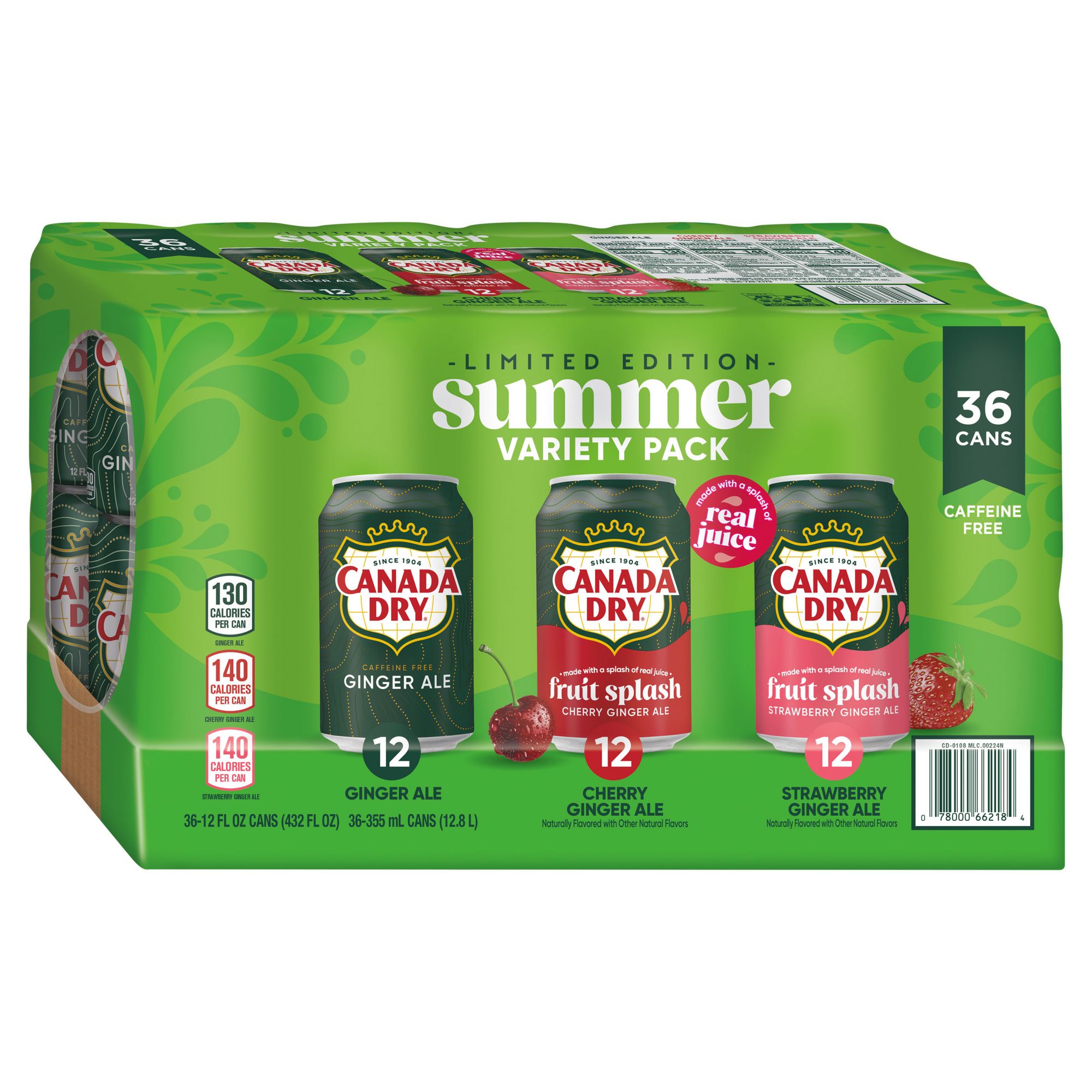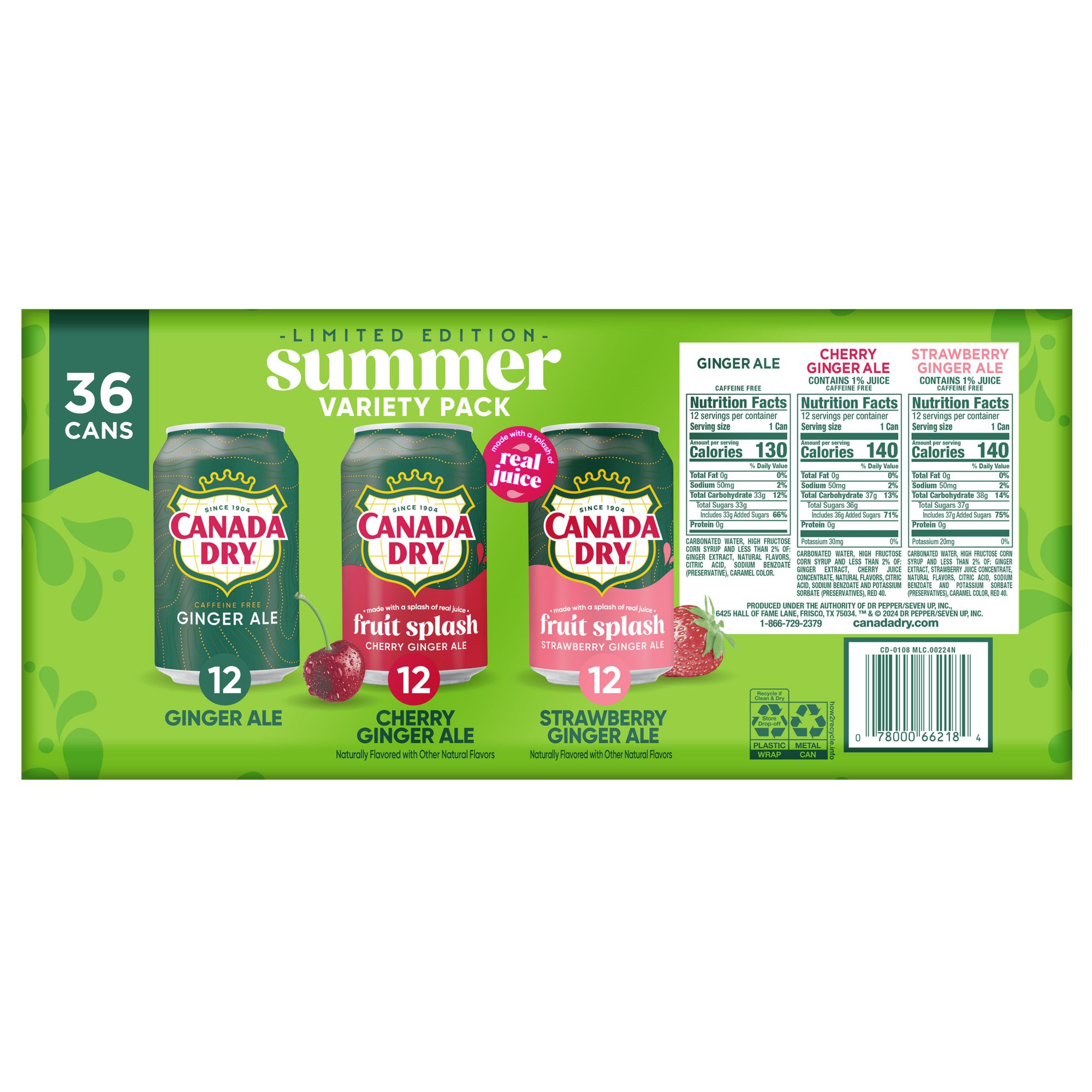 Variety pack: Includes 36, 12 fl. oz. cans of Canada Dry carbonated soda: 12 Ginger Ale, 12 Canada Dry Ginger Ale Fruit Splash Cherry, and 12 Canada Dry Ginger Ale Fruit Splash Strawberry.