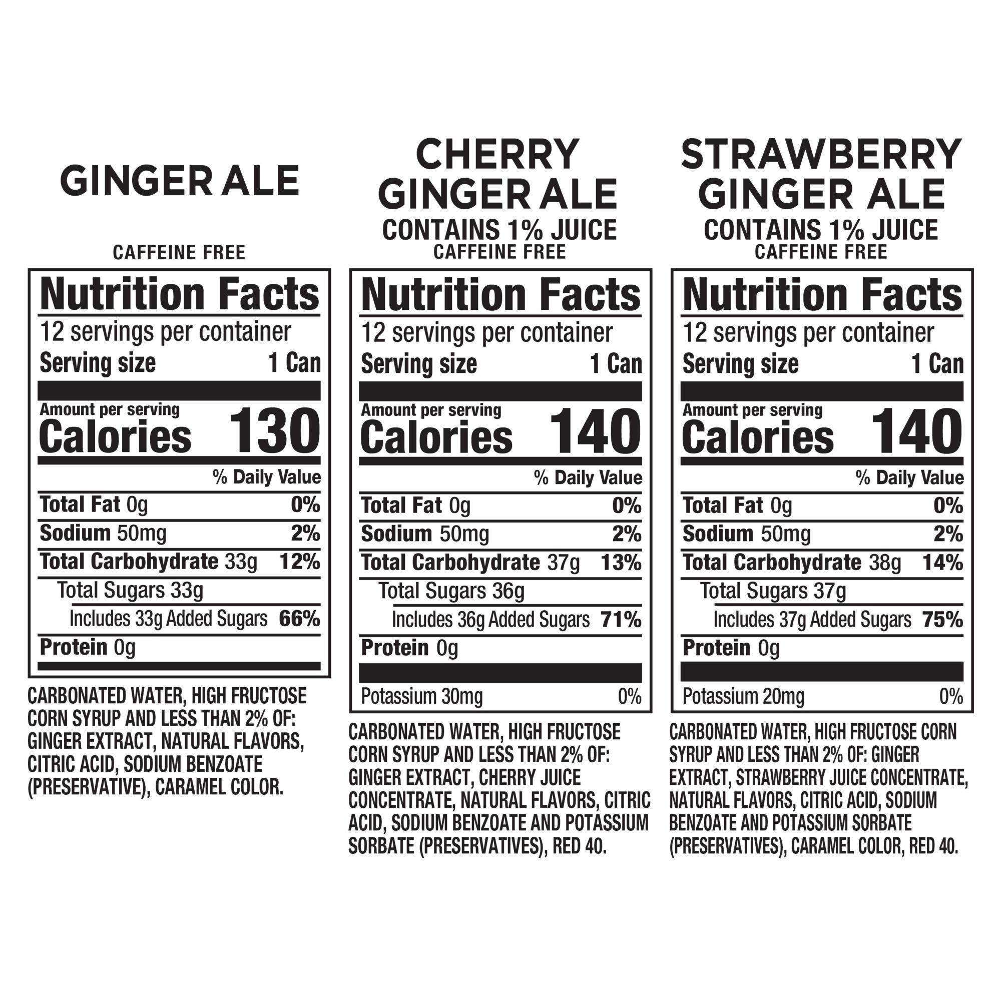 Ingredients: Ginger Ale: Carbonated Water, High Fructose Corn Syrup And Less Than 2% Of: Ginger Extract, Natural Flavors, Citric Acid, Sodium Benzoate (Preservative), Caramel Color. Cherry Ginger Ale: Carbonated Water, High Fructose Corn Syrup And Less Than 2% Of: Ginger Extract, Cherry Juice Concentrate, Natural Flavors, Citric Acid, Sodium Benzoate And Potassium Sorbate (Preservatives), Red 40. Strawberry Ginger Ale: Carbonated Water, High Fructose Corn Syrup And Less Than 2% Of: Ginger Extract, Strawerry Juice Concentrate, Natural Flavors, Citric Acid, Sodium Benzoate And Potassium Sorbate (Preservatives), Caramel Color, Red 40.
