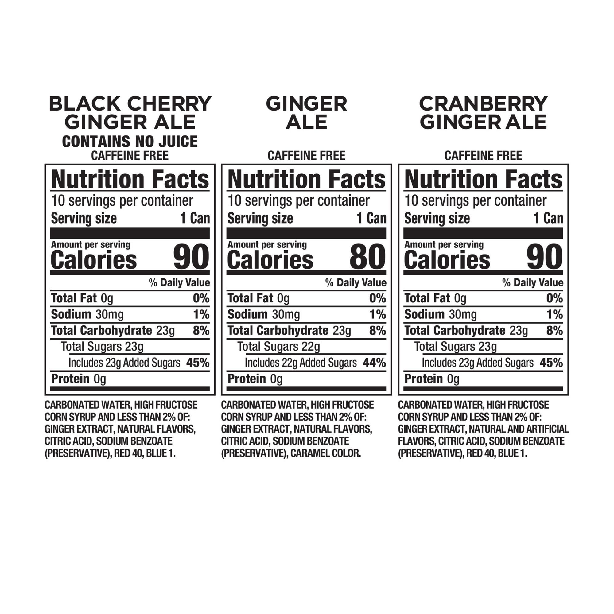Ingredients: Black Cherry Ginger Ale: Carbonated Water, High Fructose Corn Syrup and Less Than 2% of Ginger Extract, Natural Flavors, Citric Acid, Sodium Benzonate (Preservative), Red 40, Blue 1. Ginger Ale: Carbonated Water, High Fructose Corn Syrup and Less Than 2% of Ginger Extract, Natural Flavors, Citric Acid, Sodium Benzonate (Preservative), Caramel Color. Cranberry Ginger Ale: Carbonated Water, High Fructose Corn Syrup and Less Than 2% of Ginger Extract, Natural and Artificial Flavors, Citric Acid, Sodium Benzonate (Preservative), Red 40, Blue 1.