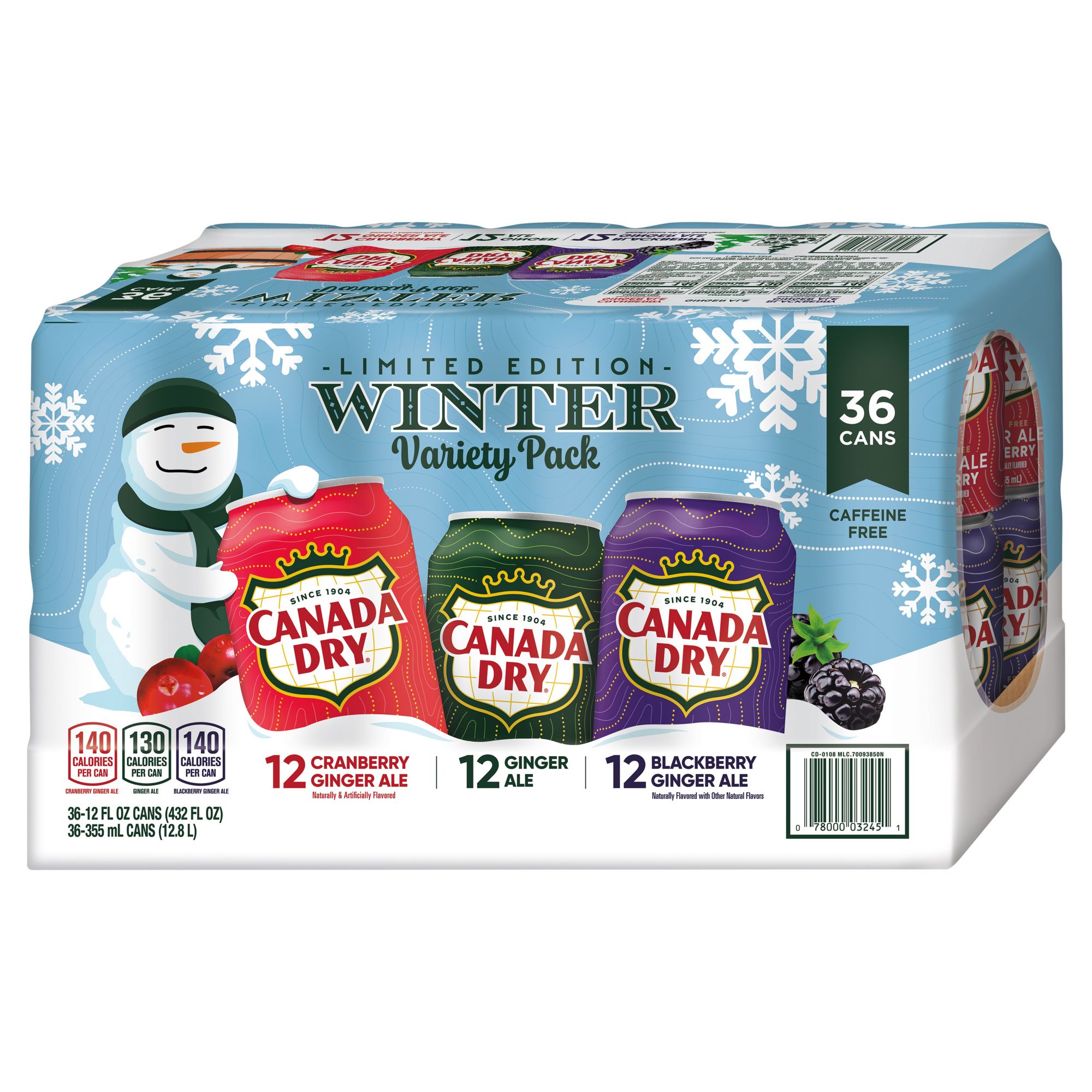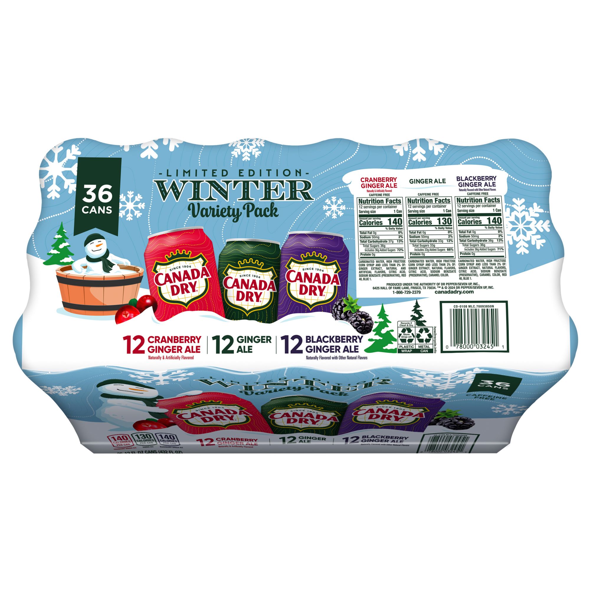 The Canada Dry Ginger Ale Winter Variety Pack features a selection of three flavors, including ginger ale, cranberry ginger ale and blackberry ginger ale. Whether you enjoy it straight from the can or use it as a mixer for your favorite cocktail, you'll relish the refreshing taste of both classic and berry-enhanced varieties.