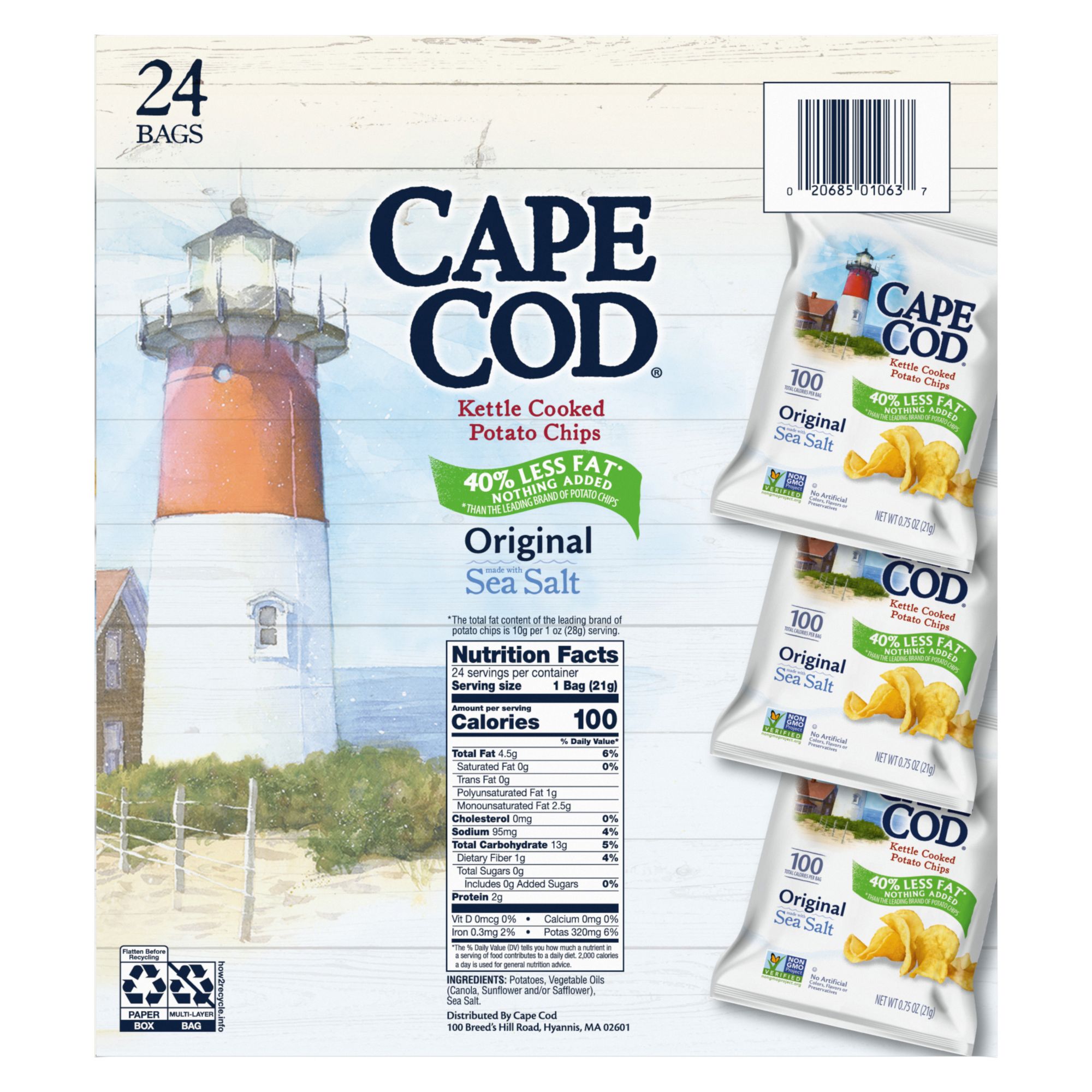 Cape Cod Less Fat Original Kettle Chips can’t stop at perfection. Cape Cod chips are already a classic thanks to their distinctive crunch and flavor. With this variety, you get all the great flavor as our regular chips, but with 40% less fat than the leading brand of potato chips because extra spin in the kettle removes excess oil for less fat, with nothing added. Cape Cod takes choice potatoes and slices them thick, cooking them in custom kettles, one small batch at a time Then they sprinkle them with sea salt. Unique shapes and folds mean you always get one-of-a-kind chips, but they all share that distinctive flavor and wonderful Cape Cod crunch. These delicious, kettle chips make a perfect lunchtime side and fit any snacking occasion. With 24 single-serve snack bags, you can enjoy them at home or on the go. These potato chips are famous for their high quality and remarkable flavor, so be sure to try all the traditional and distinctly unique varieties. Every distinctive chip somehow feels like an invitation to come savor everything that’s special about Cape Cod Kettle Chips.