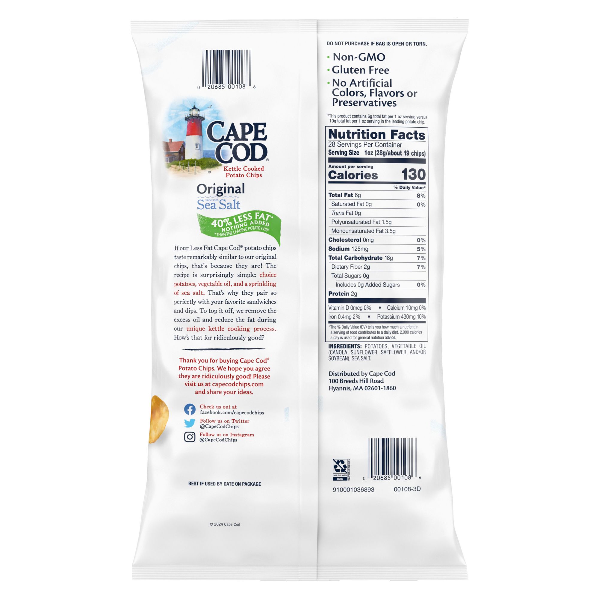 Cape Cod Less Fat Chips are just as delicious as their classic Original flavor chip. That’s because they’re made with the same simple ingredients: potatoes, oil and salt. They just get an extra spin in the kettle to remove excess oil for 40% less fat than the leading brand of potato chip, with nothing added. There's no need for you to sacrifice one ounce of satisfaction. Cape Cod Potato Chips are known for their quality taste, hearty crunch and distinctly remarkable flavors. Available in many traditional and unique varieties, Cape Cod Potato Chips maintain the tradition of using high quality ingredients in all its snacks.