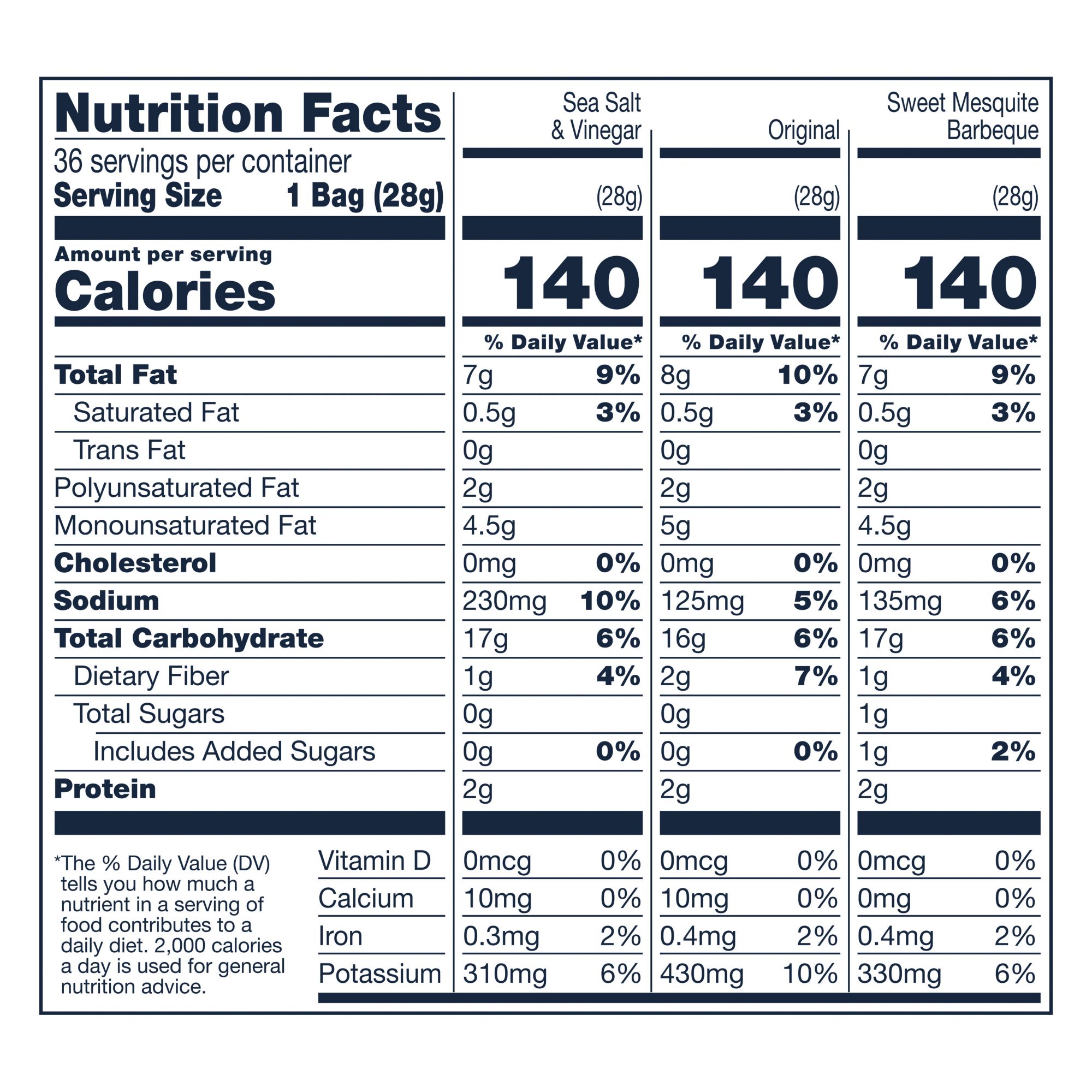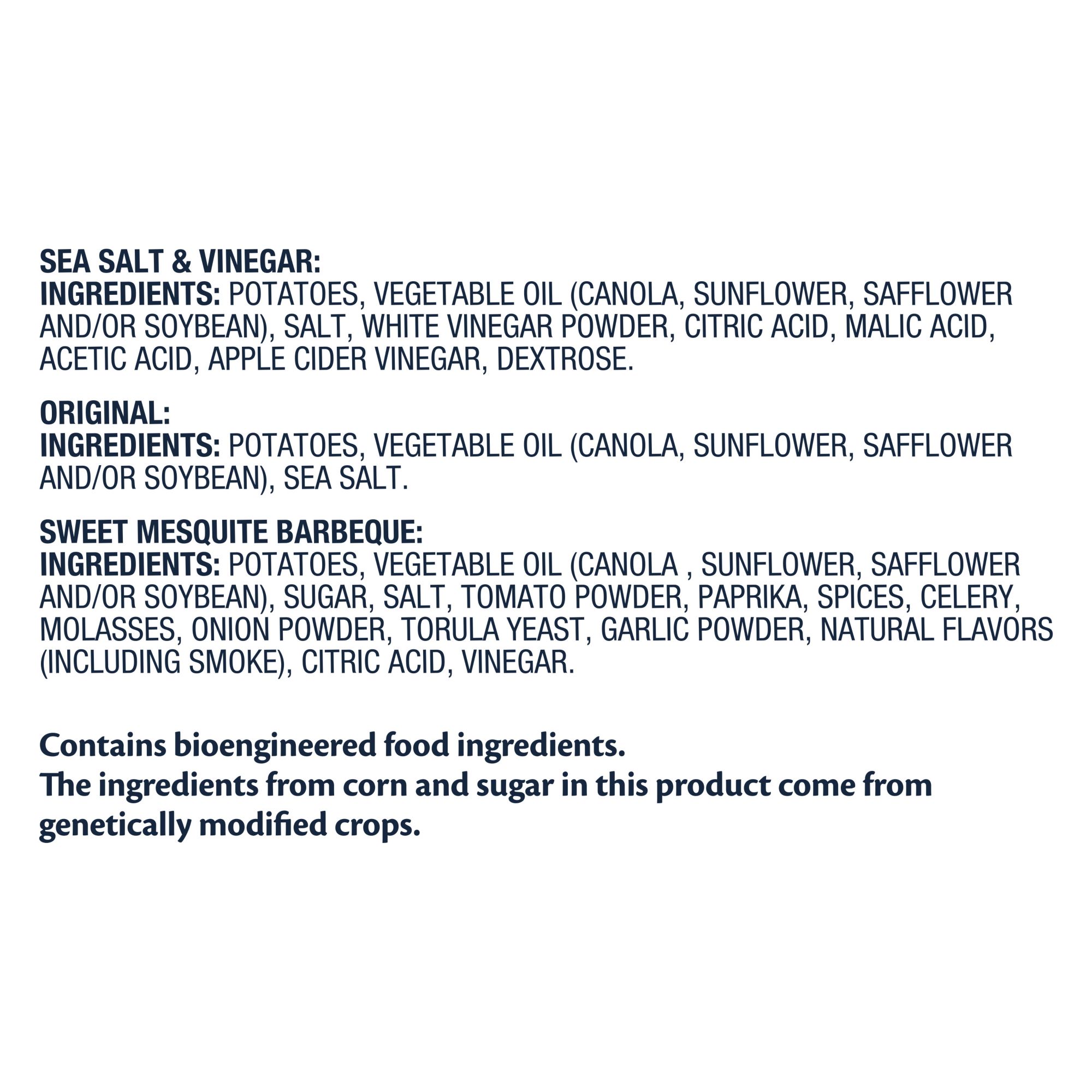 Ingredients Original Made With Sea Salt Ingredients: Potatoes, Vegetable Oils (Canola, Sunflower And/or Safflower), Sea Salt. Sea Salt & Vinegar Ingredients: Potatoes, Vegetable Oils (Canola, Sunflower And/or Safflower), Salt, White Vinegar Powder, Citric Acid, Malic Acid, Acetic Acid, Apple Cider Vinegar, Dextrose. Sweet Mesquite Bbq Ingredients: Potatoes, Vegetable Oils (Canola, Sunflower And/or Safflower), Sugar, Salt, Paprika, Tomato Powder, Molasses, Onion Powder, Spices, Citric Acid, Natural Flavor (Including Smoke), Garlic Powder, Vinegar, Torula Yeast.