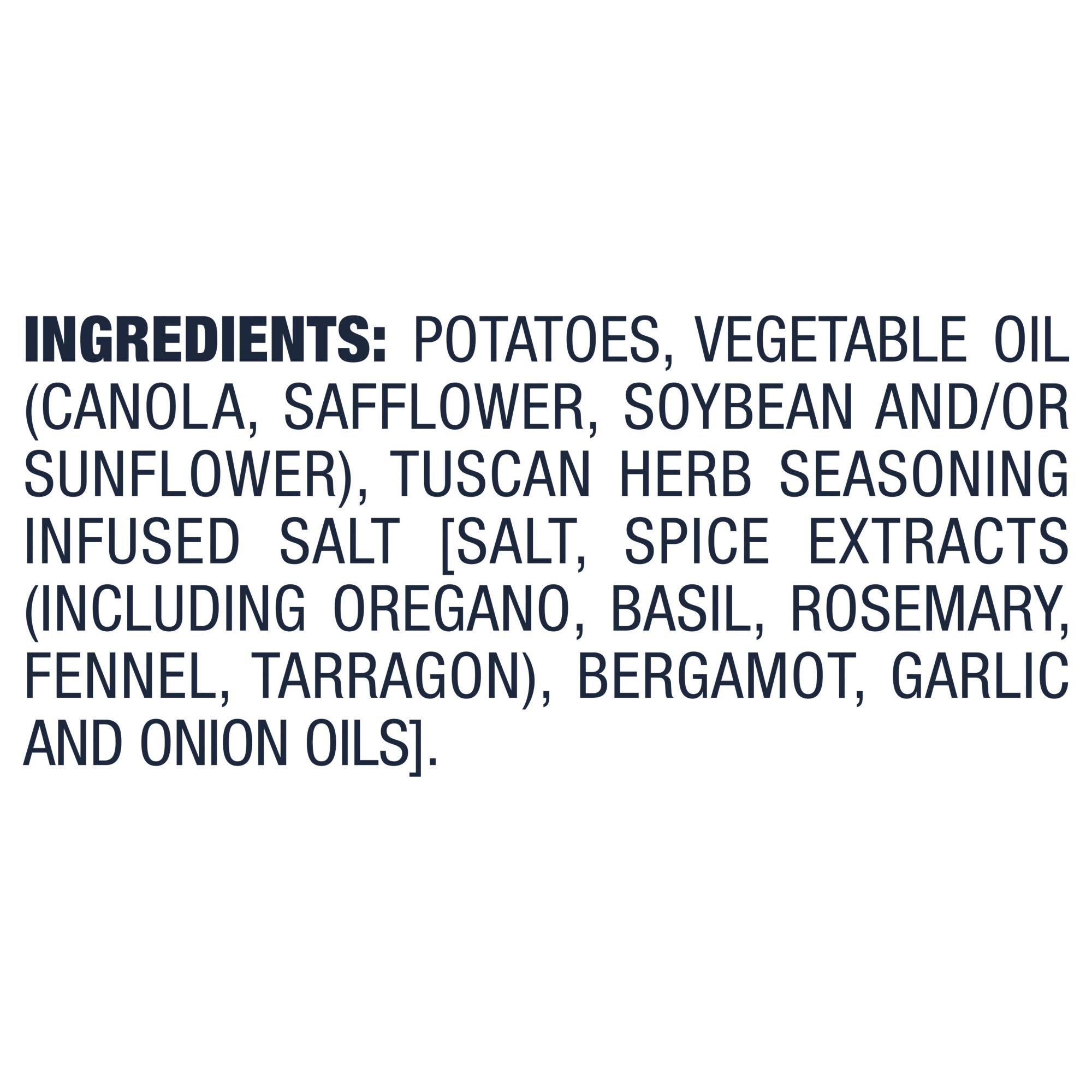 Ingredients: Potatoes, Vegetable Oil (Canola, Safflower, Soybean And/or Sunflower), Tuscan Herb Seasoning Infused Salt [Salt, Spice Extracts (Including Oregano, Basil, Rosemary, Fennel, Tarragon), Bergamot, Garlic And Onion Oils).