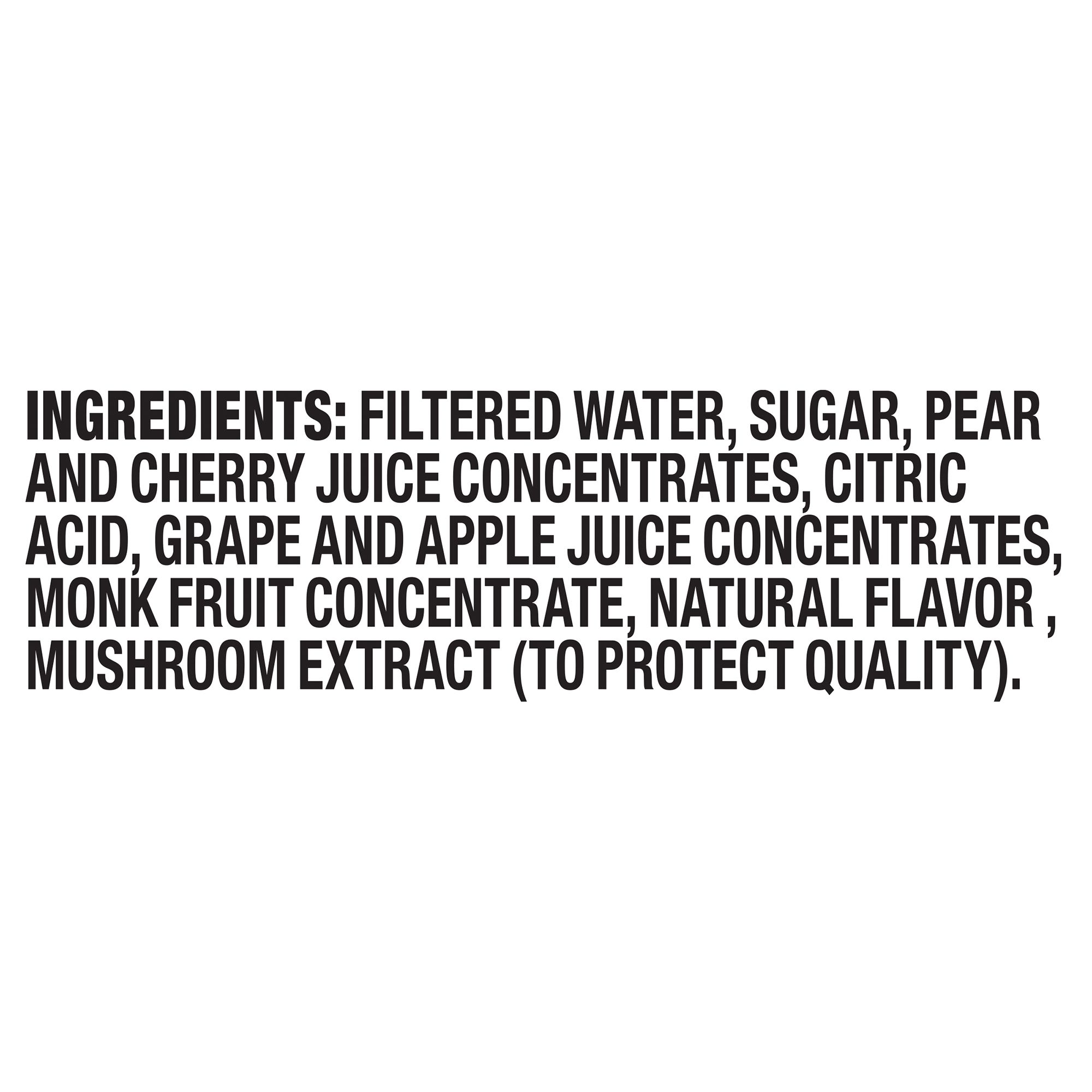 Ingredients: Filtered Water, Sugar, Pear And Cherry Juice Concentrates, Citric Acid, Grape And Apple Juice Concentrates, Monk Fruit Concentrate, Natural Flavor , Mushroom Extract (To Protect Quality).
