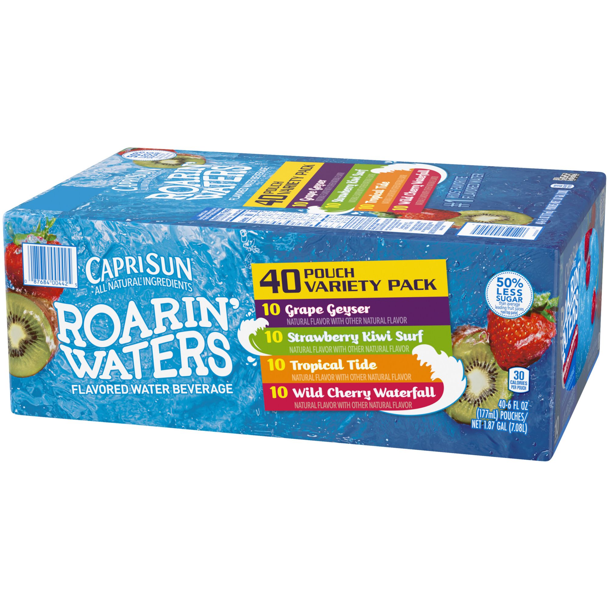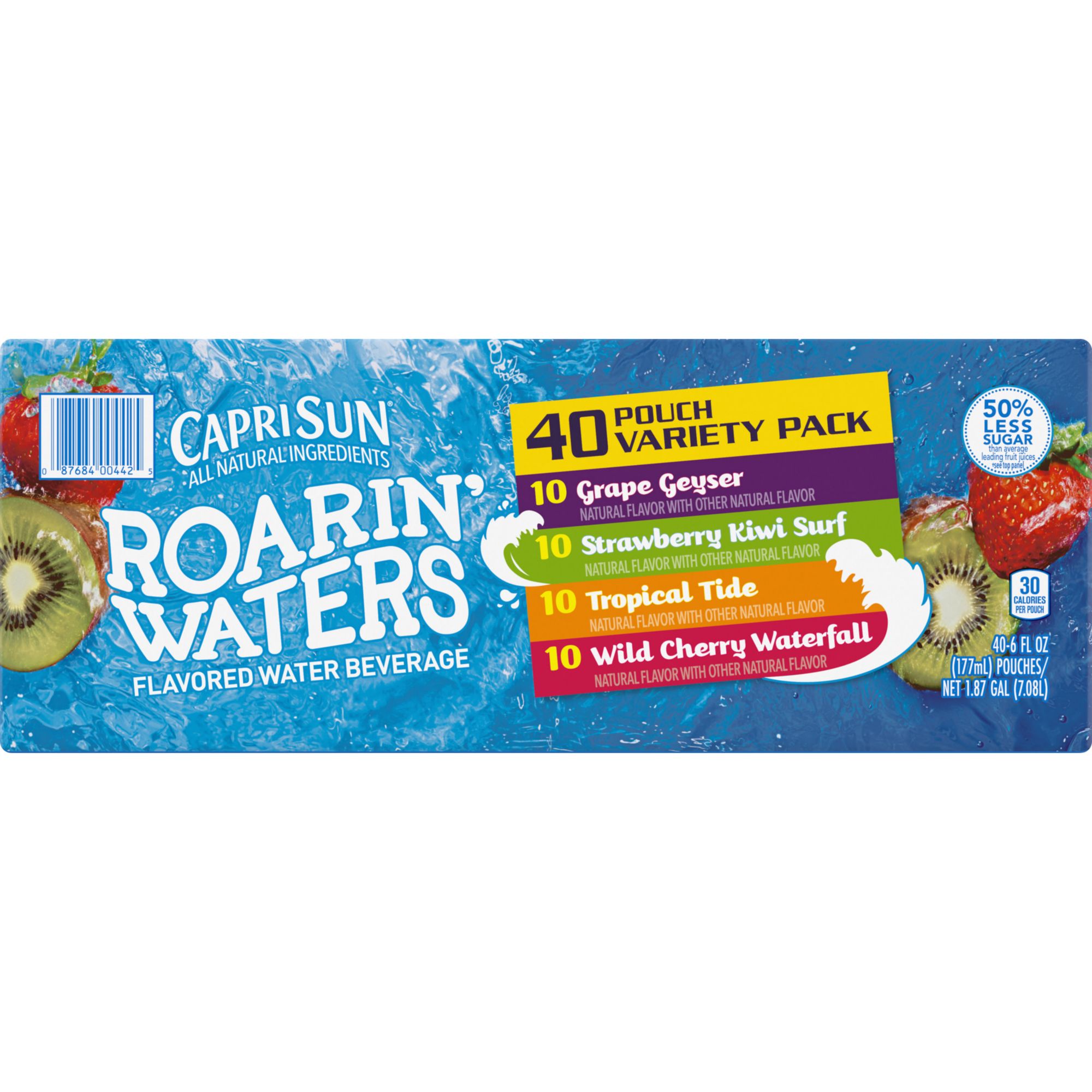 Capri Sun Roarin' Waters Naturally Flavored Beverage makes hydration easy and flavorful, with a refreshing ready to drink beverage you can take anywhere. Natural mixed fruit flavor adds a fruity touch to thirst-quenching water. This mixed fruit flavored water for kids is made without artificial colors, preservatives or flavors, so you can feel good about serving it to your family. This variety pack includes Grape Geyser, Strawberry Kiwi Surf, Tropical Tide and Wild Cherry Waterfall flavors. Each drink pouch contains 50% less sugar than the average leading fruit juices (per 6 ounces, this product has 8 grams of sugar; fruit juices 20 grams of sugar). Capri Sun makes it easy to take this berry drink along on all your adventures.