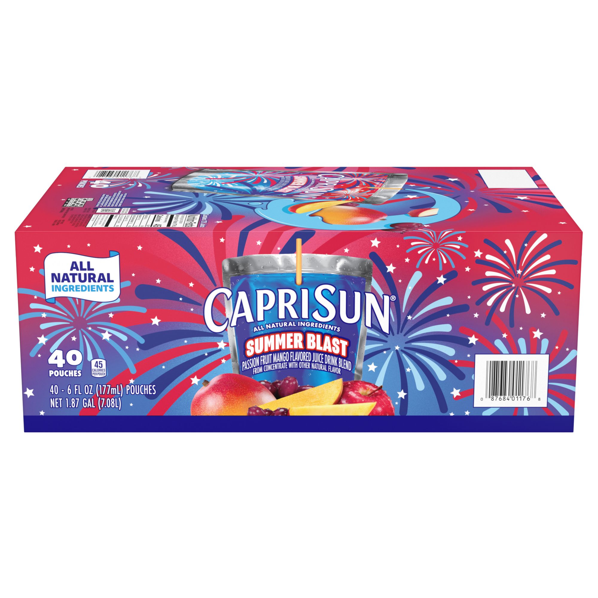 Nothing says summer like Capri Sun. Capri Sun Summer Blast flavored pouches deliver the perfect fruity summer sip. Each delicious fruity-flavored passion fruit mango drink pouch is ideal for any summer adventure. Made with all natural ingredients, Capri Sun juice drink blend contains no artificial preservatives, colors, flavors or high-fructose corn syrup. Packaged in individual pouches decorated with fun red, white and blue fireworks for the summer holidays, the convenient pouches are kid-friendly and perfect for on-the-go lunches or snacks. Each pack contains 40, 6-ounce pouches of Summer Blast passion fruit mango drink. Grab a Capri Sun pouch and make your summer awesome!