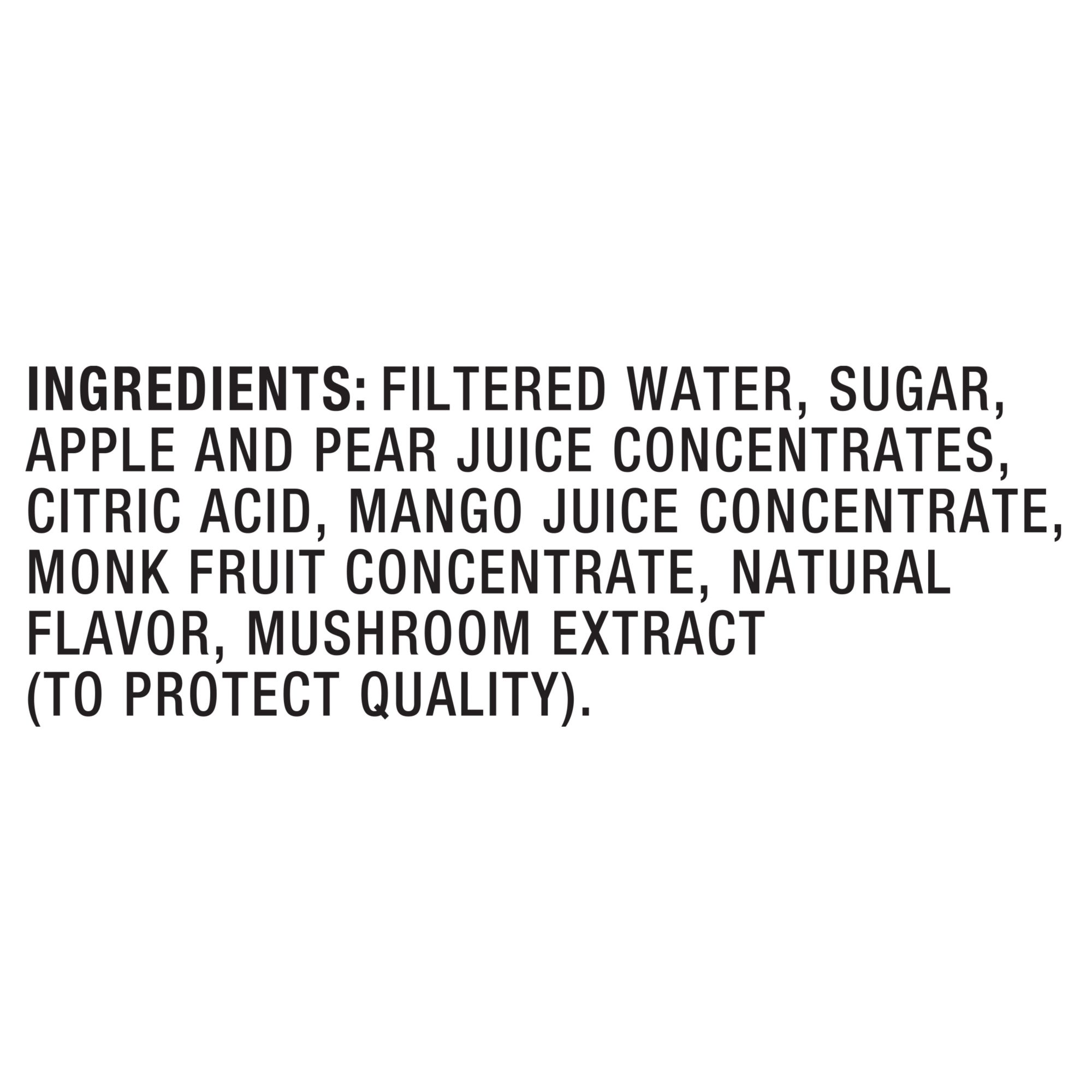 Ingredients: Filtered Water, Sugar, Apple And Pear Juice Concentrates, Citric Acid, Mango Juice Concentrate, Monk Fruit Concentrate, Natural Flavor, Mushroom Extract (To Protect Quality).