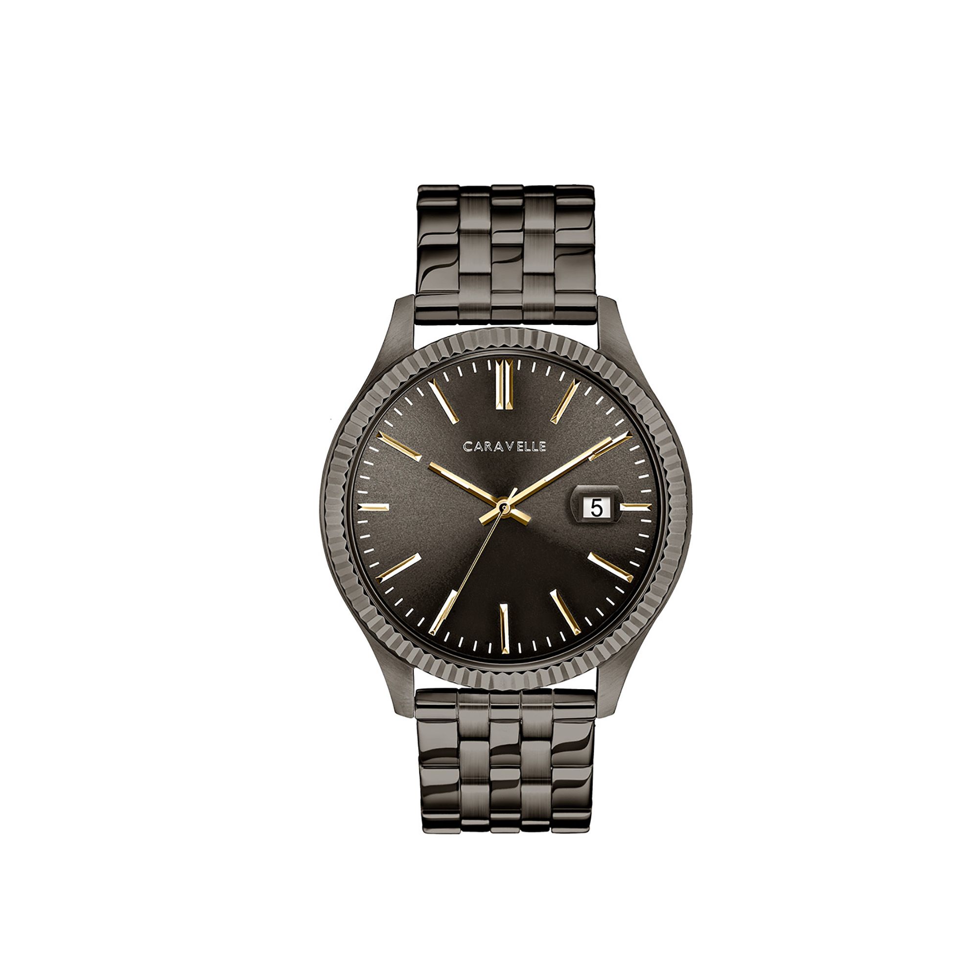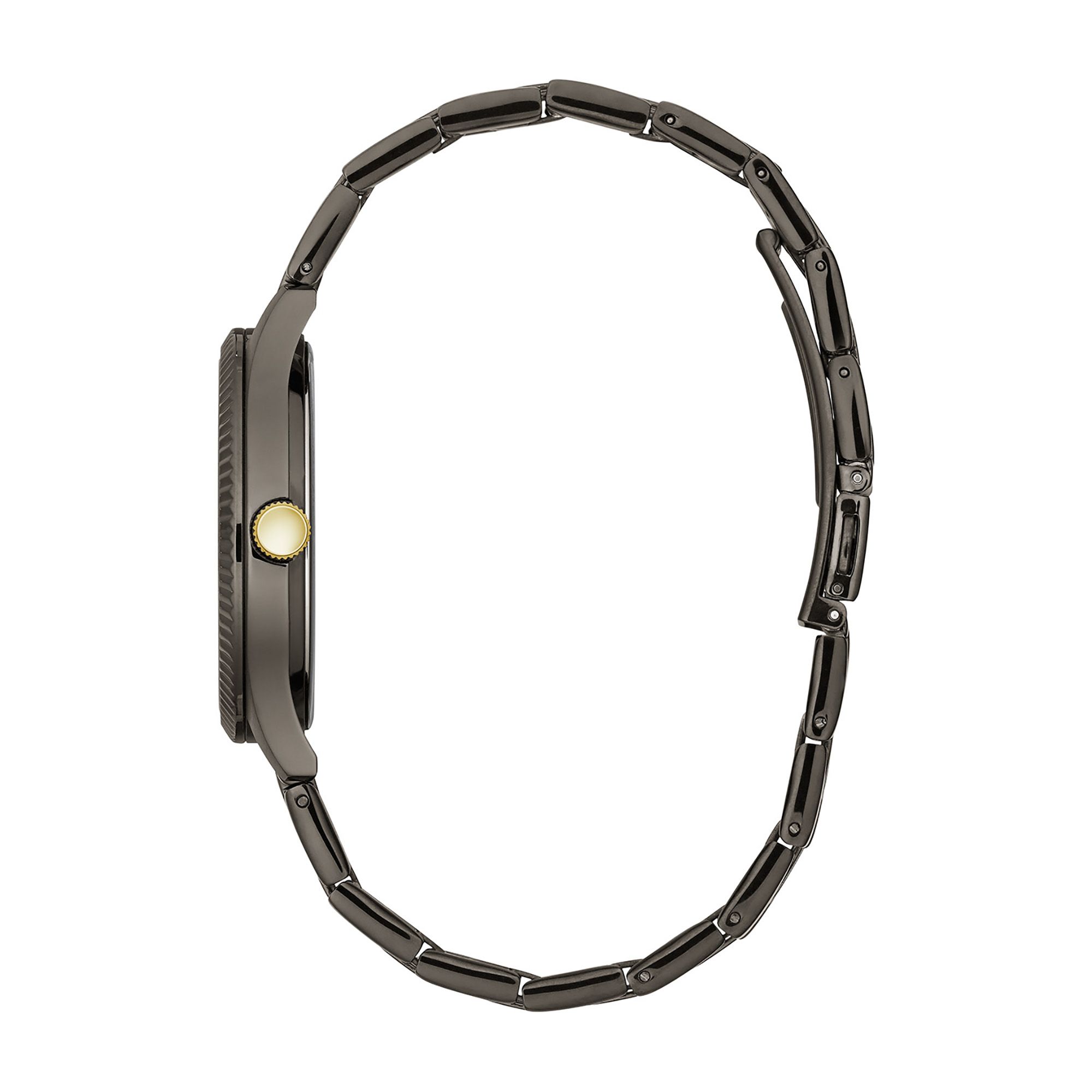 Sleek and streamlined in stainless steel with gunmetal finish, gold-finish crown, gray sunray dial, luminous hands, date feature, and double-press fold-over clasp.