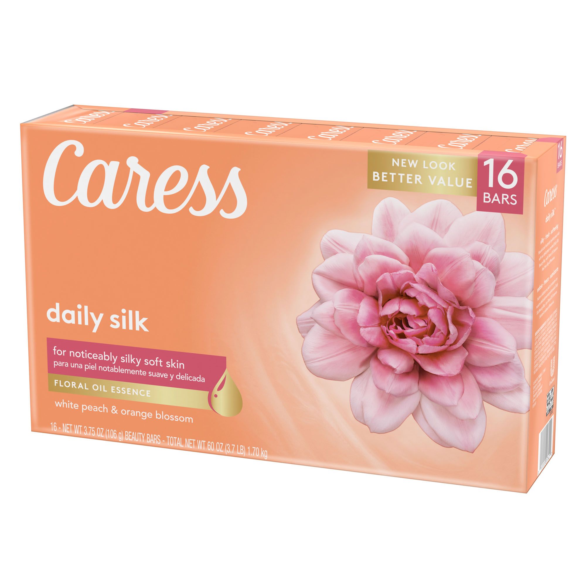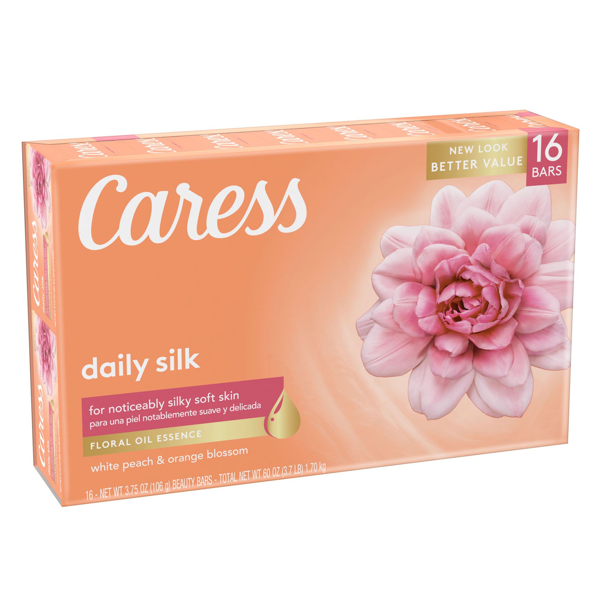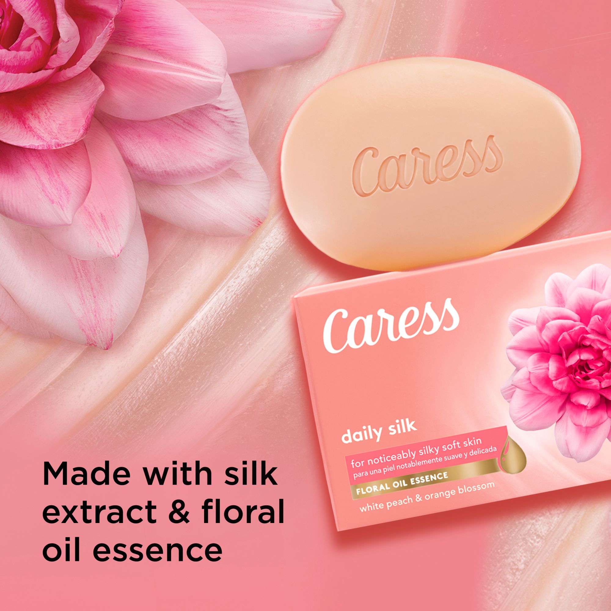 Spoil yourself with the pure decadence of Caress Daily Silk, a silkening Beauty Bar infused with the scent of lush white peach and orange blossom that will transform your shower into an everyday retreat. The freshness of the white peach adds a crisp zest to the fragrance that brings out the luscious sweetness of silk blossom. At the base of this Caress fine fragrance Beauty Bar for women sits sandalwood and musk – rich scents that both round out and soften the scent, leaving you with delicately scented skin, all day long. Caress Daily Silk is an indulgent women's body soap that blends rich, luxurious lather with expertly crafted fine fragrance. It is a bar soap that gently cleanses your skin to leave it delicately fragrant, beautifully soft. The creamy cleanser for women gently pampers your skin for a silky soft touch, while a captivating blend of exotic aromas gently cloaks you after every shower. Ready to experience the multi-sensory world of Caress? Discover our full range of body washes and Beauty Bars. Find your favorite Beauty Bar or body wash and transform every shower into a “me moment”. At Caress, we believe taking a moment for yourself should happen every day. When you can awaken your senses and connect with yourself, you’ll feel renewed and ready to go after your dreams.