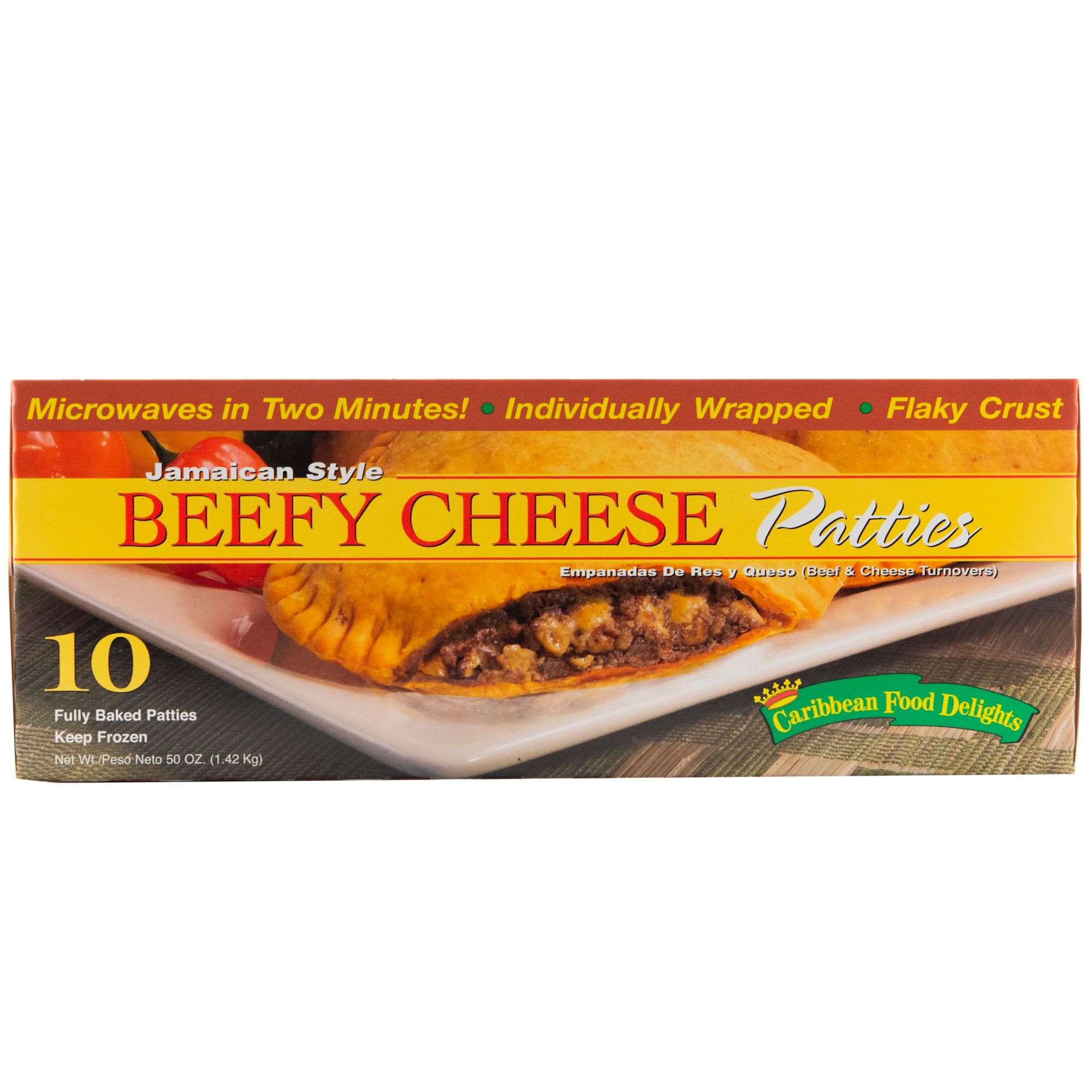 Caribbean Food Delights Jamaican Style Beefy Cheese Patties are made with ground beef and real cheddar cheese. Each patty is wrapped with a flaky crust for easy hand-held snacking.