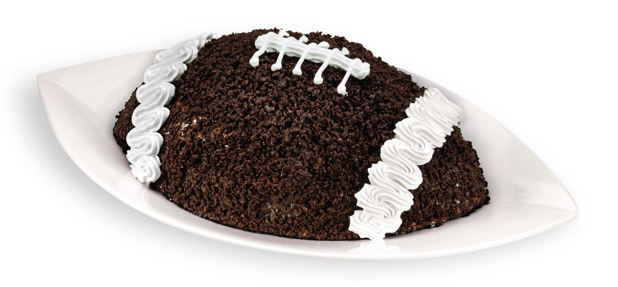 Carvel's football-shaped ice cream cake is made with layers of vanilla and chocolate ice cream, chocolate crunchies and fresh whipped frosting.