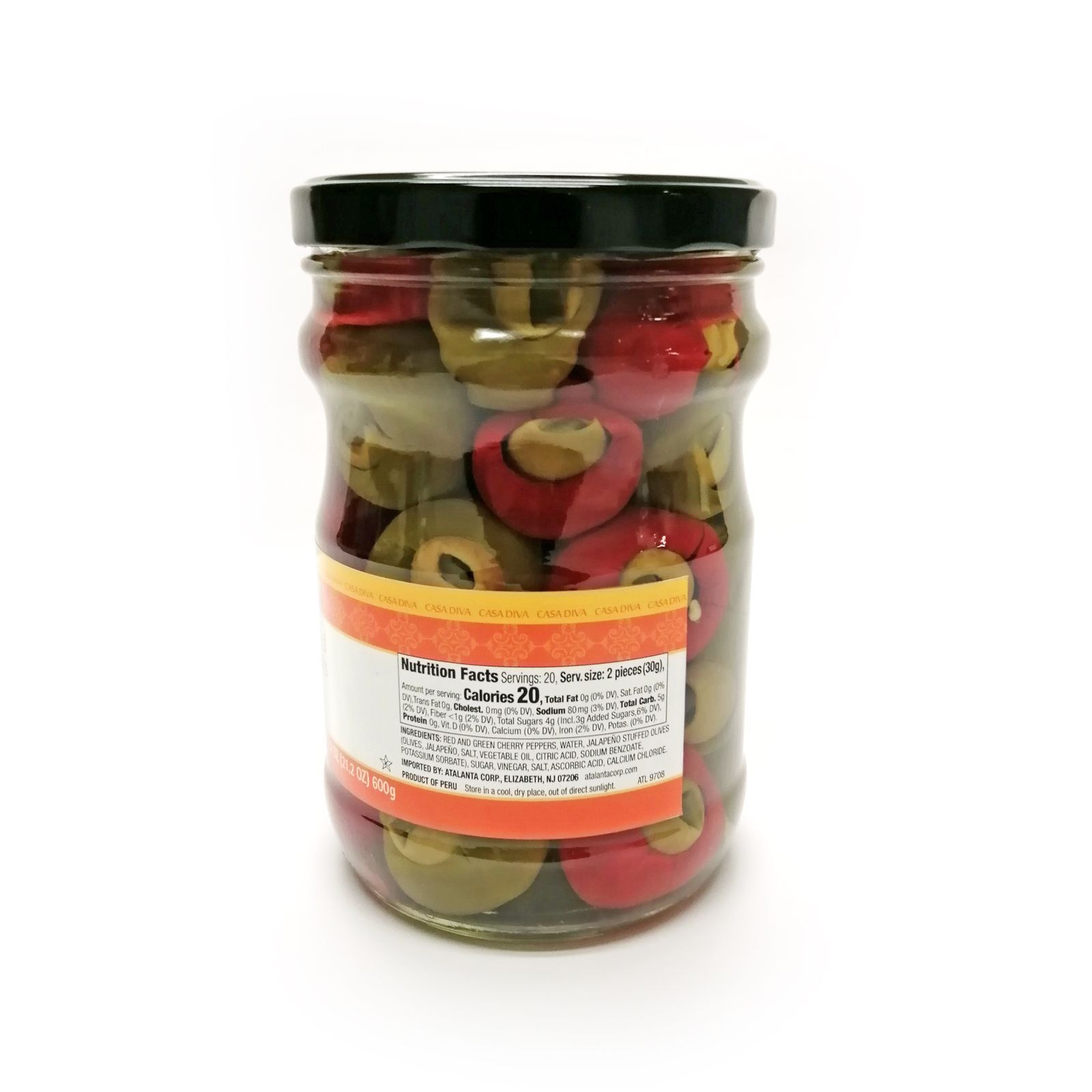Ingredients: red and green cherry peppers, water, jalapeño stuffed olives (olives, jalapeño, salt, vegetable oil, citric acid, sodium benzoate, potassium sorbate), sugar, vinegar, salt, ascorbic acid, calcium chloride.