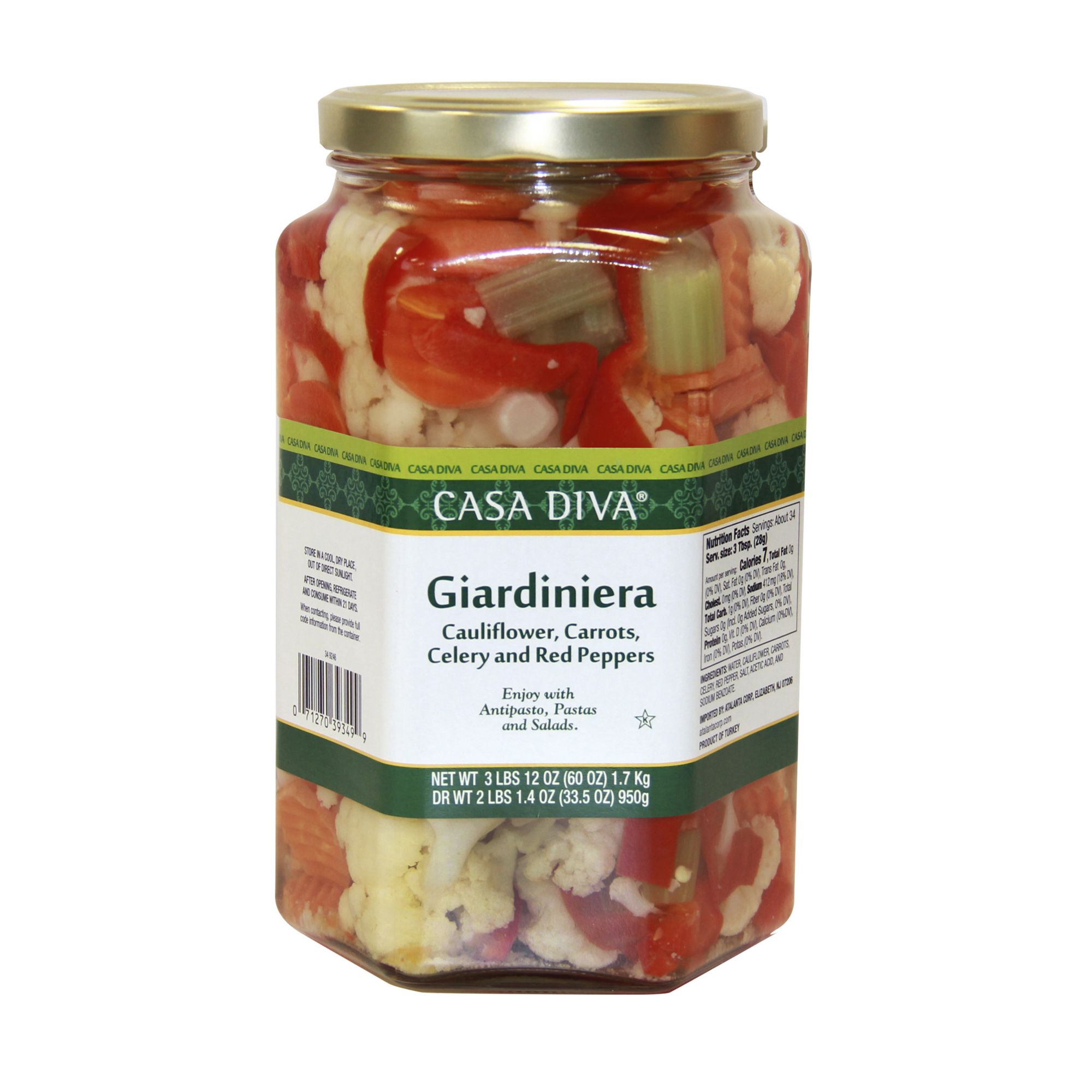 Add a burst of color to any dish with the convenience of this tasty giardiniera. Packed full of wholesome flavor and authentic taste. This giardiniera features a combination of mild cauliflower, carrots, celery, and red pepper strips. Similar to "chow chow," this Italian-style mix of vegetables is packed and preserved in vinegar to maintain freshness and flavor. Whichever way this flavorful blend is used, it's sure to make a welcome addition to your sandwich shop, Italian restaurant, or pizza shop. Giardiniera is commonly served with antipasto, salads, and pasta dishes. This healthy vegetable mixture is also great for tossing in pasta salads and sprinkling on vegetable pizzas.