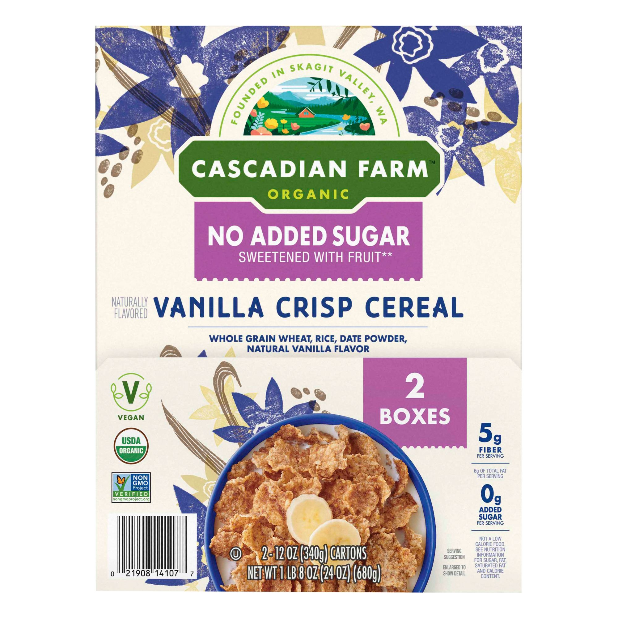 Cascadian Farm Organic Vanilla Crisp Cereal is loaded with whole grain wheat flakes, rice, and natural vanilla flavor. Cereal you can feel good about feeding your loved ones!
