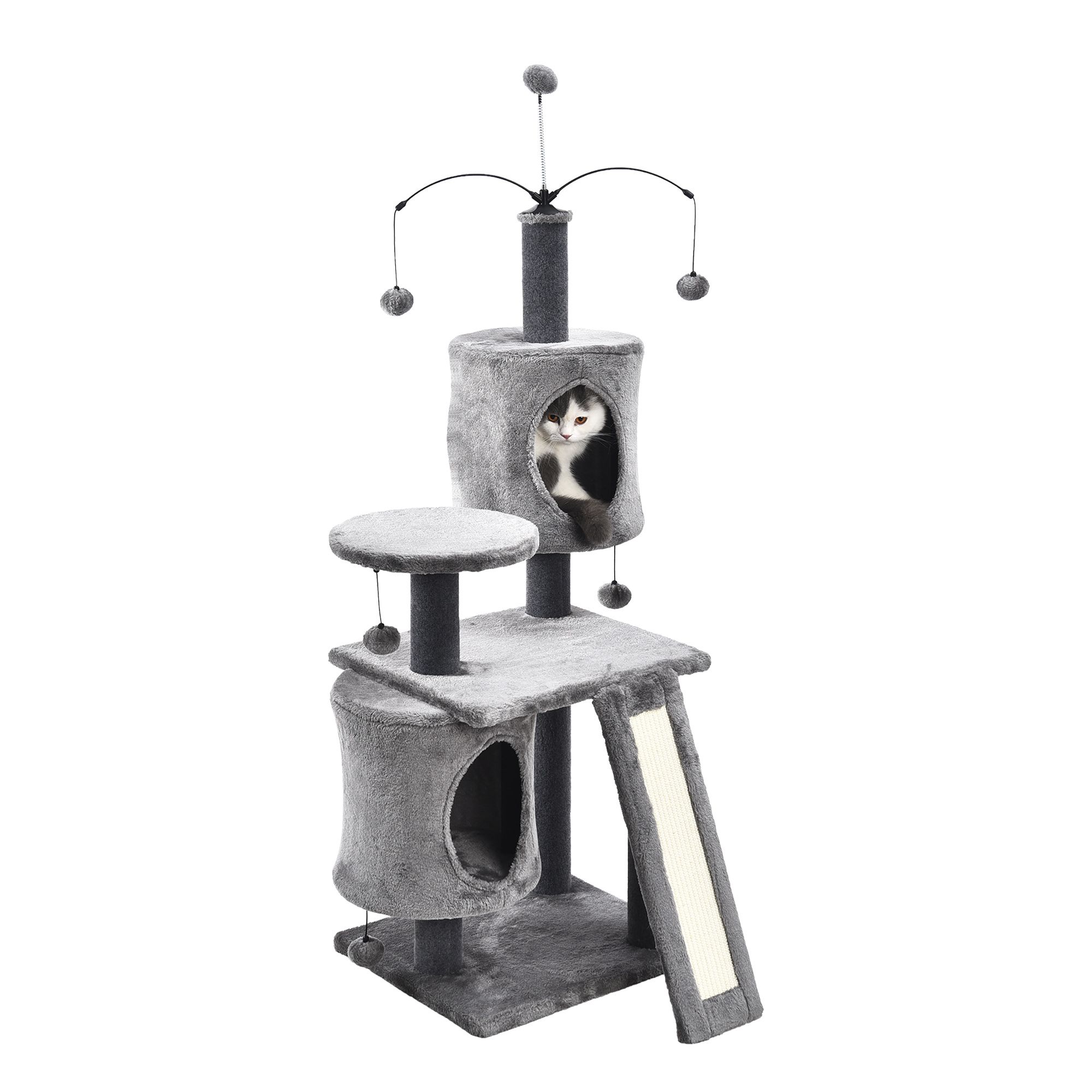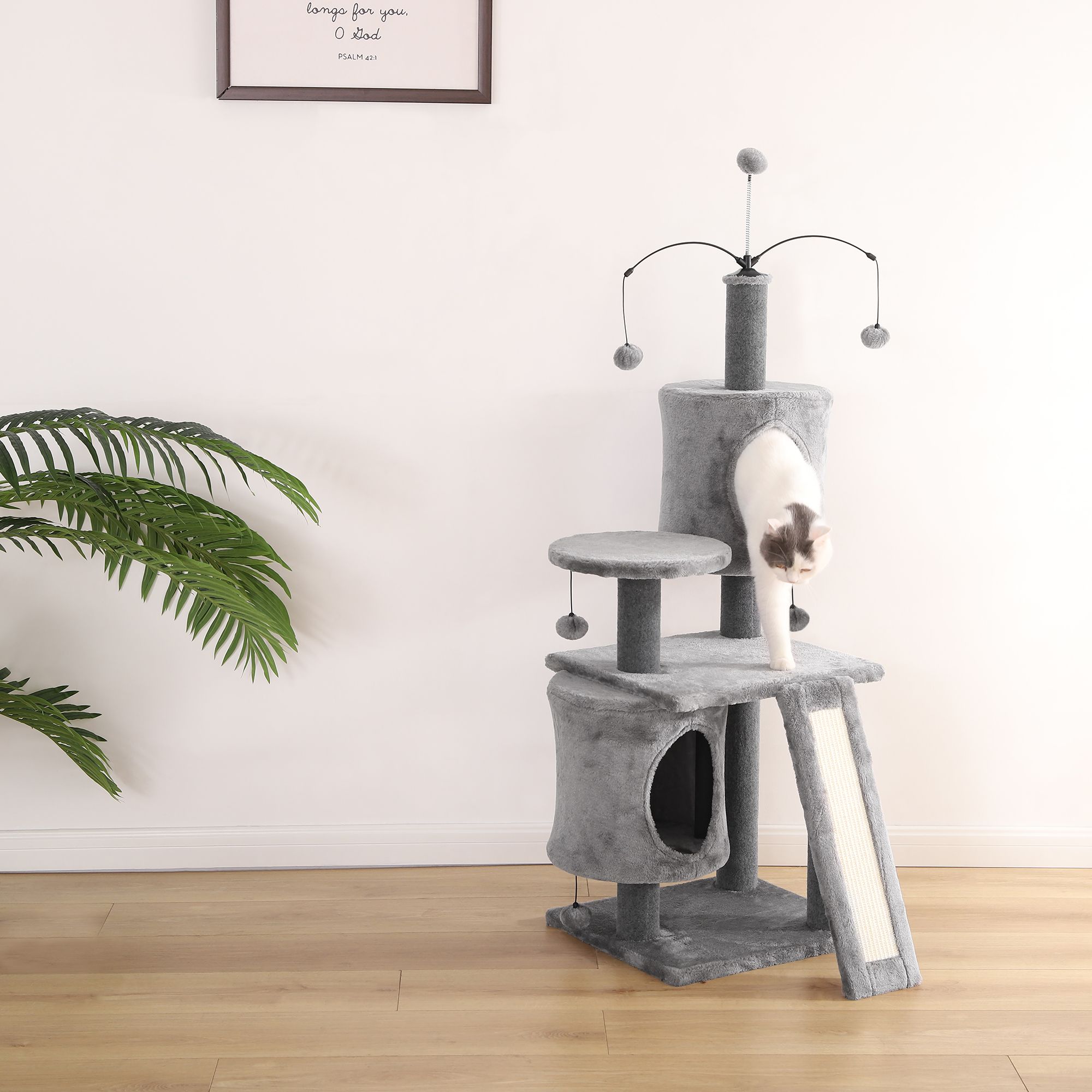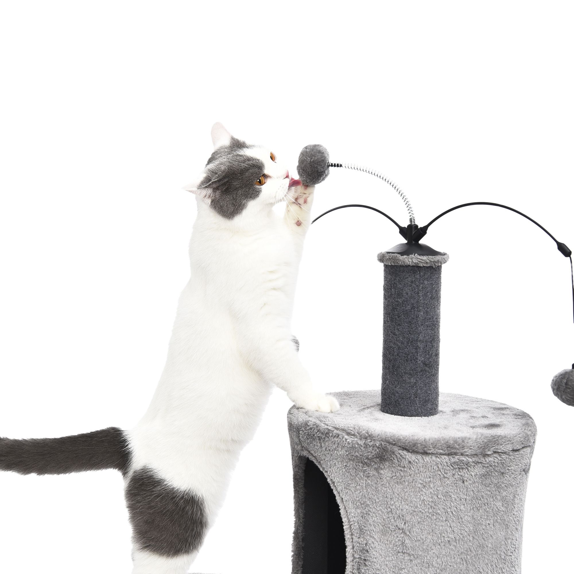 Unique design features Multiple platforms to give your feline plenty of space to lounge and play Toys will engage your feline to play and hunt Condo offers comfort, privacy, and a warm place to rest and sleep Durable, long-lasting construction Includes 53" cat condo duplex playset