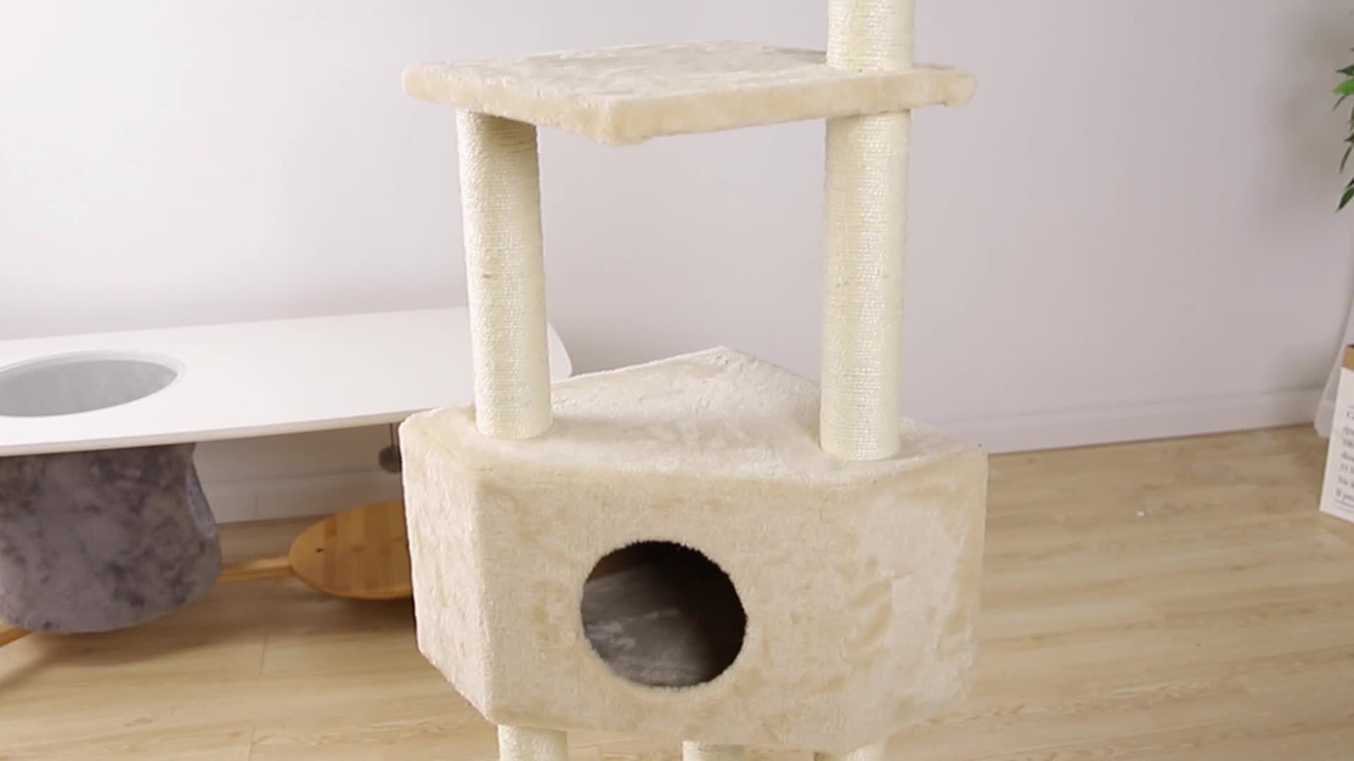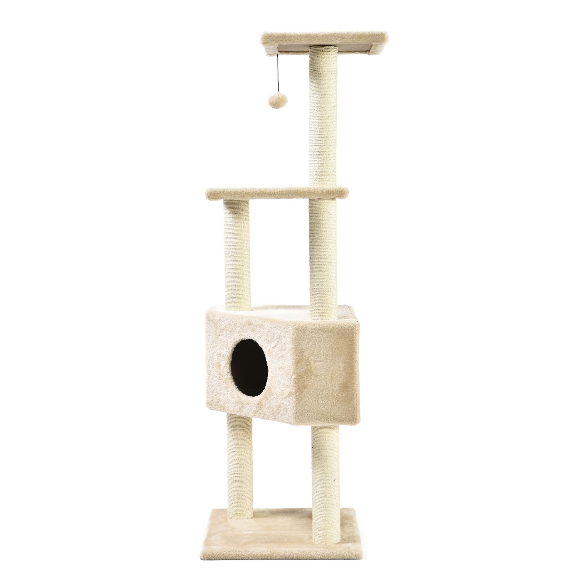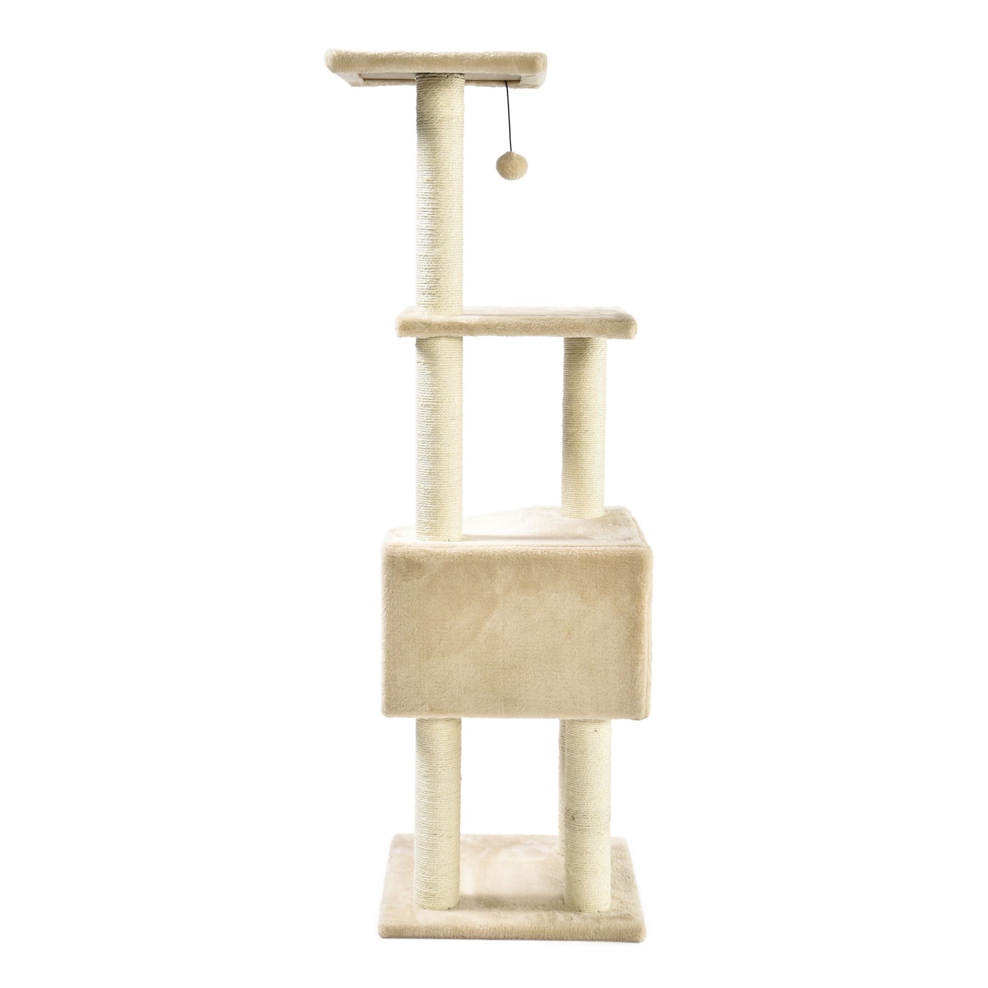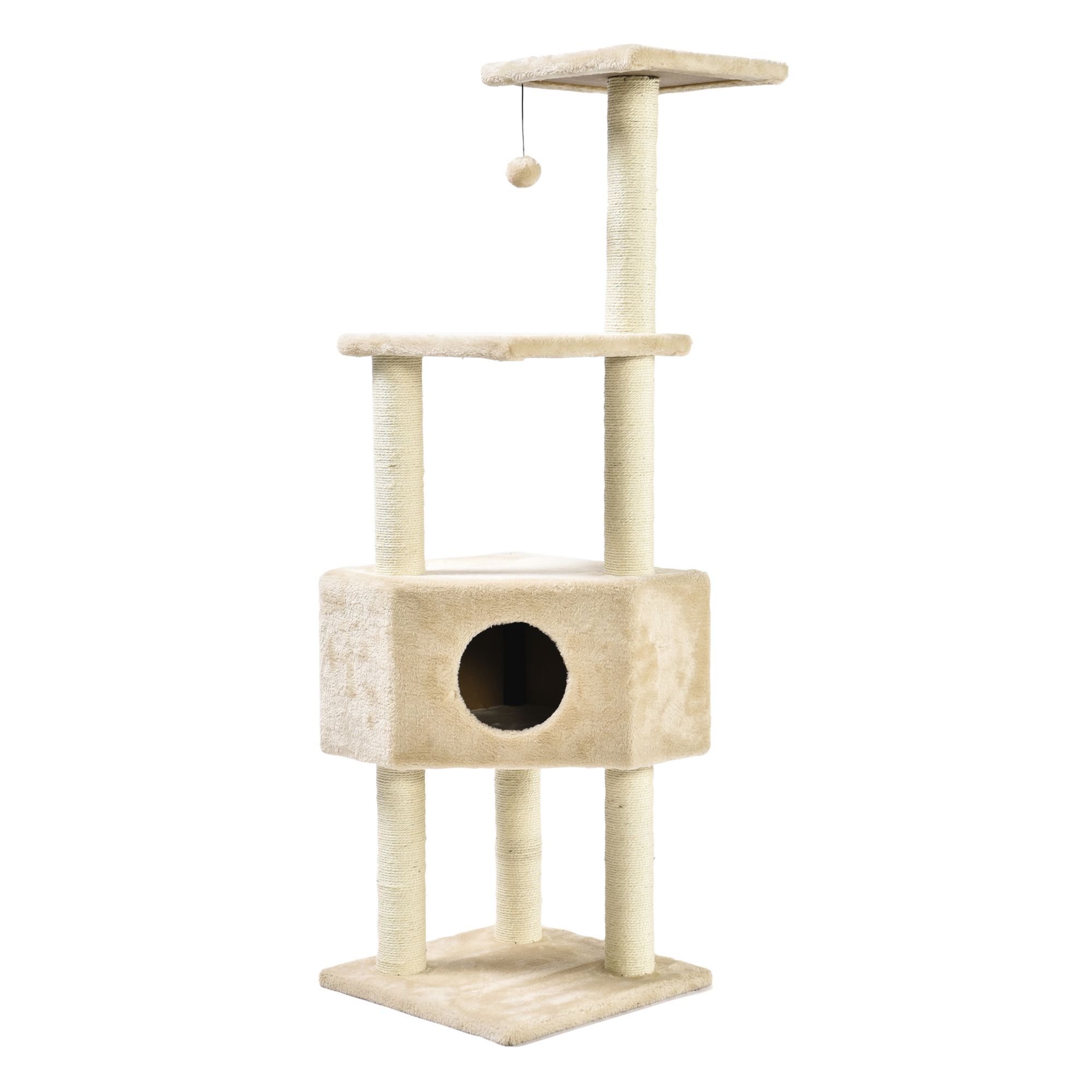 Fluffy ball for added fun Sturdy wooden construction for strength and stability. Covered in a soft, plush fabric Cats can climb, jump, play and groom their claws Includes 53" medium three-tier cat tree with a fluffy ball