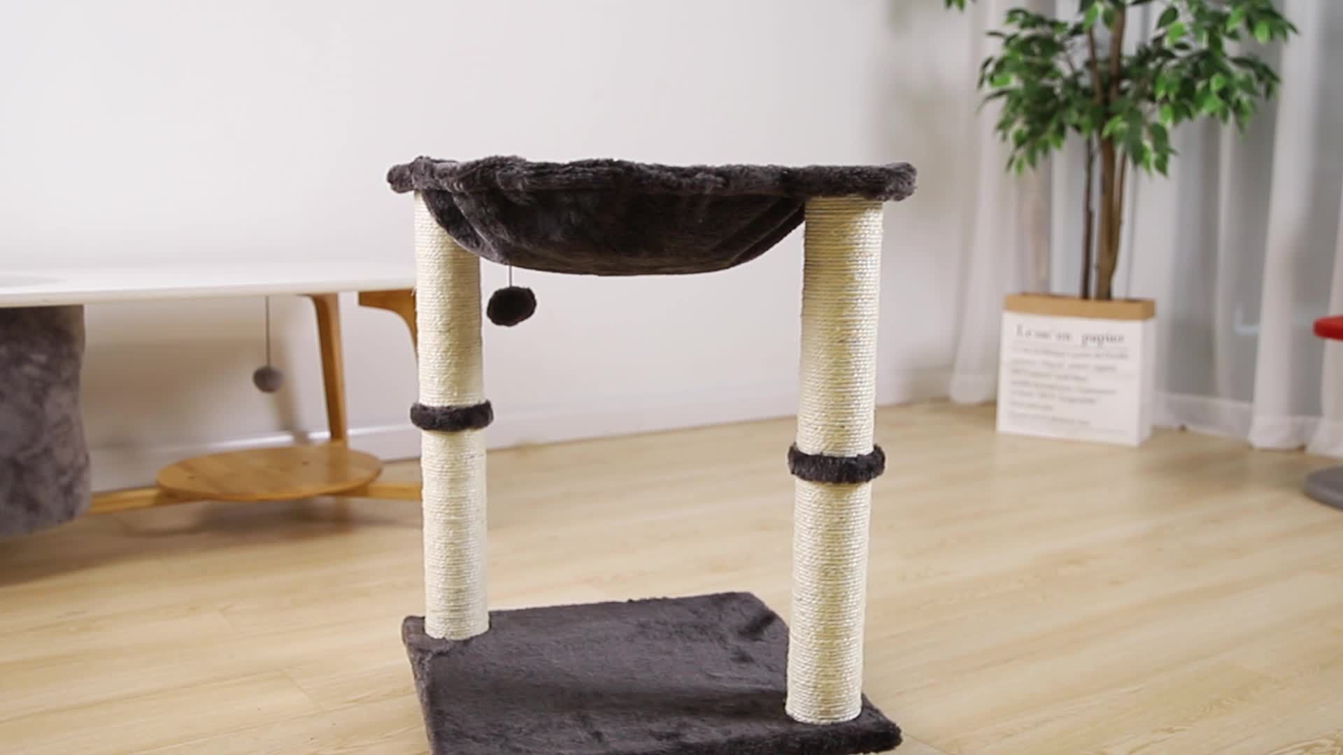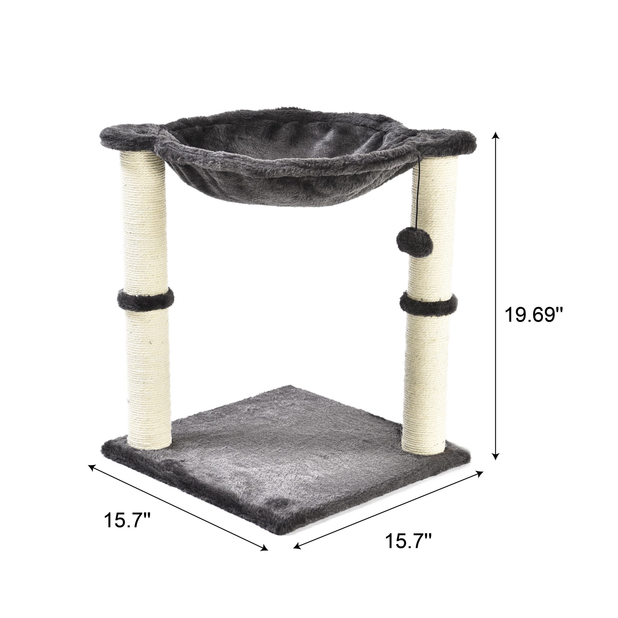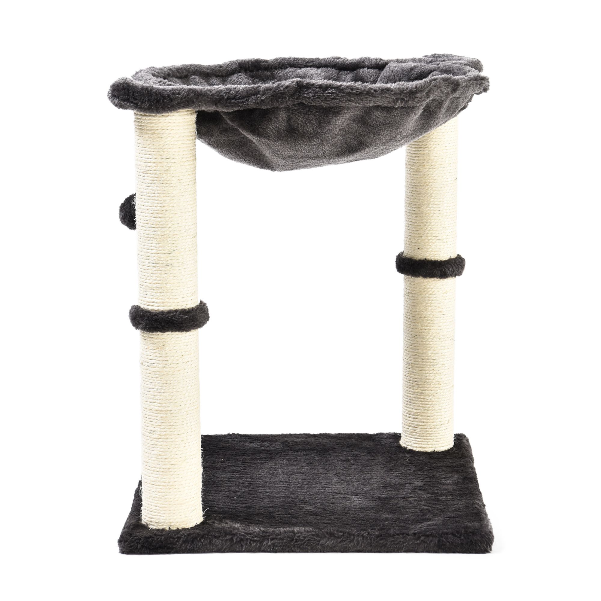 Elevated cat hammock with dual scratching post pillars Plush hammock provides a comfortable space for your cat to relax Natural jute fiber scratching posts help keep nails healthy Durable, long-lasting construction Helps to keep your cat from damaging carpets, furniture, curtains, and more Includes cat tree with hammock bed and scratching posts