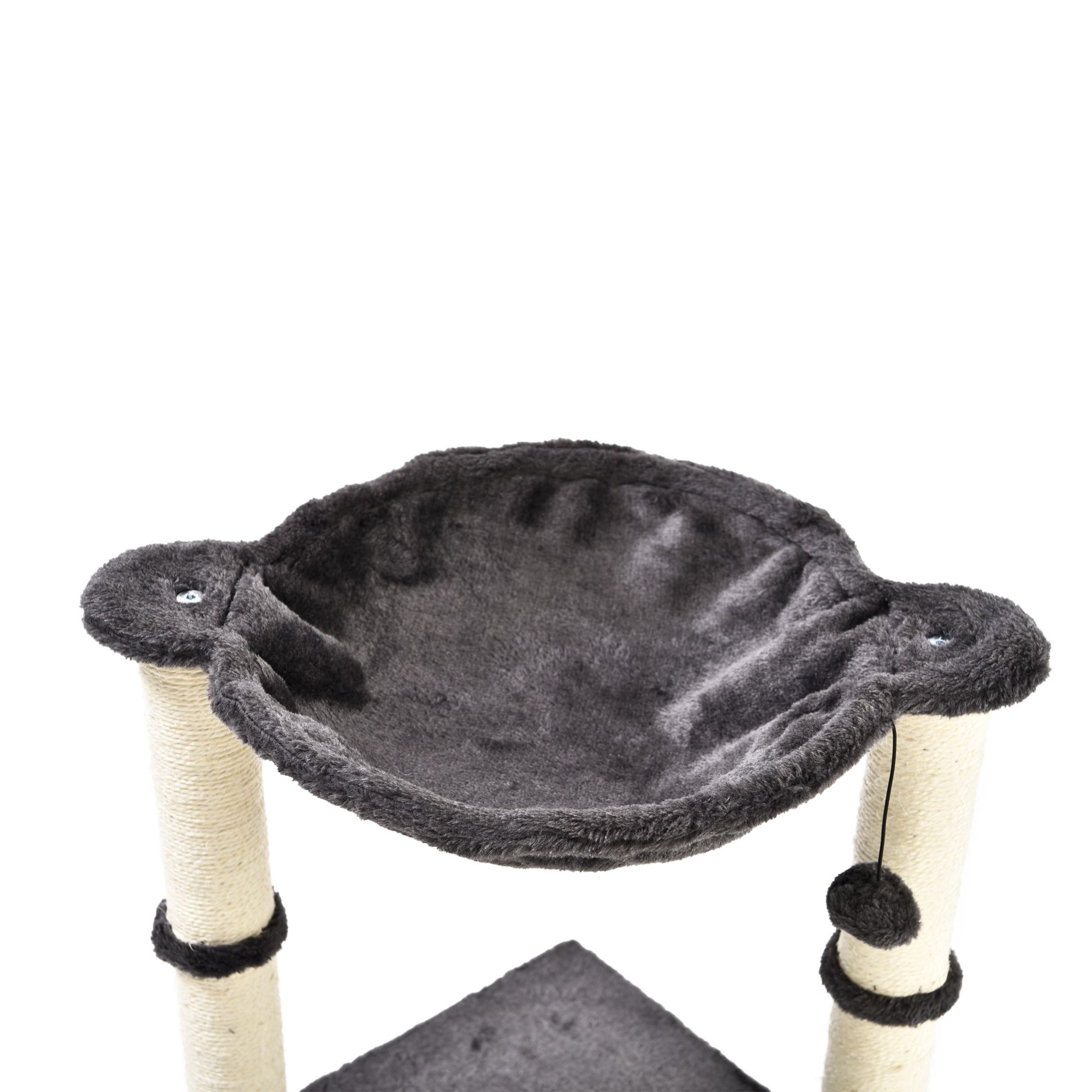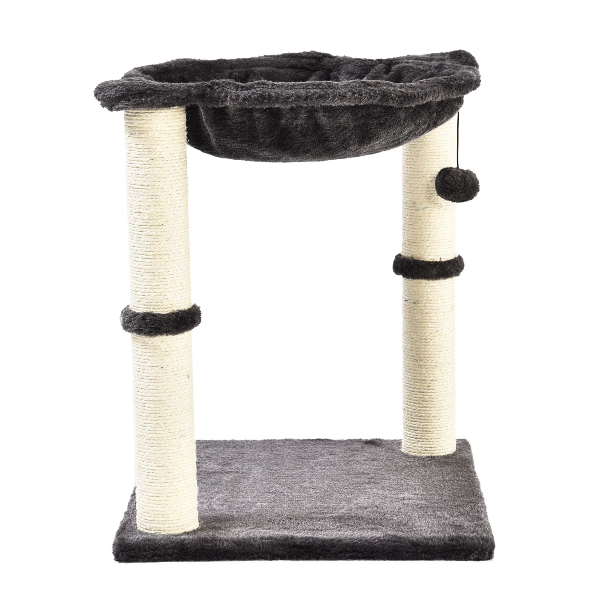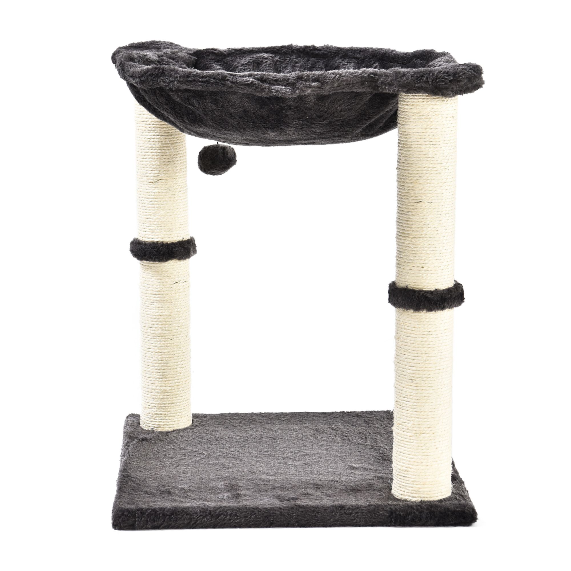 Elevated cat hammock with dual scratching post pillars Plush hammock provides a comfortable space for your cat to relax Natural jute fiber scratching posts help keep nails healthy Durable, long-lasting construction Helps to keep your cat from damaging carpets, furniture, curtains, and more Includes cat tree with hammock bed and scratching posts