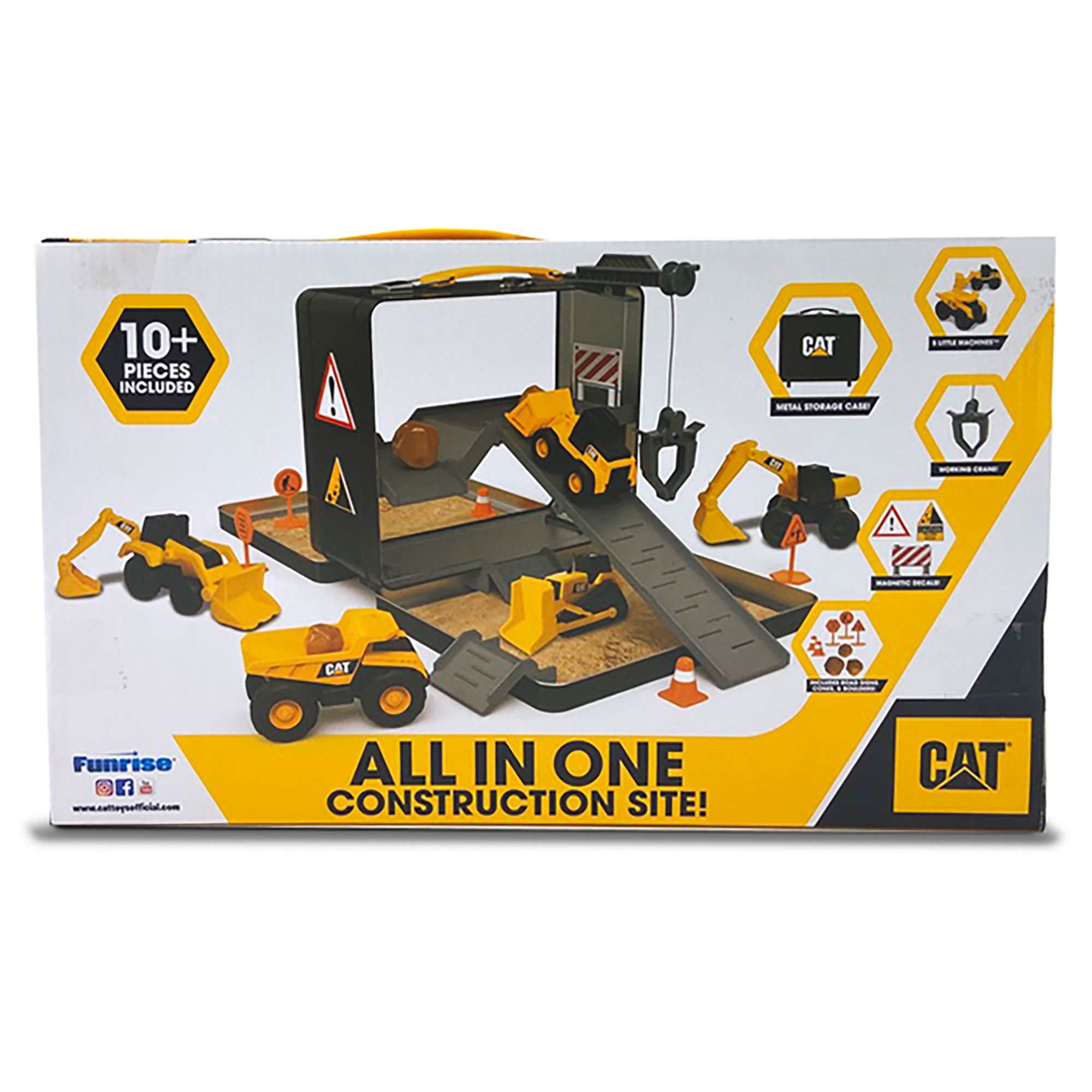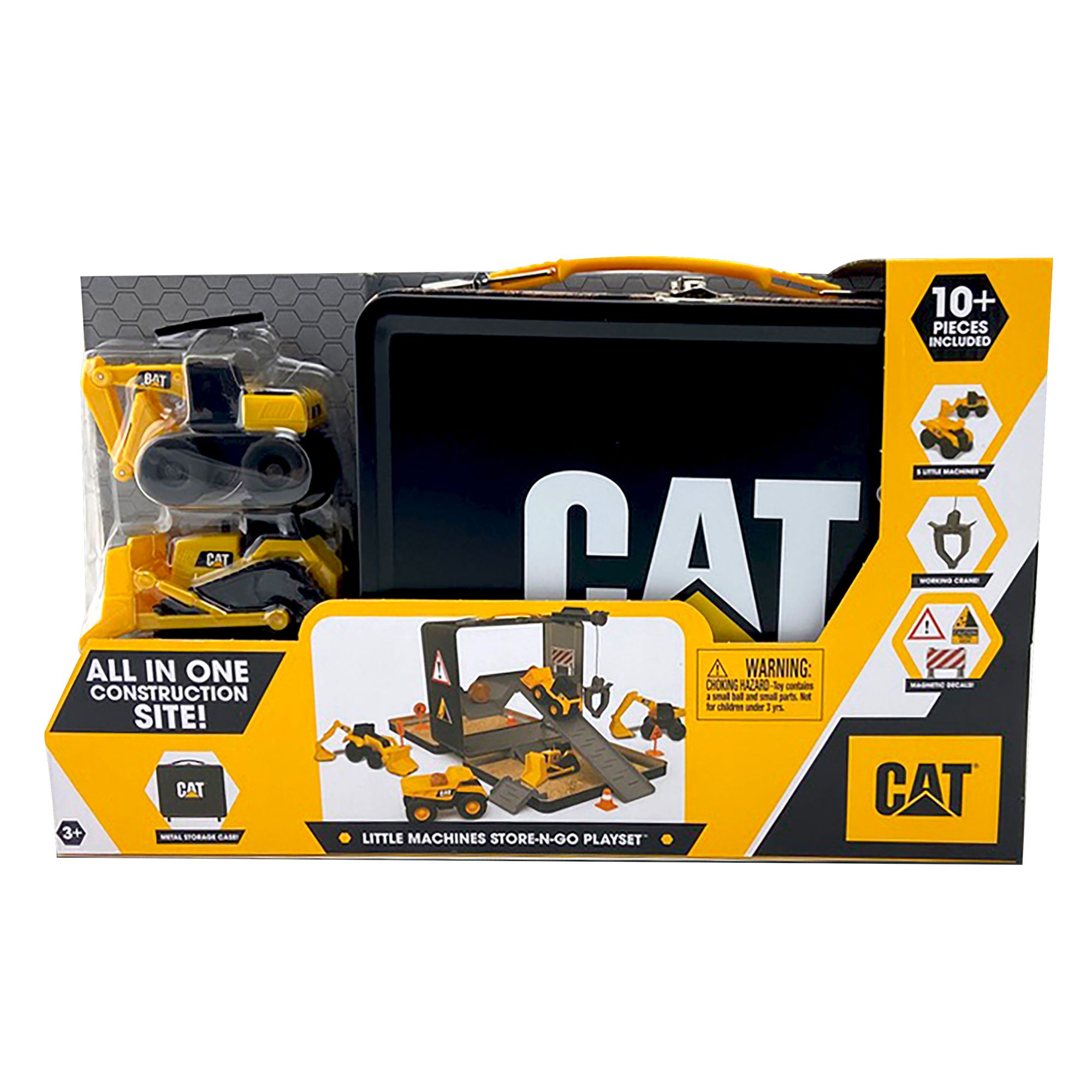 CAT Little Machines Store N Go Playset allows little builders to bring the construction site with them wherever they go. The durable classic tin storage case easily transforms into a multi-level worksite. Open the tin case to reveal a playset complete with five little machines vehicles, accessories such as road signs, cones, and boulders, magnetic decals, ramps, and a working crane. With 19 pieces included, this playset is sure to inspire your little builder’s imagination. When playtime is over, simply place everything back inside the tin carrying case for convenient storage. Real CAT machines are known for their high quality, these toys are no different, built to withstand the elements and perfect for indoor or outdoor play. Appropriate for ages 3+.