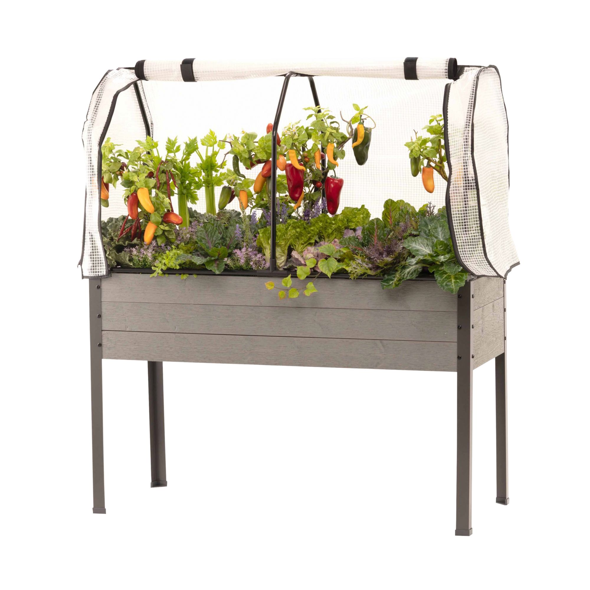 Includes elevated planter with greenhouse cover