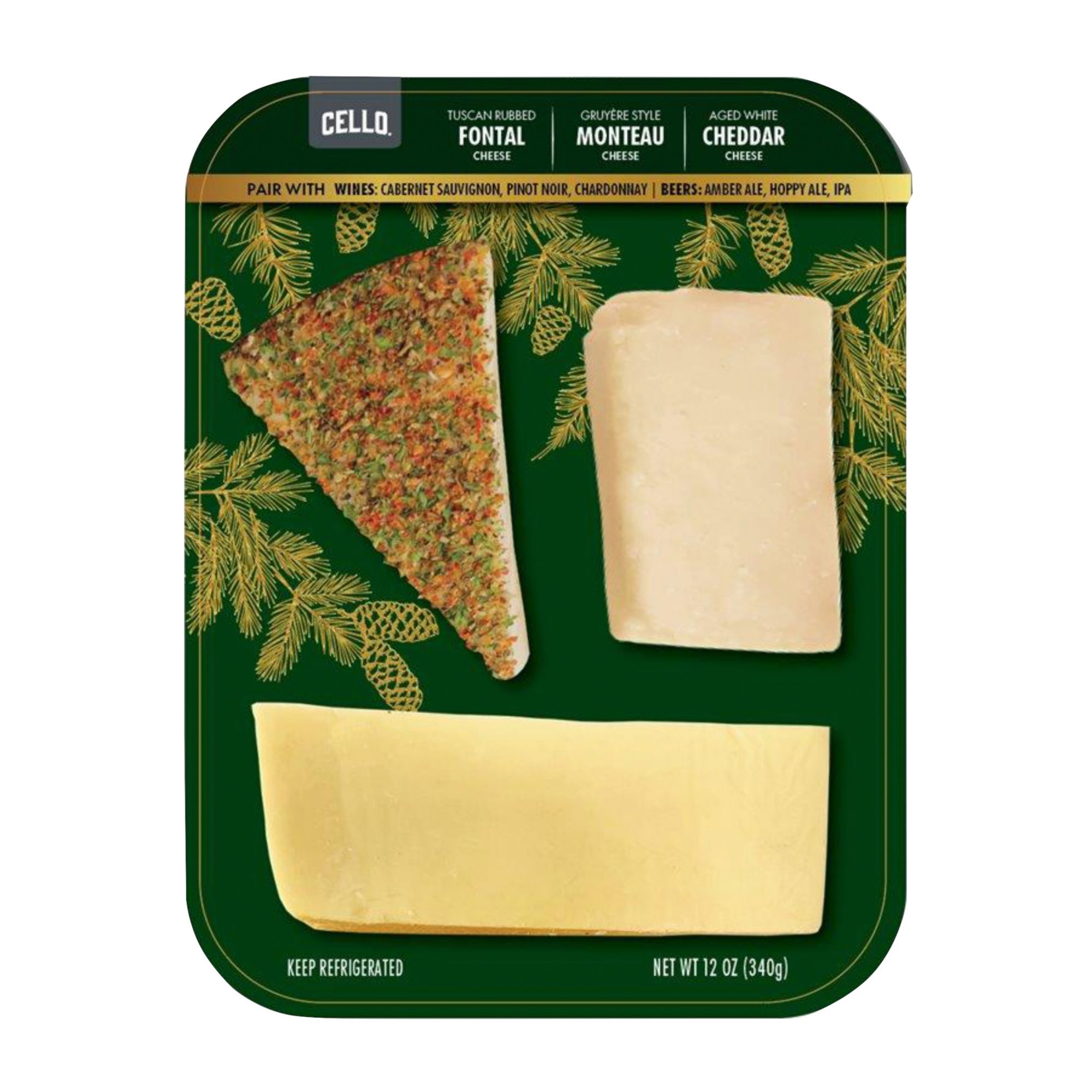 Cello Board is a cheese flight from an assortment of three cheeses. This assortment includes Tuscan Rubbed Fontal, Monteau Cheese, and Aged White Cheddar. Serves up to 12.