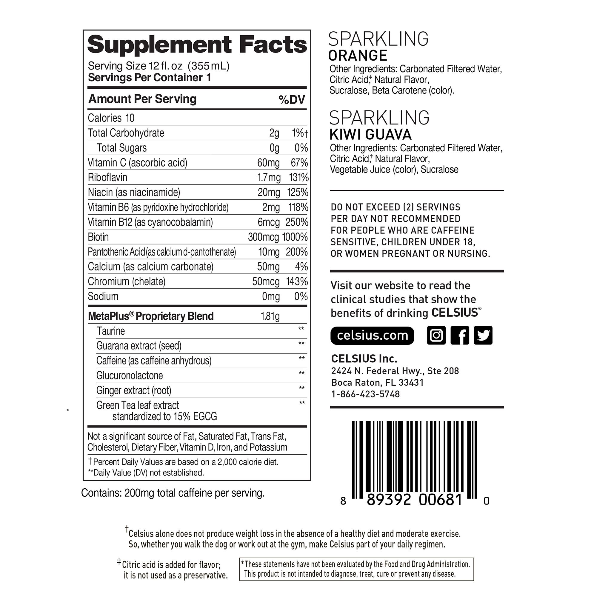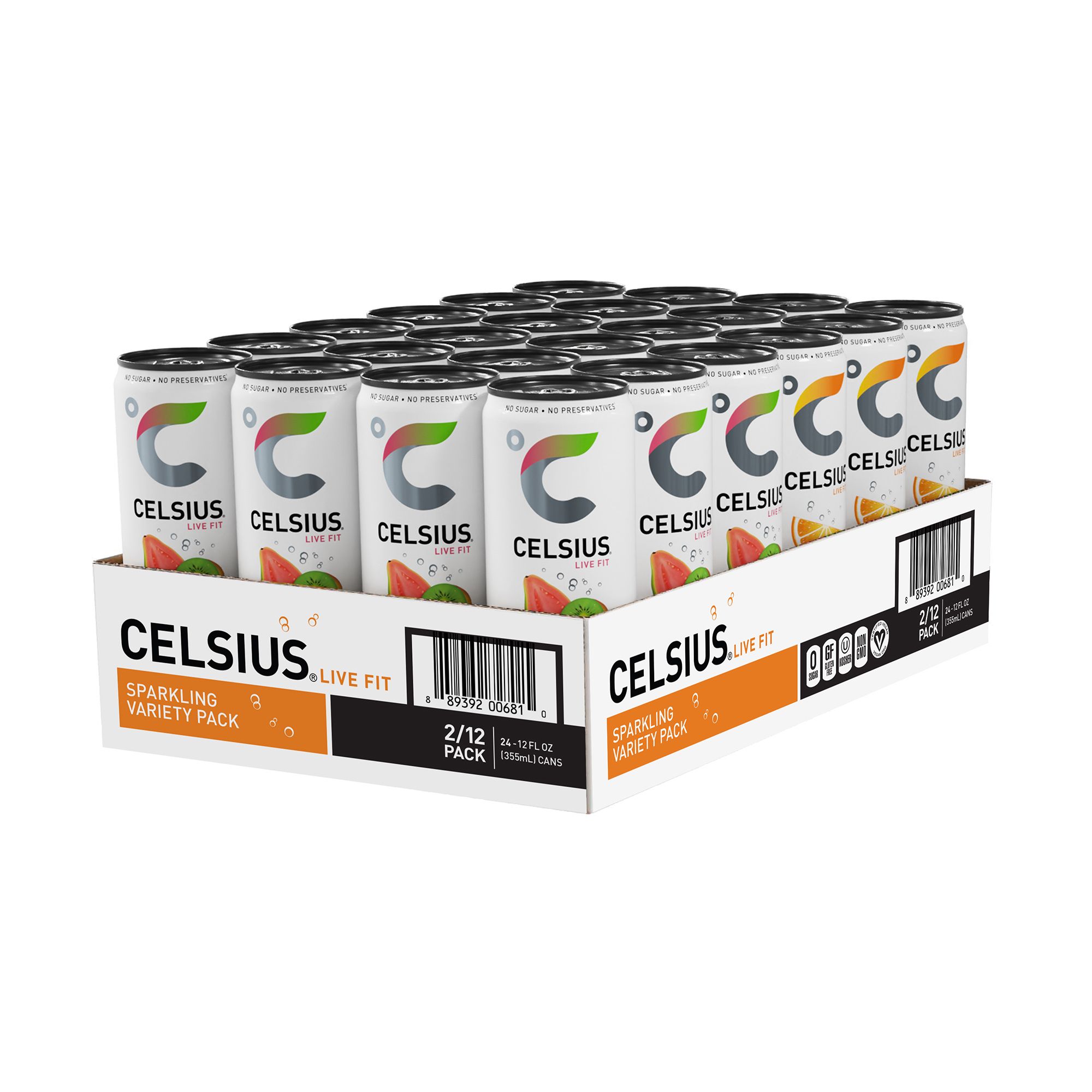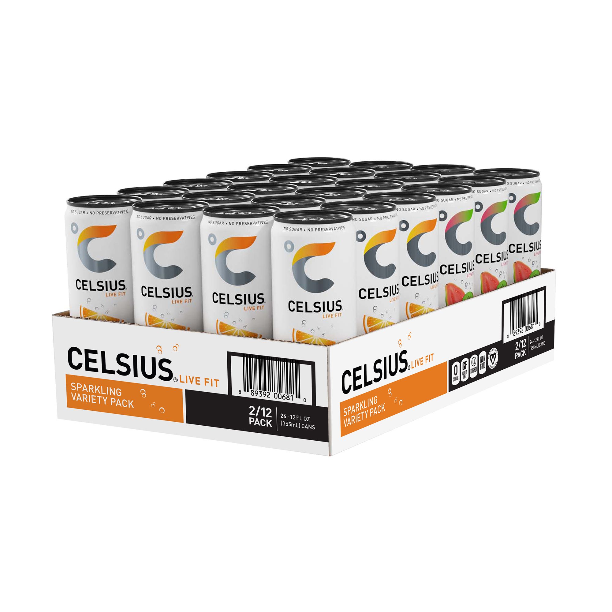 Two single units of Celsius orange 12 oz. and 12 single units of Celsius kiwi guava 12 oz. Essential energy No sugar, no preservatives No artificial flavors or colors Gluten-free, kosher, non-GMO, and certified vegan Seven essential vitamins
