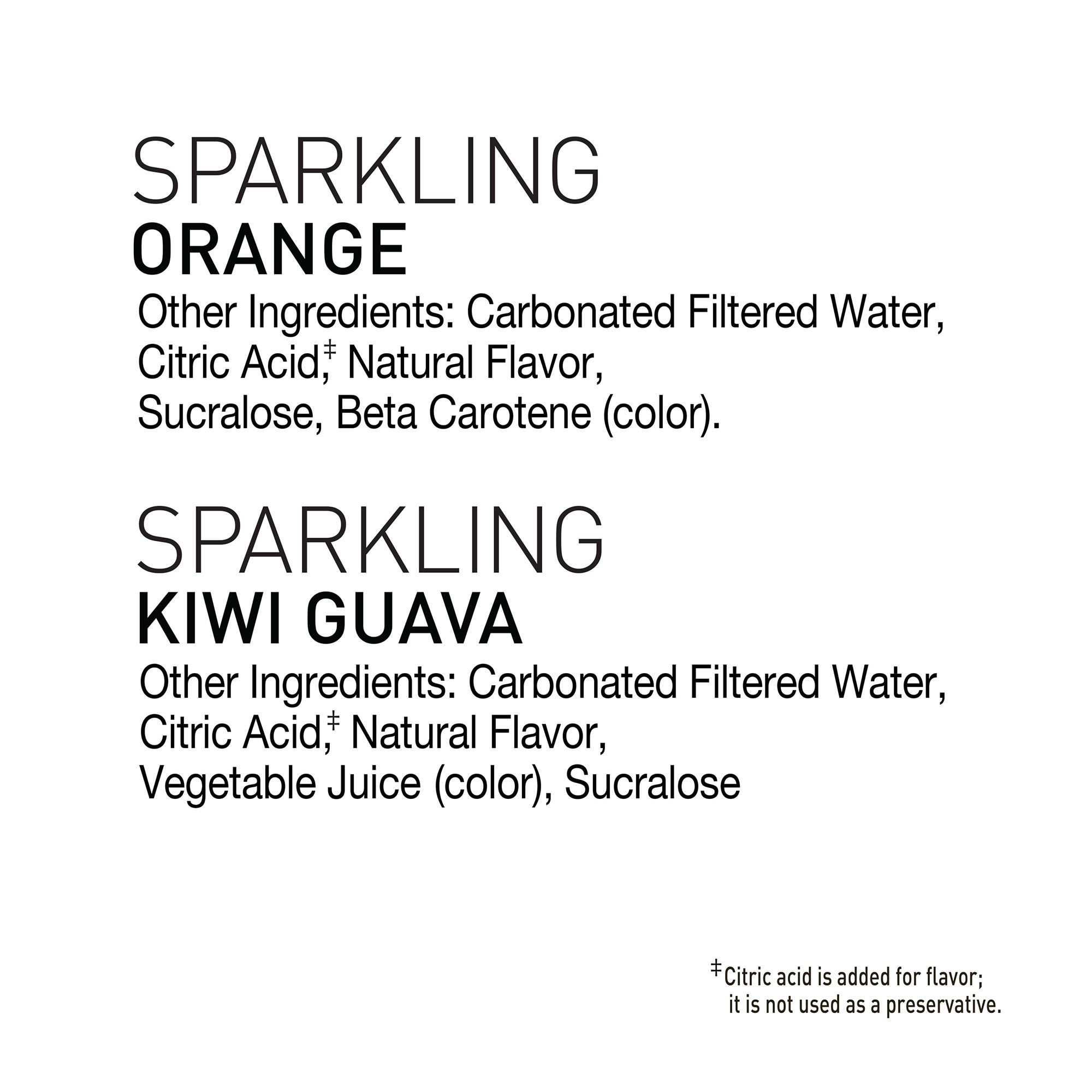 Orange: Carbonated Filtered Water, Citric Acid, Natural Flavor, Sucralose, Beta Carotene for Color; Kiwi Guava: Carbonated Filtered Water, Citric Acid, Natural Flavor, Vegetable Juice for Color, Sucralose