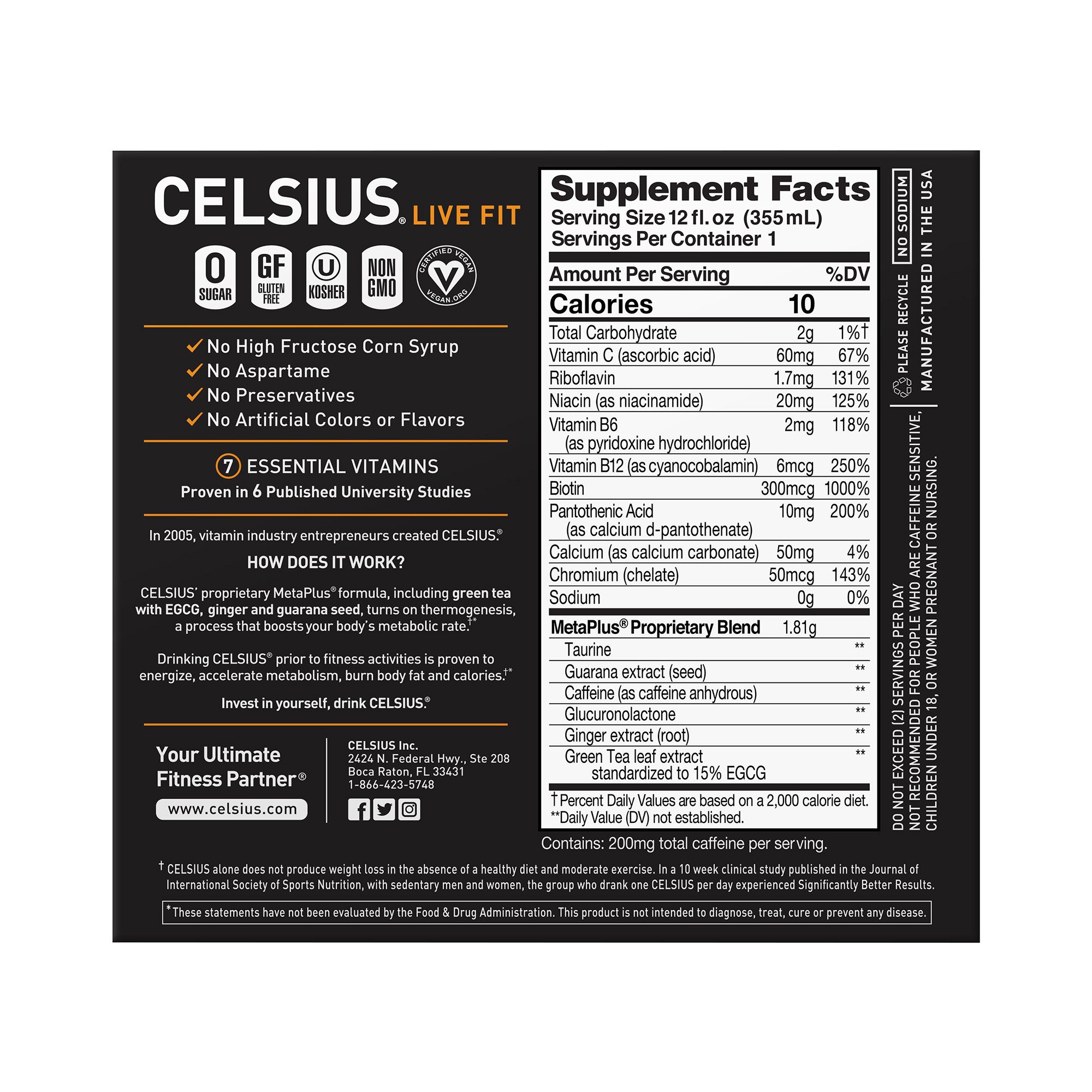 Celsius is a lifestyle fitness drink and a pioneer in the rapidly growing performance energy sector. Celsius has five beverage lines that each offer proprietary, functional, healthy-energy formulas clinically-proven to offer significant health benefits to its users. Celsius has zero sugar, no preservatives, no aspartame, no high fructose corn syrup, and is non-GMO, with no artificial flavors or colors. The Celsius line of products is Certified Kosher and Vegan. It is also soy and gluten-free and contains very little sodium.