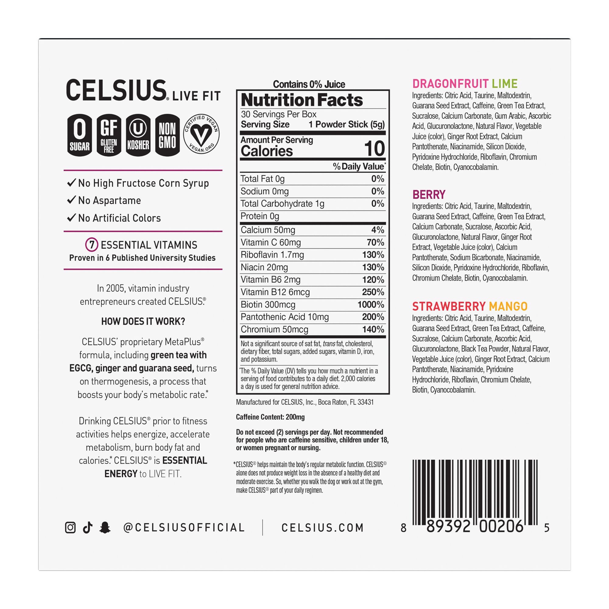 On-the-Go Powder Sticks provide balanced energy with 200mg of caffeine to help you live fit. Made with premium, proven ingredients and 7 essential vitamins. Perfect for travel and keeping you energized while on the move. Gluten-Free, Kosher, Non-GMO, & Certified Vegan. Just add water and go.