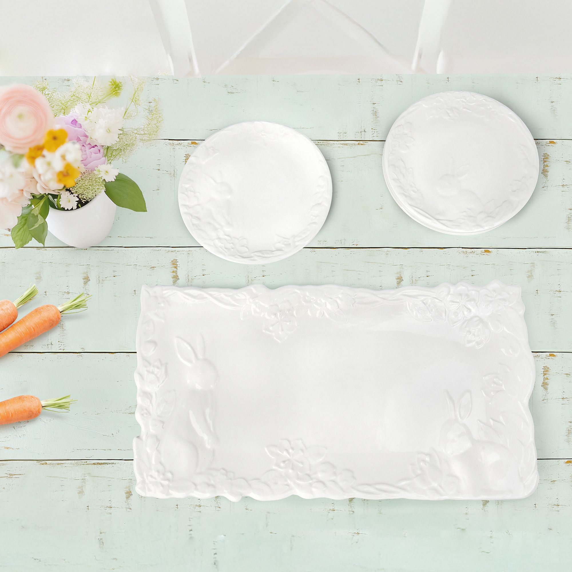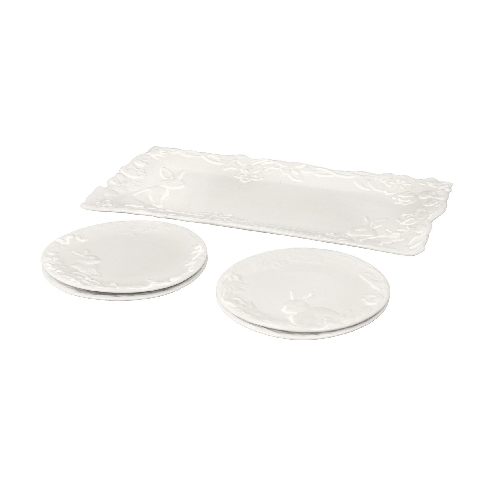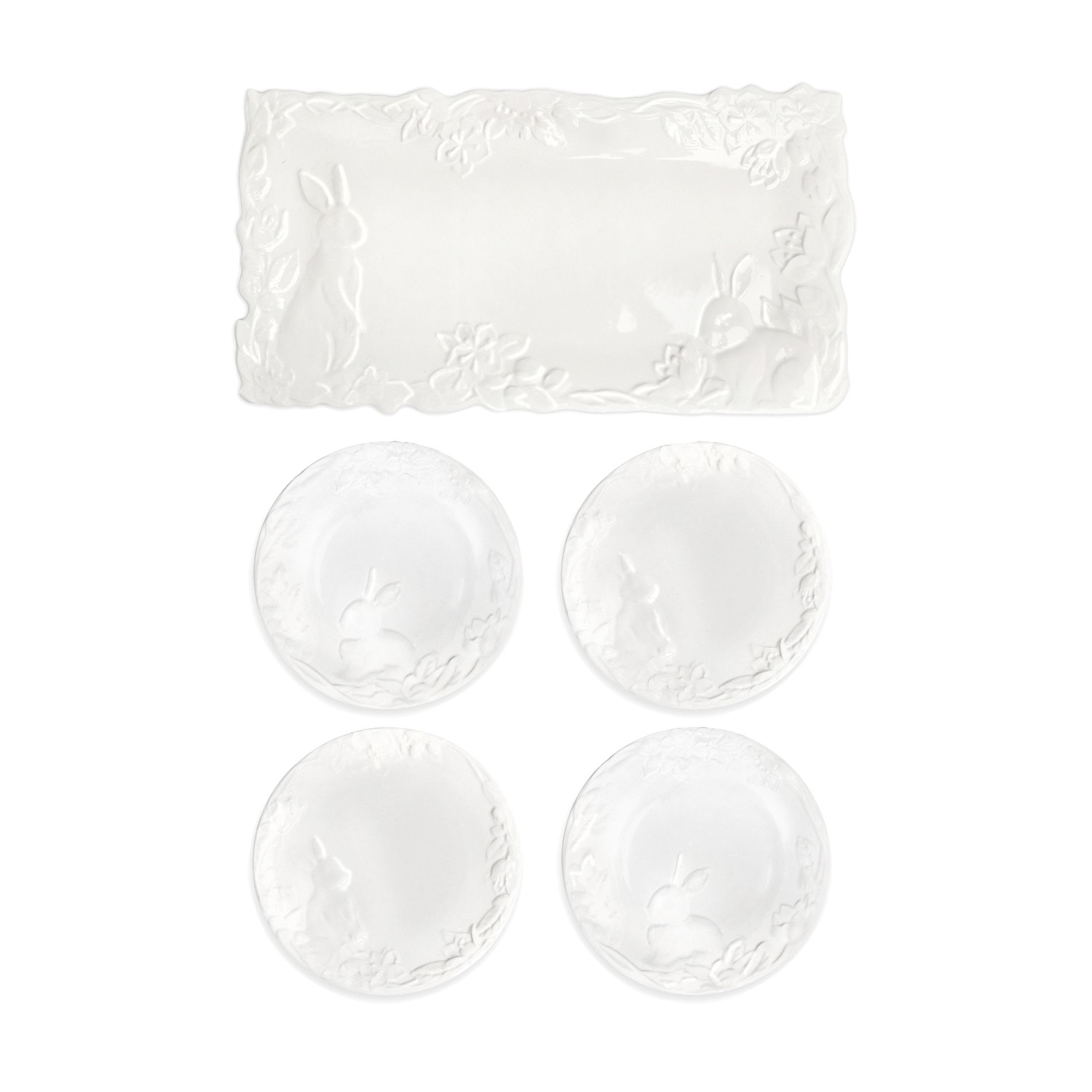 Celebrate the spirit of Easter with the elegant set of five white porcelain plates, designed to bring a touch of refinement and joy to your festive table. This exquisite set includes one elongated serving platter and four matching round plates, each adorned with intricate embossed patterns that capture the essence of the season. The elongated platter, perfect for serving delectable Easter dishes, features a delicate arrangement of embossed bunnies in various playful poses, surrounded by graceful floral and leaf motifs. Each bunny is meticulously detailed, adding a whimsical charm to your table setting. The four round plates complement the platter beautifully, each showcasing unique embossed designs of bunnies and springtime flora. The white porcelain's clean, luminous finish enhances the elegant relief patterns, making every meal feel like a special occasion. Crafted from high-quality porcelain these plates are not only visually stunning but also durable and practical for everyday use. Their timeless design and pristine white color ensure they will remain a cherished part of your tableware collection for years to come. Elevate your Easter celebrations with this sophisticated set, where every detail is crafted to bring the joy of the season to your dining experience. Let these beautiful plates become a part of your cherished holiday traditions.