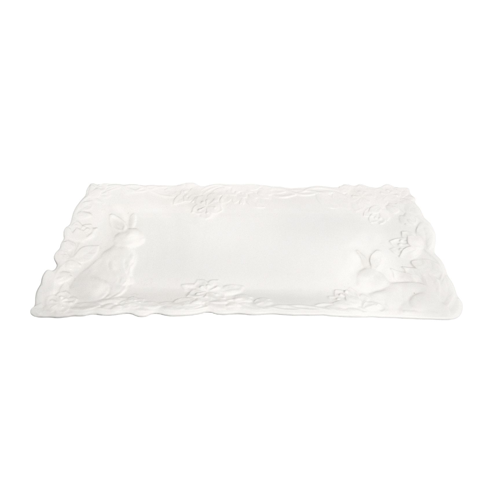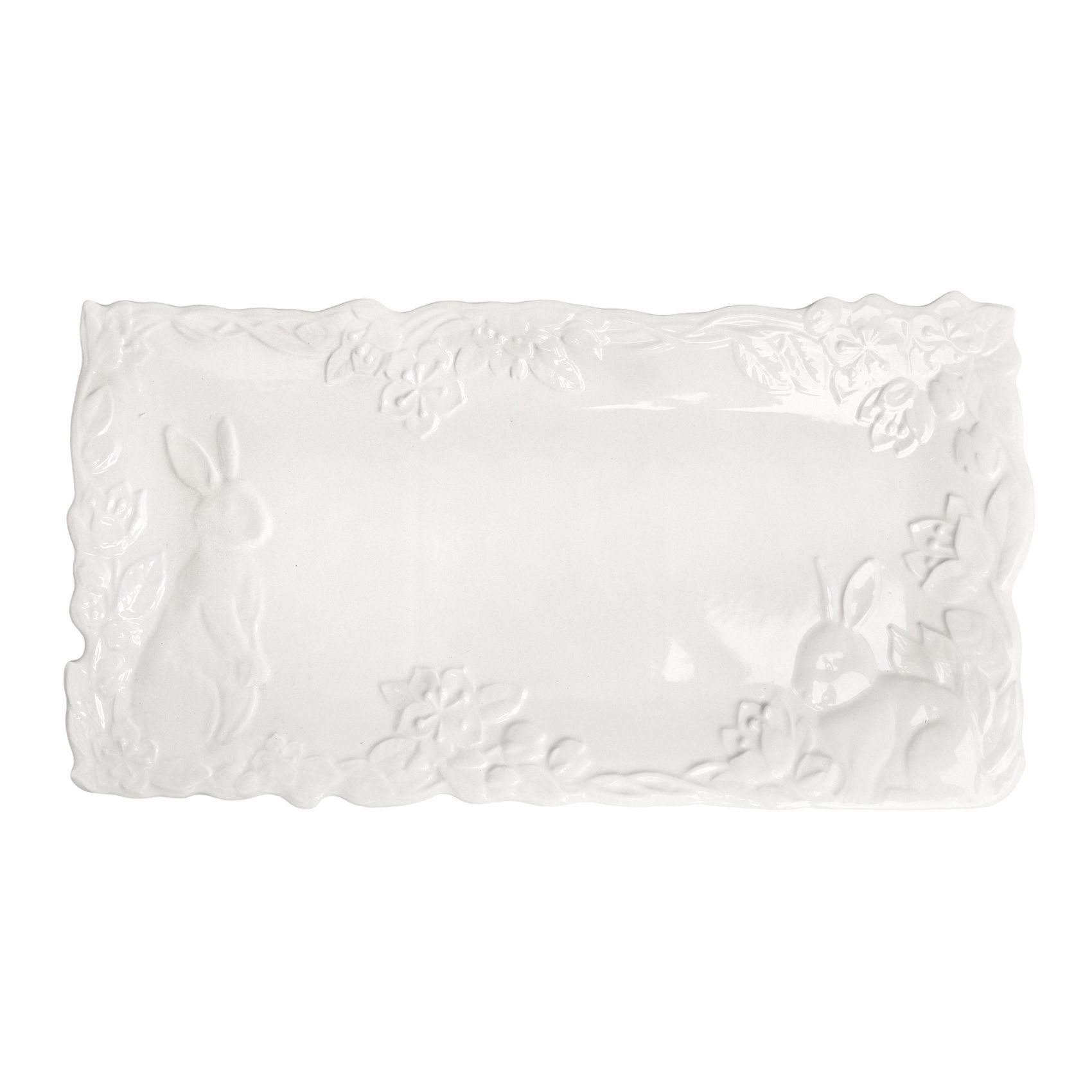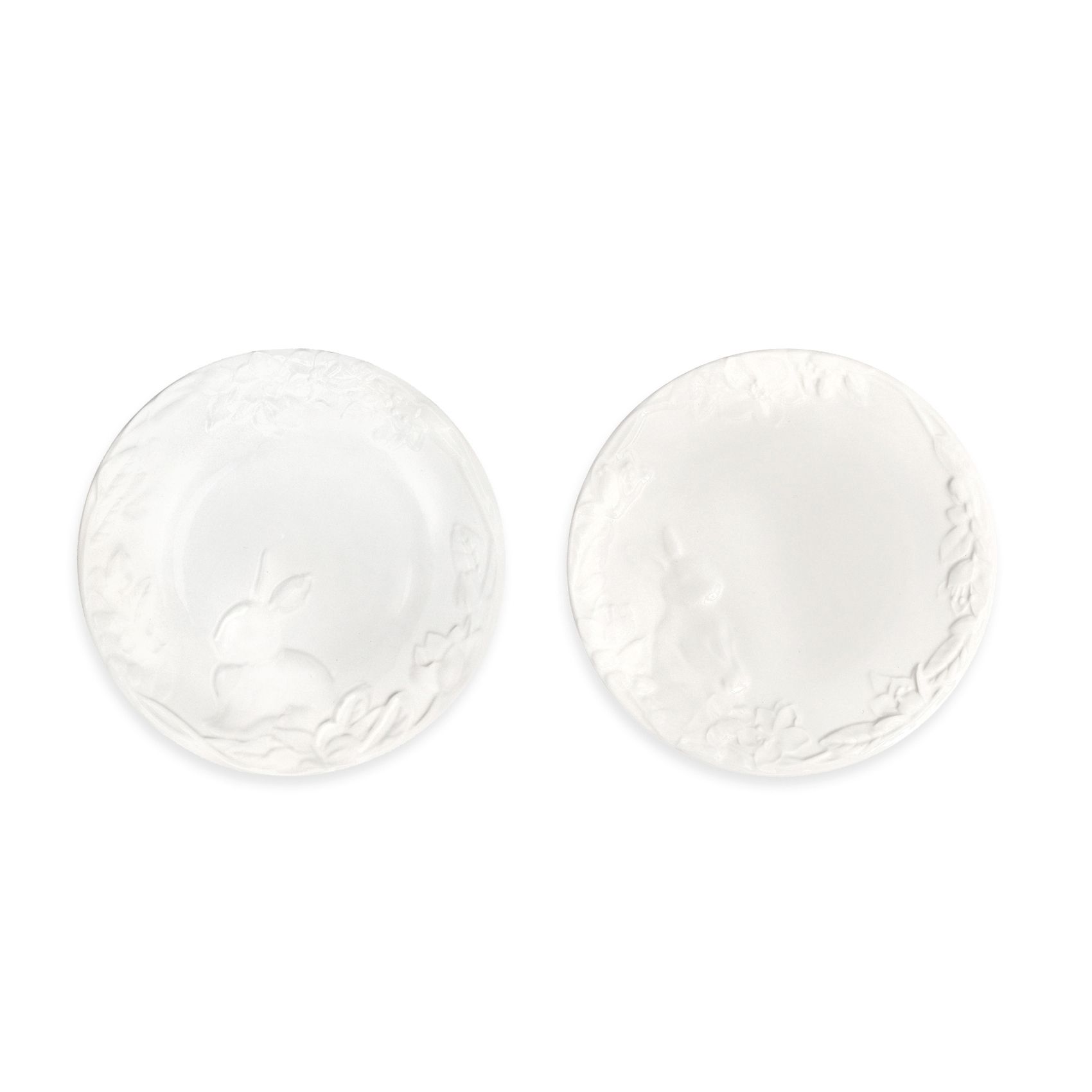 Celebrate the spirit of Easter with the elegant set of five white porcelain plates, designed to bring a touch of refinement and joy to your festive table. This exquisite set includes one elongated serving platter and four matching round plates, each adorned with intricate embossed patterns that capture the essence of the season. The elongated platter, perfect for serving delectable Easter dishes, features a delicate arrangement of embossed bunnies in various playful poses, surrounded by graceful floral and leaf motifs. Each bunny is meticulously detailed, adding a whimsical charm to your table setting. The four round plates complement the platter beautifully, each showcasing unique embossed designs of bunnies and springtime flora. The white porcelain's clean, luminous finish enhances the elegant relief patterns, making every meal feel like a special occasion. Crafted from high-quality porcelain these plates are not only visually stunning but also durable and practical for everyday use. Their timeless design and pristine white color ensure they will remain a cherished part of your tableware collection for years to come. Elevate your Easter celebrations with this sophisticated set, where every detail is crafted to bring the joy of the season to your dining experience. Let these beautiful plates become a part of your cherished holiday traditions.