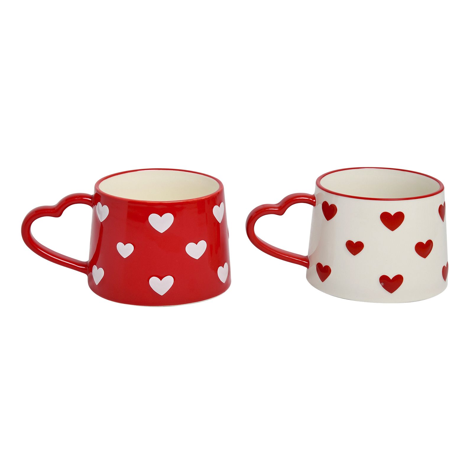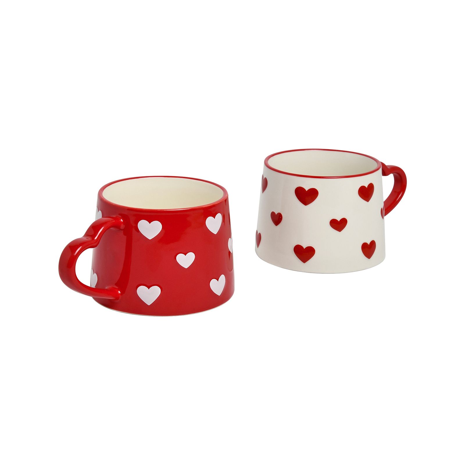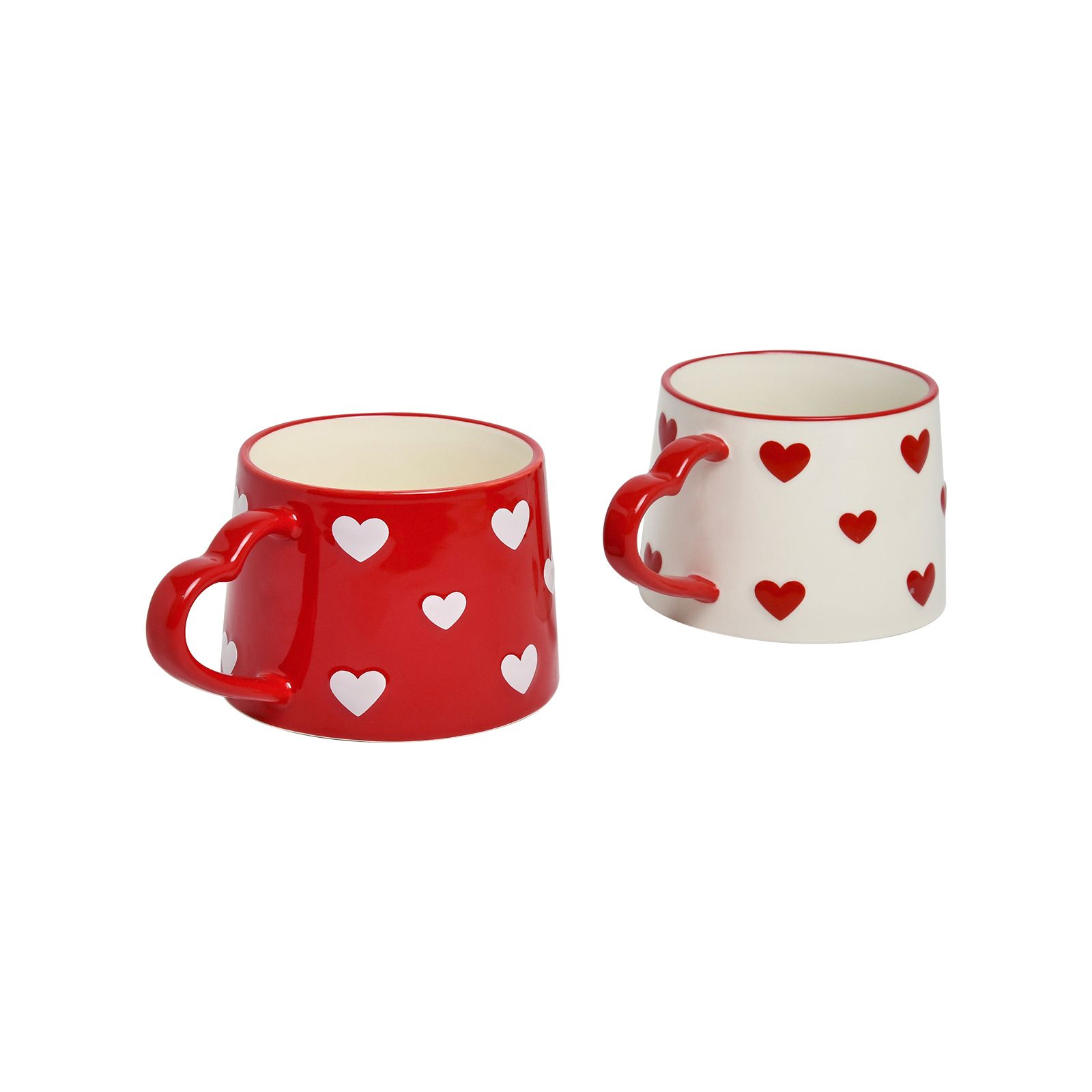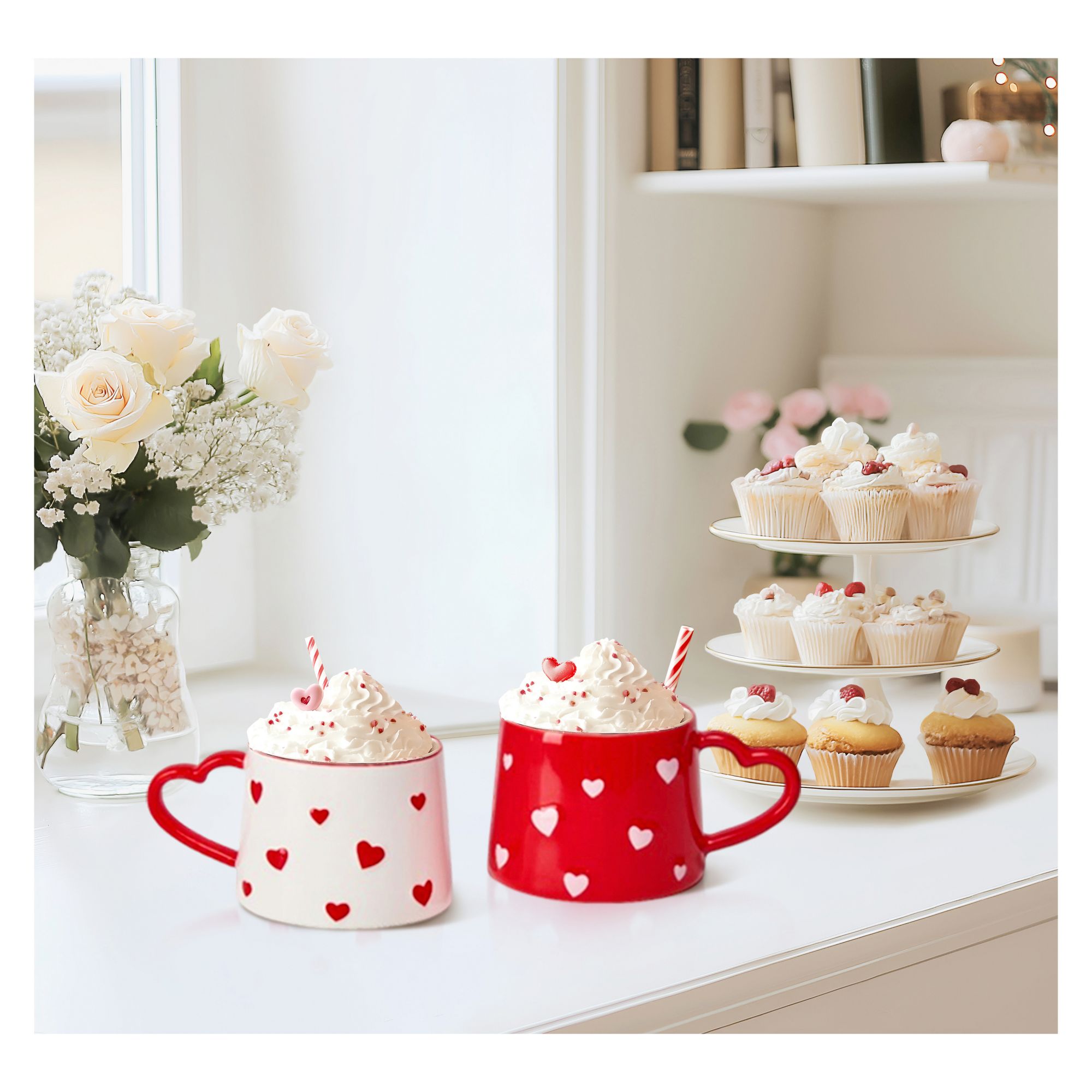 Introducing a pair of exquisite heart-themed embossed mugs, perfect for celebrating love on Valentine's Day. Each mug in this charming set tells its own story through color and design. One mug features a pristine white background adorned with a striking red heart embossed in intricate detail, while its counterpart showcases a rich red base with a delicate white heart elegantly raised in relief. Both mugs boast heart-shaped handles, adding a touch of romance to each sip. Crafted from fine ceramic, these mugs are not just functional but also serve as a beautiful token of affection, making every coffee or tea moment a sweet reminder of love. Celebrate your special bond with this thoughtful and romantic set, perfect for sharing warm drinks and cherished moments together.