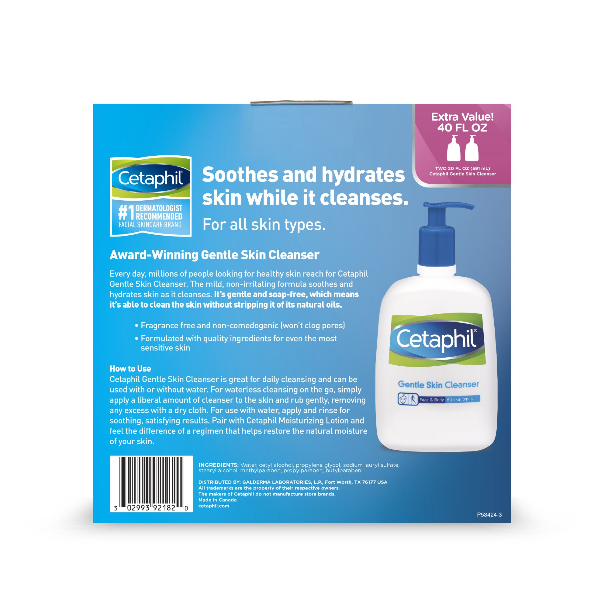 Gently cleanses all skin types Ideal for full-body cleaning Helps skin retain necessary moisture Mild enough for baby's skin Noncomedogenic, fragrance-free, soap-free and dermatologist recommended