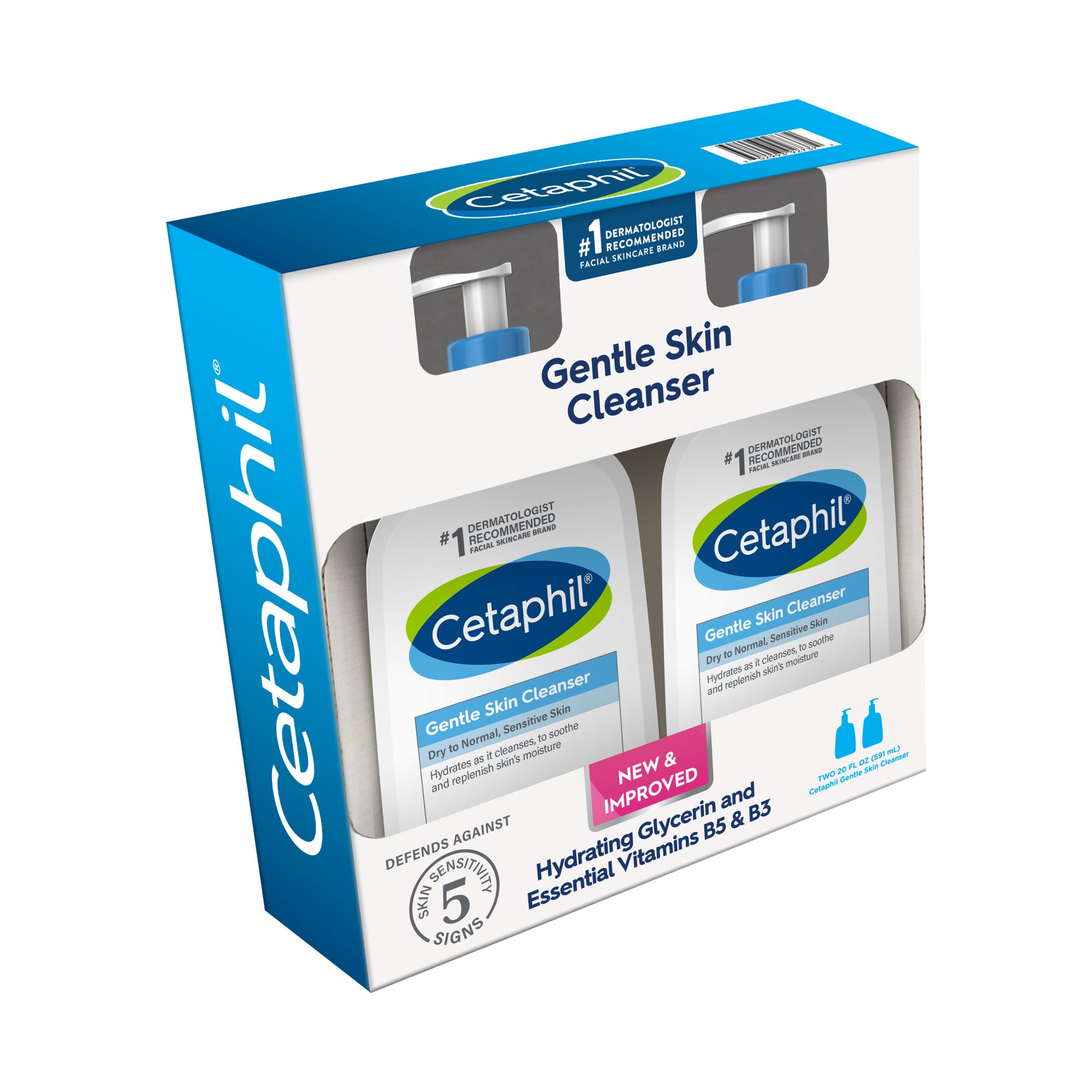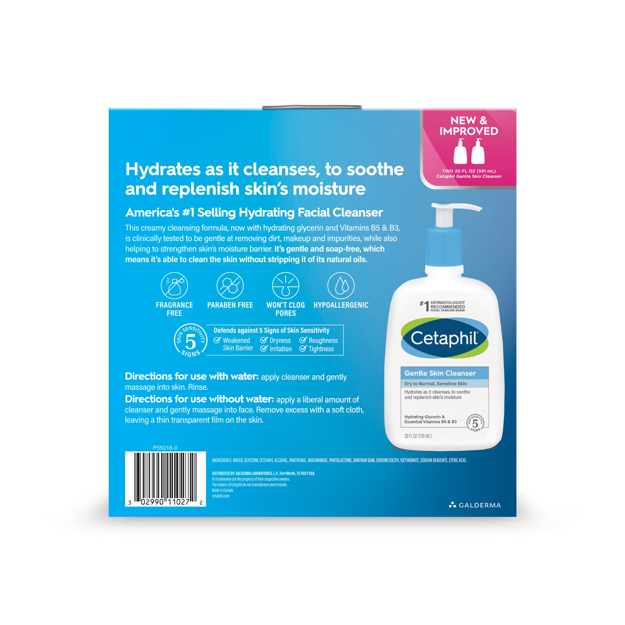 Cetaphil gentle skin cleanser: clinically proven to cleanse while hydrating, providing 48 hours of hydration when wiped off versus rinsing Ideal for dry to normal, sensitive skin: hydrates and soothes as it cleanses, preserving skin's moisture barrier, even after repeat washes New and improved ingredient blend: now with hydrating glycerin and skin essential vitamins B5 (panthenol) and B3 (niacinamide) Developed for even the most sensitive skin: the hypoallergenic, non-comedogenic formula is free of fragrances, parabens and sulfates From the #1 dermatologist recommended facial skincare brand Includes two 20 oz. bottles