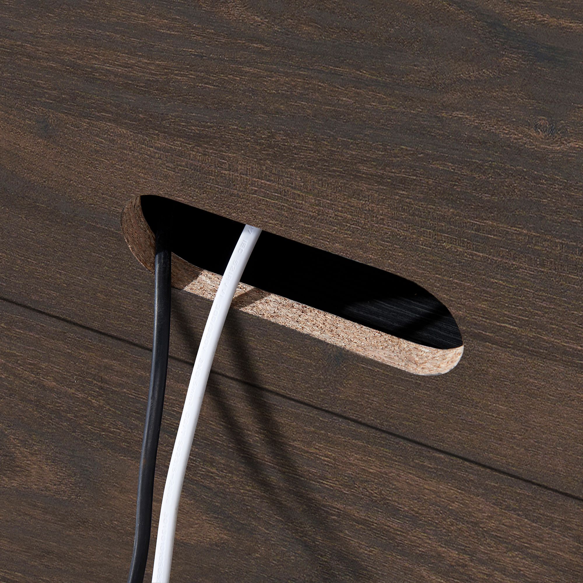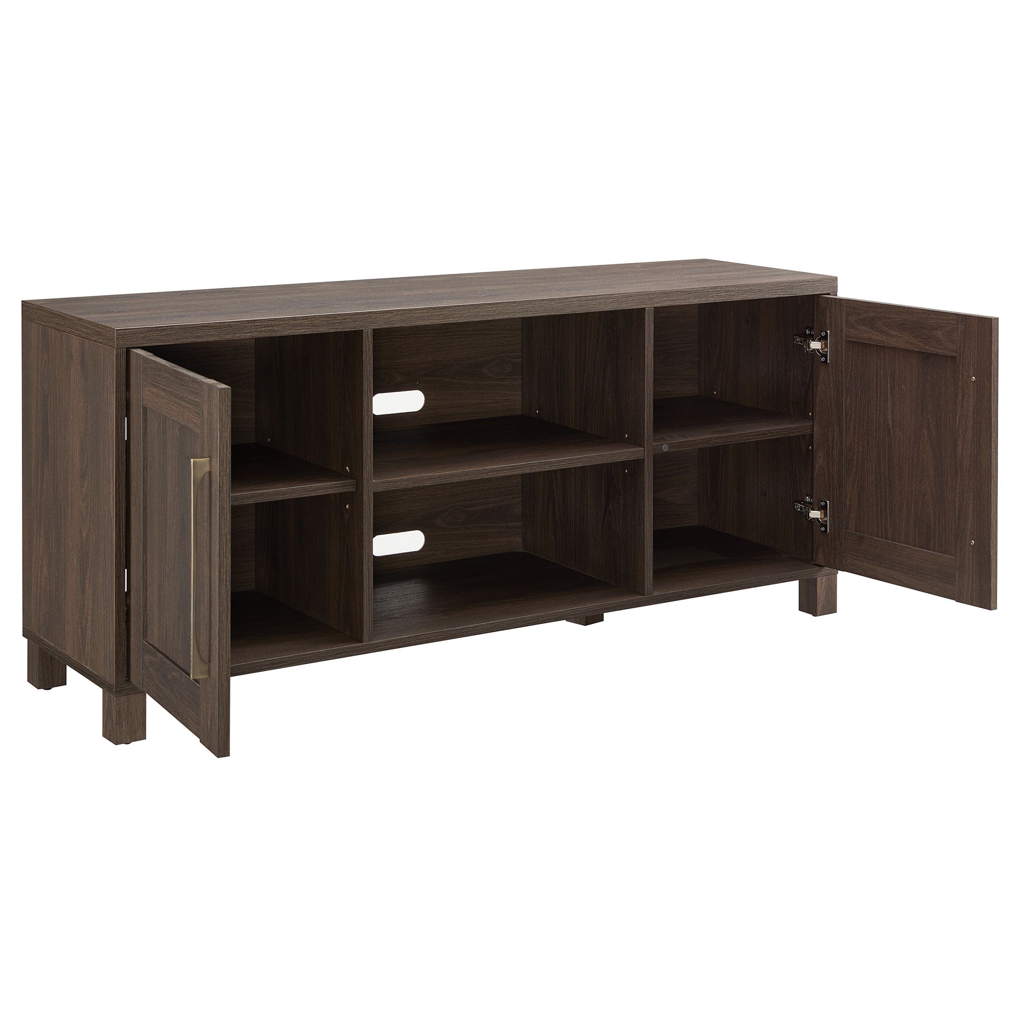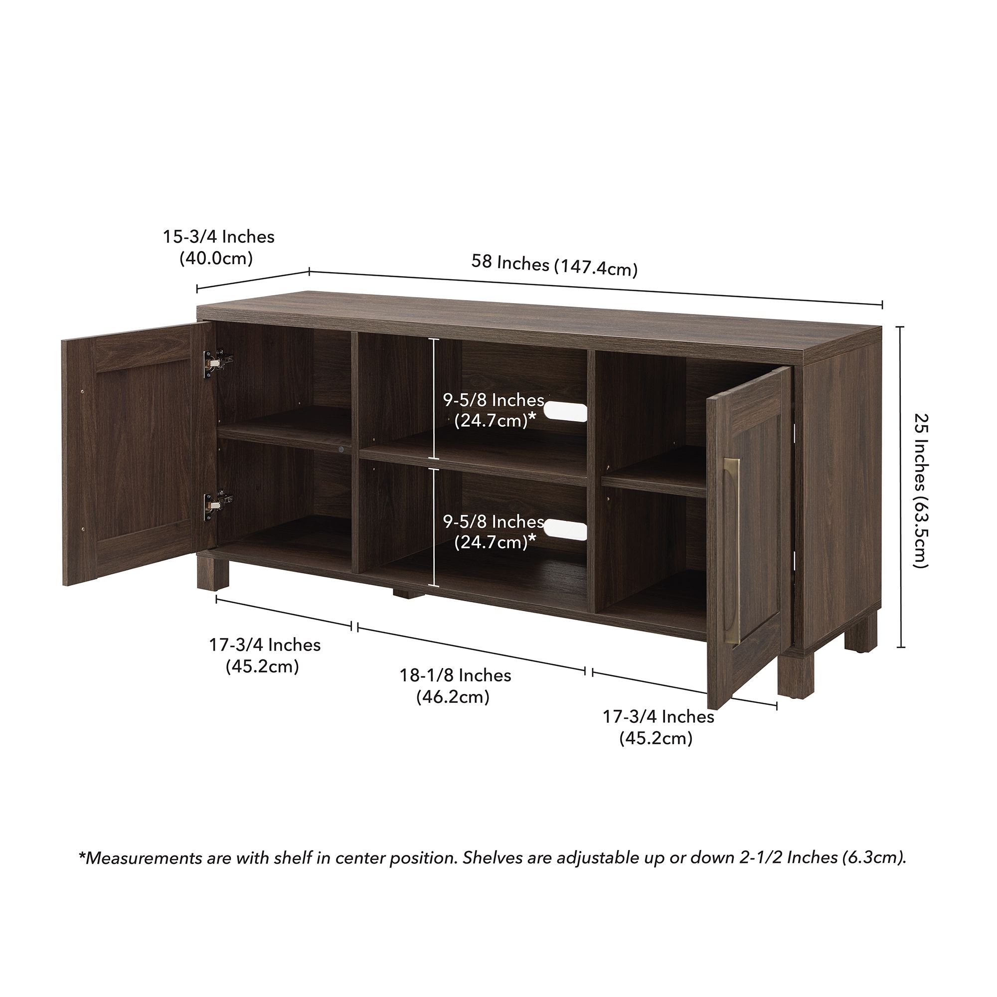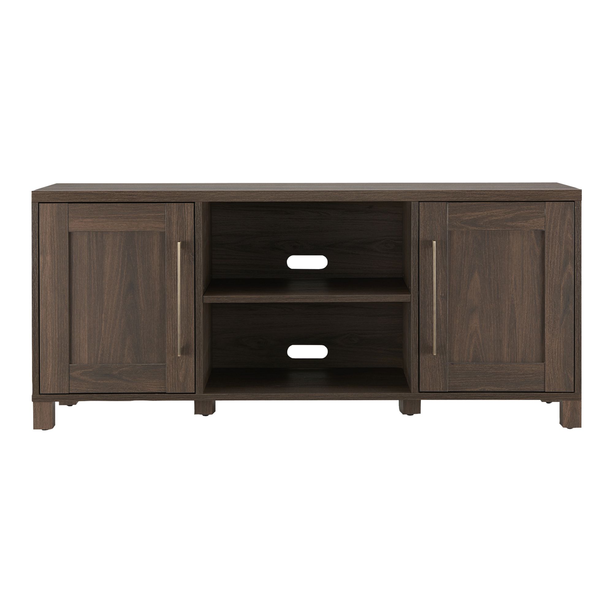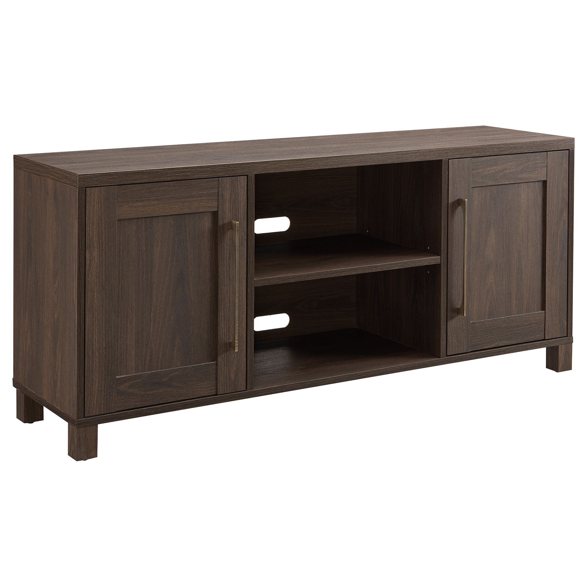 Combine functionality and classic transitional design with this modern TV stand. Its rich wood tone creates a warm neutral palette that will blend seamlessly into any color scheme, while its classic styling pairs perfectly with the existing design inspiration of your living room, den, or game room. This solid-backed stand features two large enclosed cabinets with sleek brass-finished hardware. Cable management cut-outs and adjustable inner shelves help keep your media storage and consoles organized.