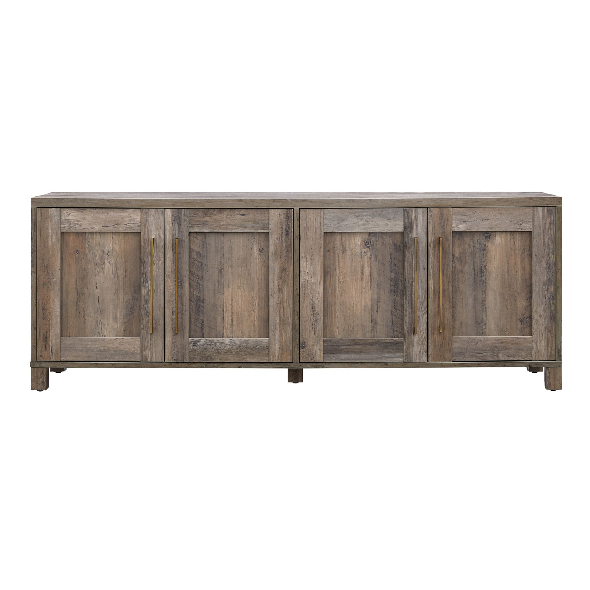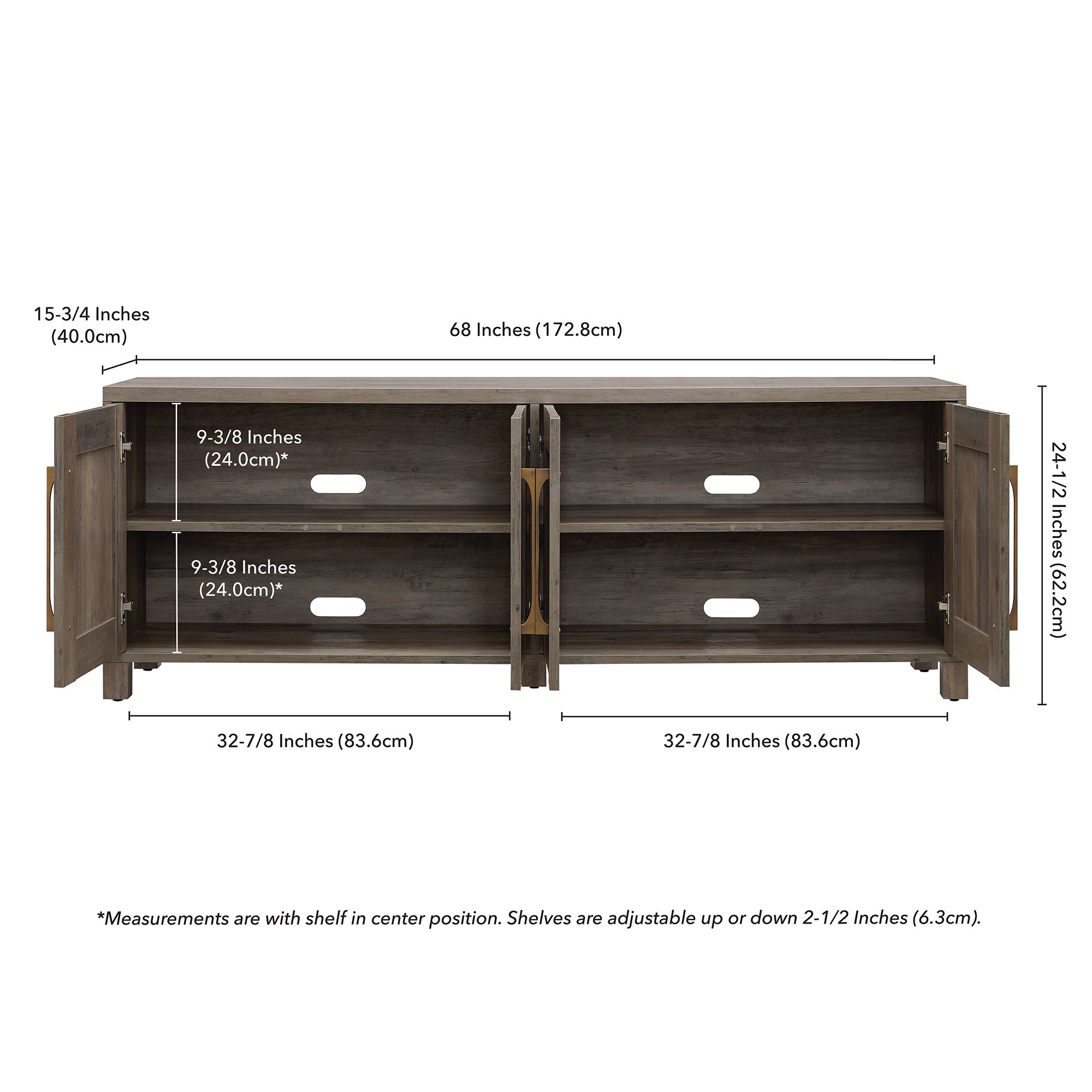 Combine functionality and classic transitional design with this modern TV stand. Its rich wood tone creates a warm neutral palette that will blend seamlessly into any color scheme, while its classic styling pairs perfectly with the existing design inspiration of your living room, den, or game room. This solid-backed stand features two large enclosed cabinets with sleek brass-finished hardware. Cable management cut-outs and adjustable inner shelves help keep your media storage and consoles organized.