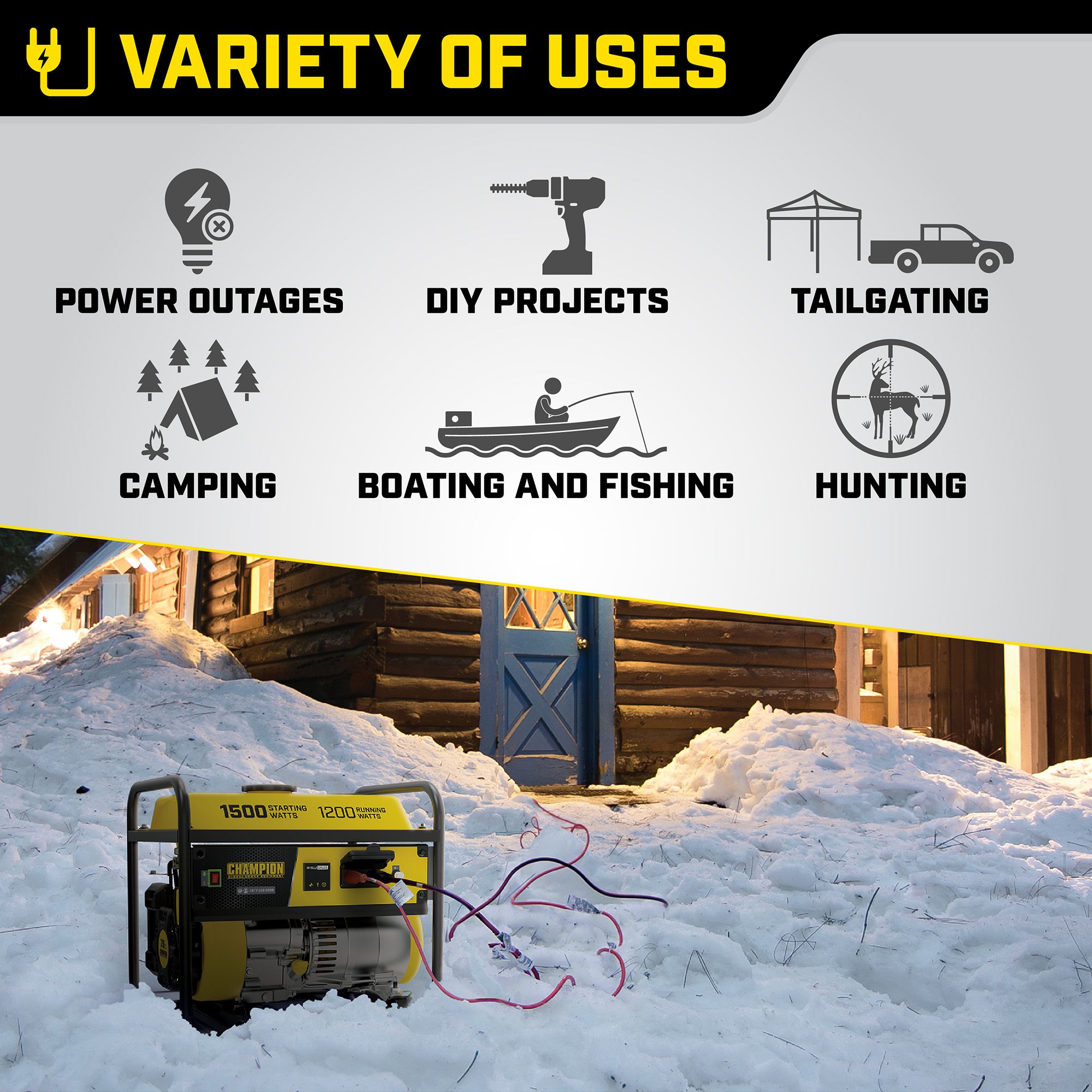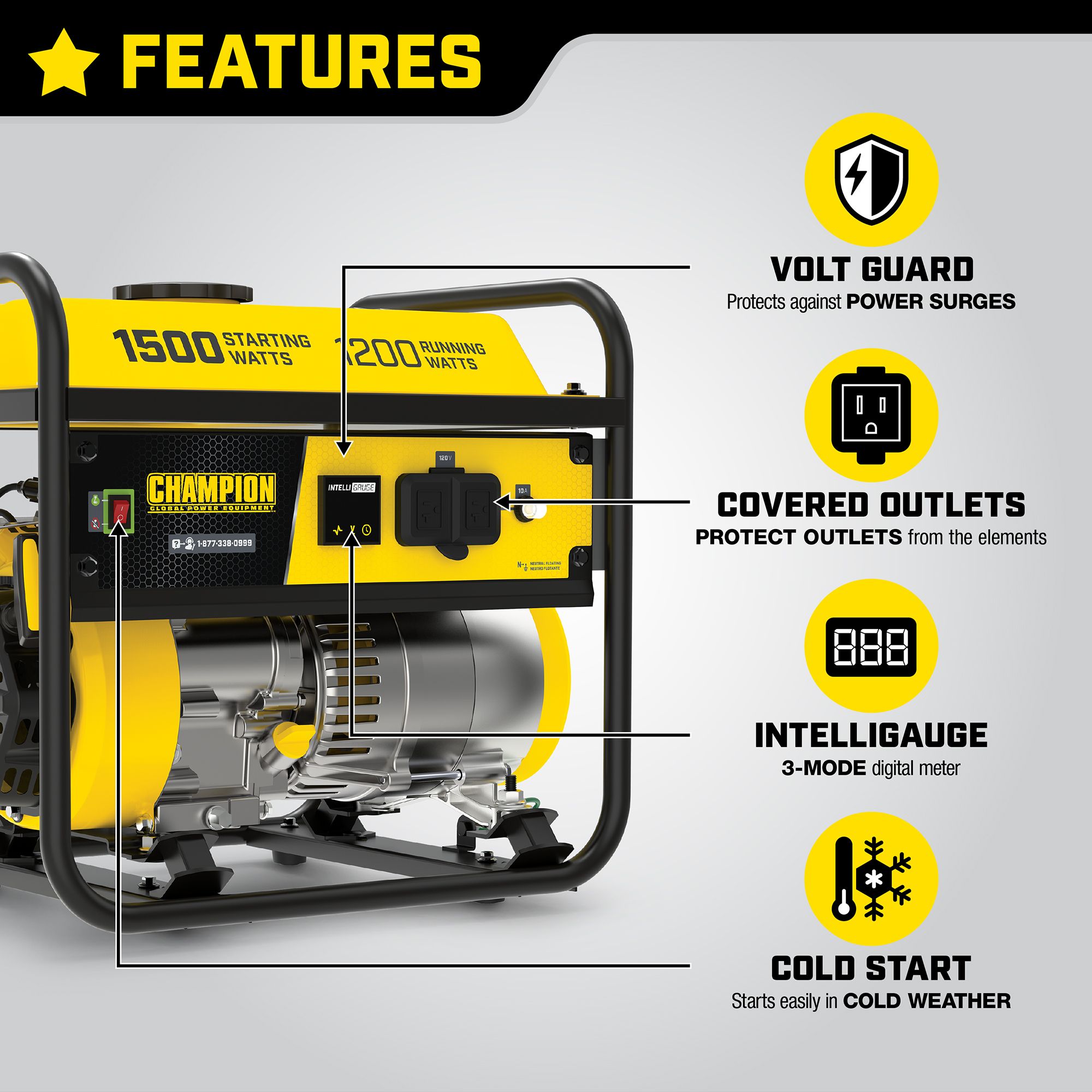 The Champion Power Equipment 200915 1200-Watt Multi-Purpose Portable Generator is designed with your safety and convenience in mind, and is the perfect “what if” generator. At 1500 starting watts and 1200 running watts, this rugged generator with its durable steel frame is easy to transport and provides just what you need for RV use, camping, tailgating, boating, hunting, weekend trips, family vacations and small jobs around the house. The next time there’s an outage, the 79cc Champion single-cylinder OHV engine will provide the power you need for a few essential items in an emergency - lights, microwave, fan, TV, modem/router, cell phone charger, etc. (Note: this unit is not recommended for emergency home backup for powering air conditioners, stoves, furnaces or sump pumps.) Power up with Champion’s reliable recoil start, plus Cold Start Technology ensures a quick start in cold weather. Champion also makes it easy to monitor voltage, frequency and operating hours with Intelligauge. This unit includes two 120V 20A covered household outlets (5-20R). Designed for safety with convenient push-to-reset circuit breakers, a low oil shut-off sensor plus an included oil funnel for easy changes, this unit has a 0.4-quart oil capacity (recommended 10W-30). The reliable 80cc single-cylinder OHV Champion engine produces 1500 starting watts and 1200 running watts, and will run for up to 10 hours at 50% load when the 1.5-gallon tank of gasoline is full. With a noise level of 65 dBA from 23 feet, which is a little bit louder than normal speech, this machine can handle a few basic essentials in an outage. Champion’s thoughtful packaging and clear directions make setup hassle free. Buy this EPA certified and CARB compliant generator with confidence – Champion Support and our nationwide network of service centers will back up your purchase with a 3-year limited warranty and FREE lifetime technical support.