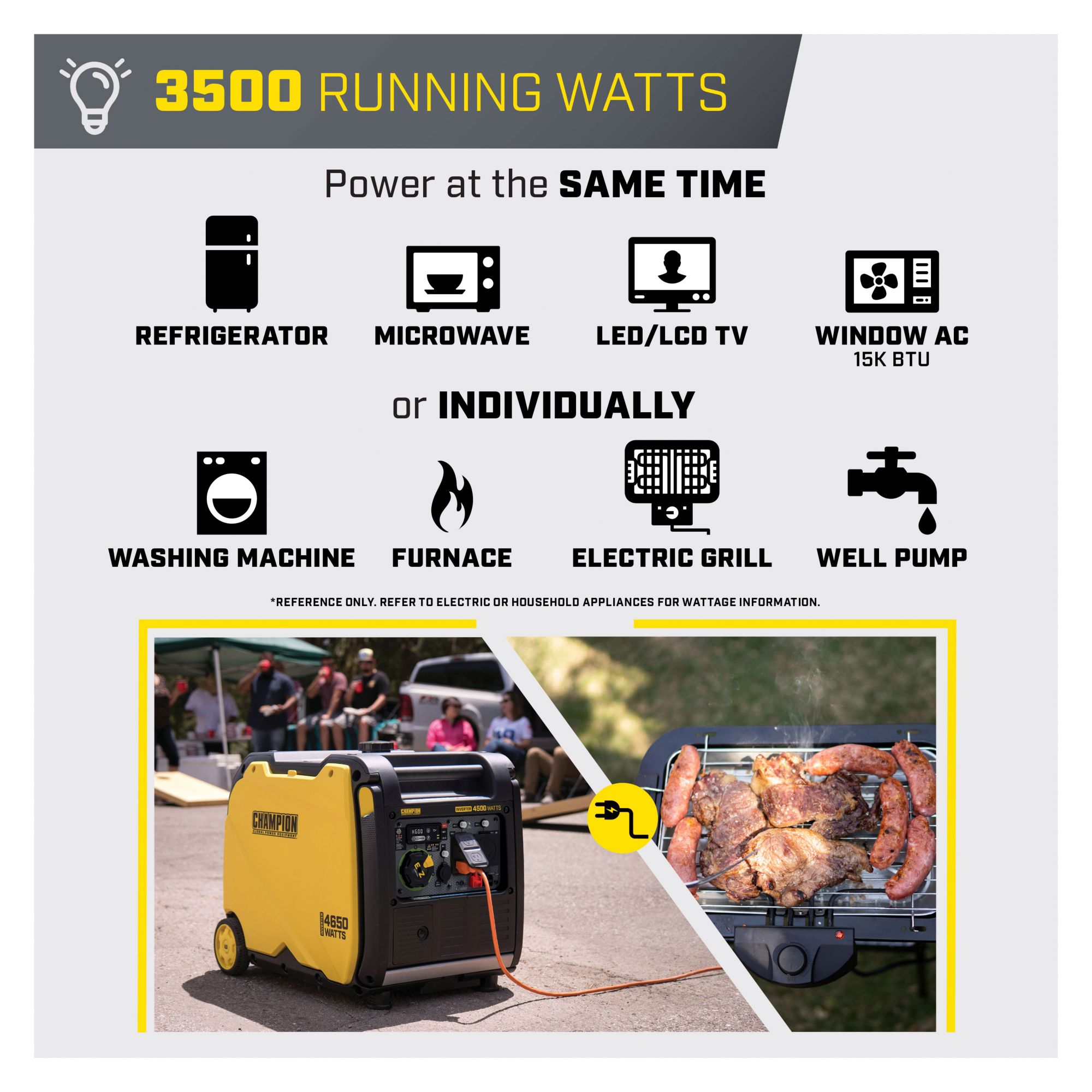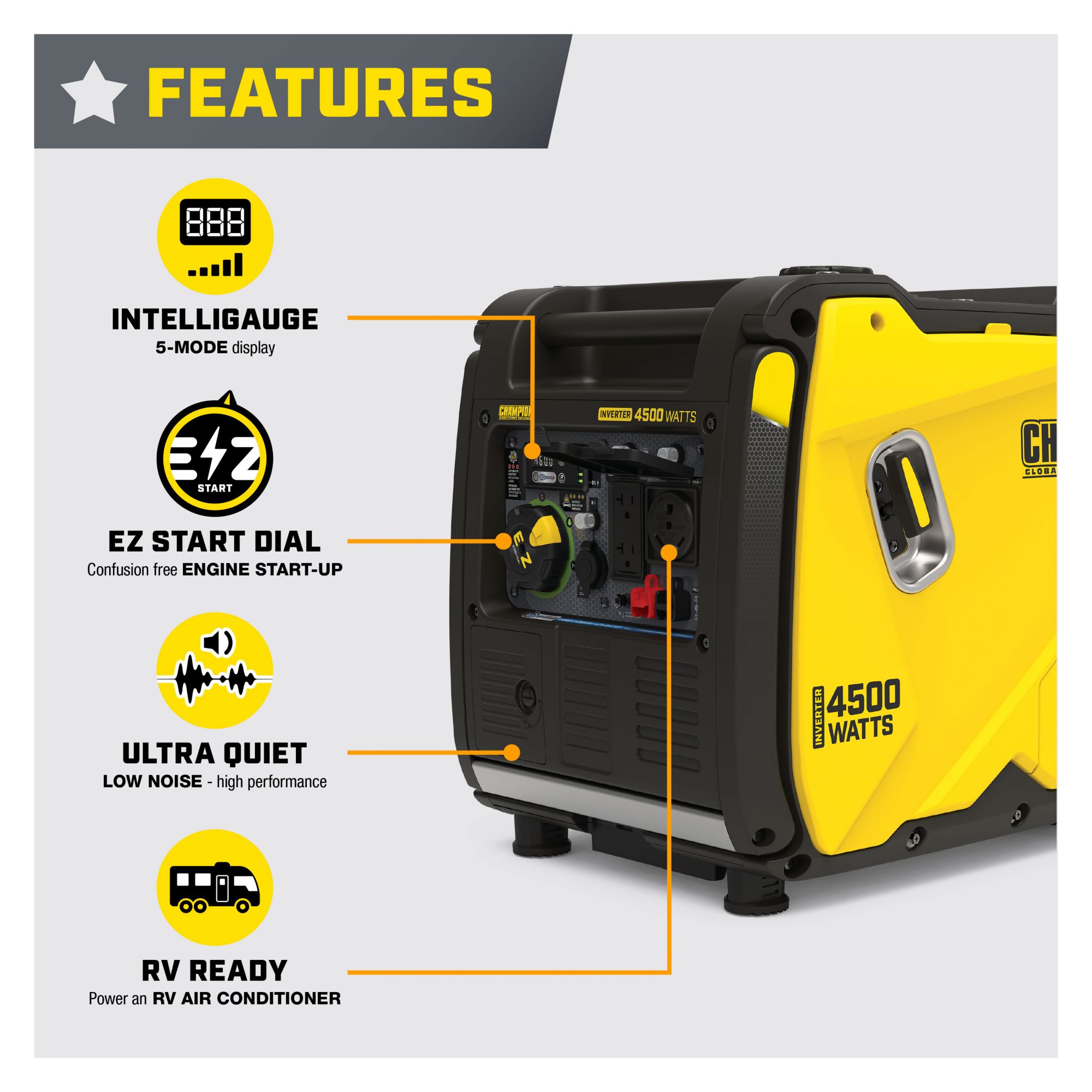 Quiet Technology and Extended Run Time: 61 dBA is great for RVs, tailgating, or camping with 4,500 starting watts and 3,500 running watts and up to 14 hours run time on only 2.3 gallons of gasoline Parallel Ready: The optional parallel kit (sold separately) enables this inverter to connect with another 2,800-watt or higher Champion inverter to double your output power Intelligauge with Power Meter: Monitor voltage, frequency and operating hours with ease, plus features CO Shield- carbon monoxide auto shutoff system, and the EZ Start Dial simplifies startup while Economy Mode monitors power consumption in real time Clean Power for Sensitive Electronics: 120V 29.2A RV outlet, and a 120V 20A household duplex outlet with clean power (less than 3% THD) Includes 3-year limited warranty with FREE lifetime technical support from dedicated experts