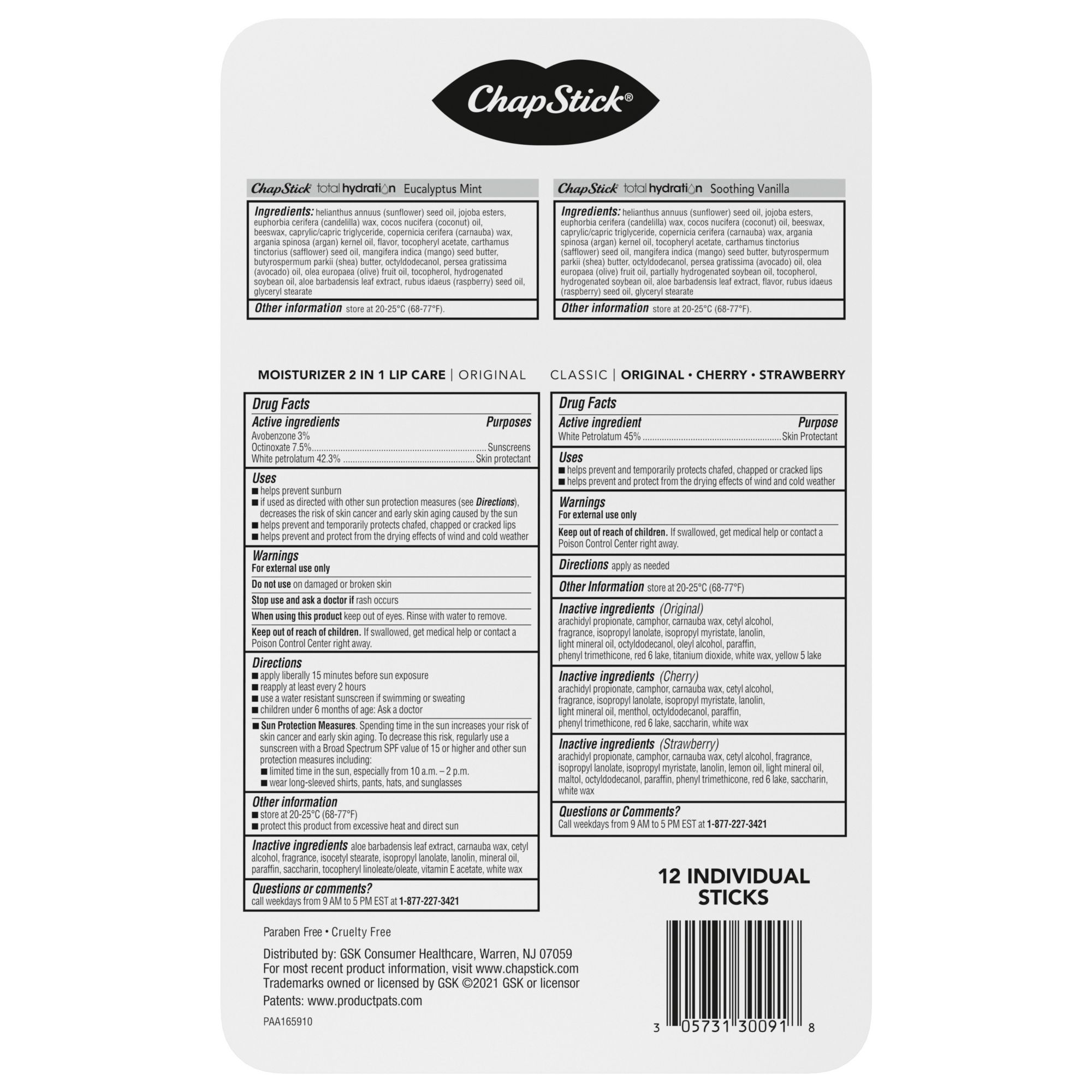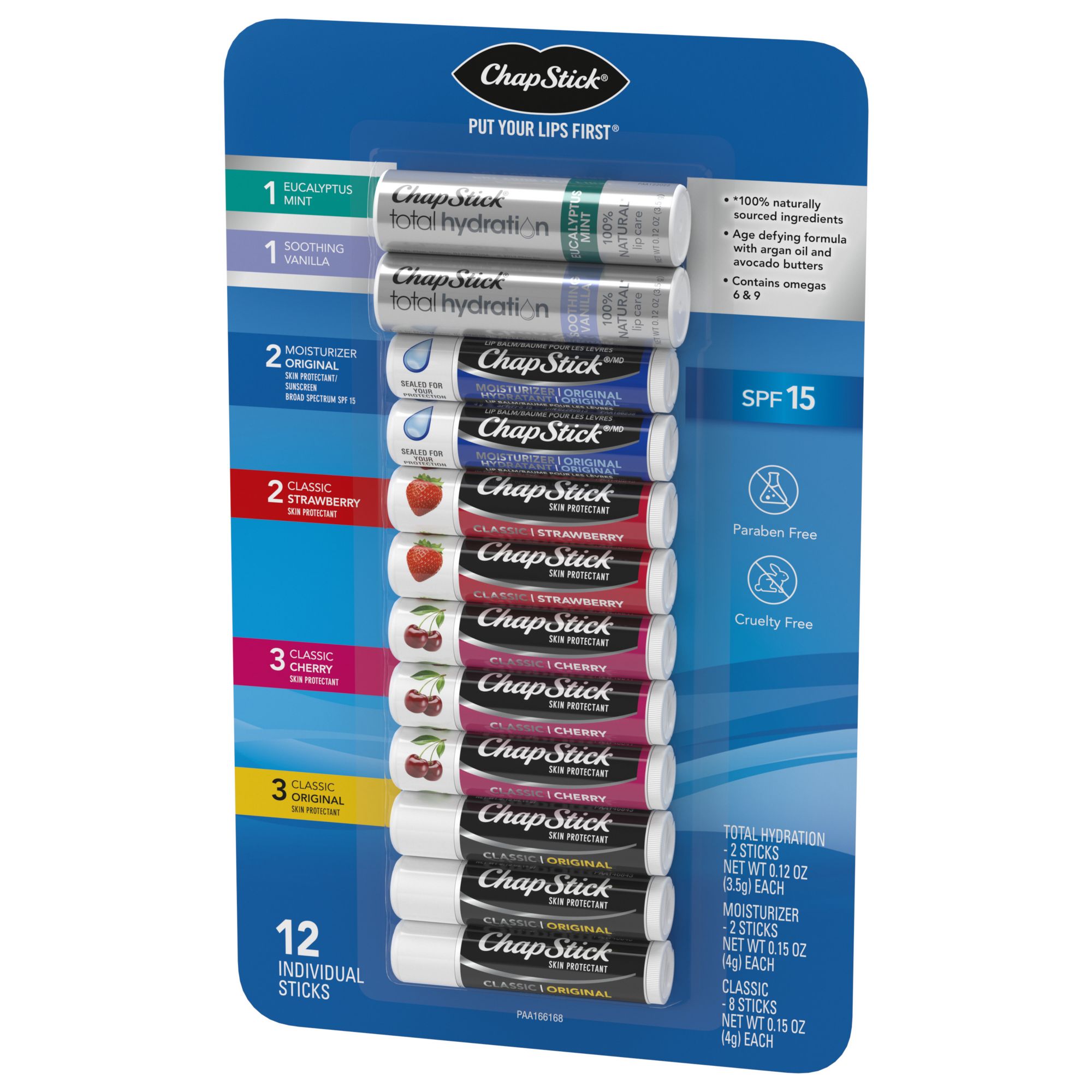 This ChapStick Variety Pack has 12 must-have lip balms to nourish, soften, hydrate and protect chapped lips. Including our Classic: Original, Cherry, Strawberry, Lip Moisturizer, Total Hydration Eucalyptus, and Total Hydration Soothing Vanilla. Provides you with much-needed lip healing and lip care that softens and moisturizes, leaving lips silky and smooth. Wherever you are take care of your lips by carrying a handy tube of ChapStick always with you. Tuck one in your purse, coat, desk drawer, and a car compartment, to keep trusted lip care within reach anytime you need it. The lip care experts for over 135 years... Apply this lip moisturizer as directed.