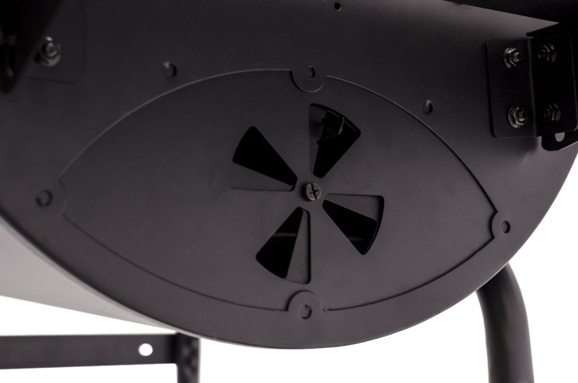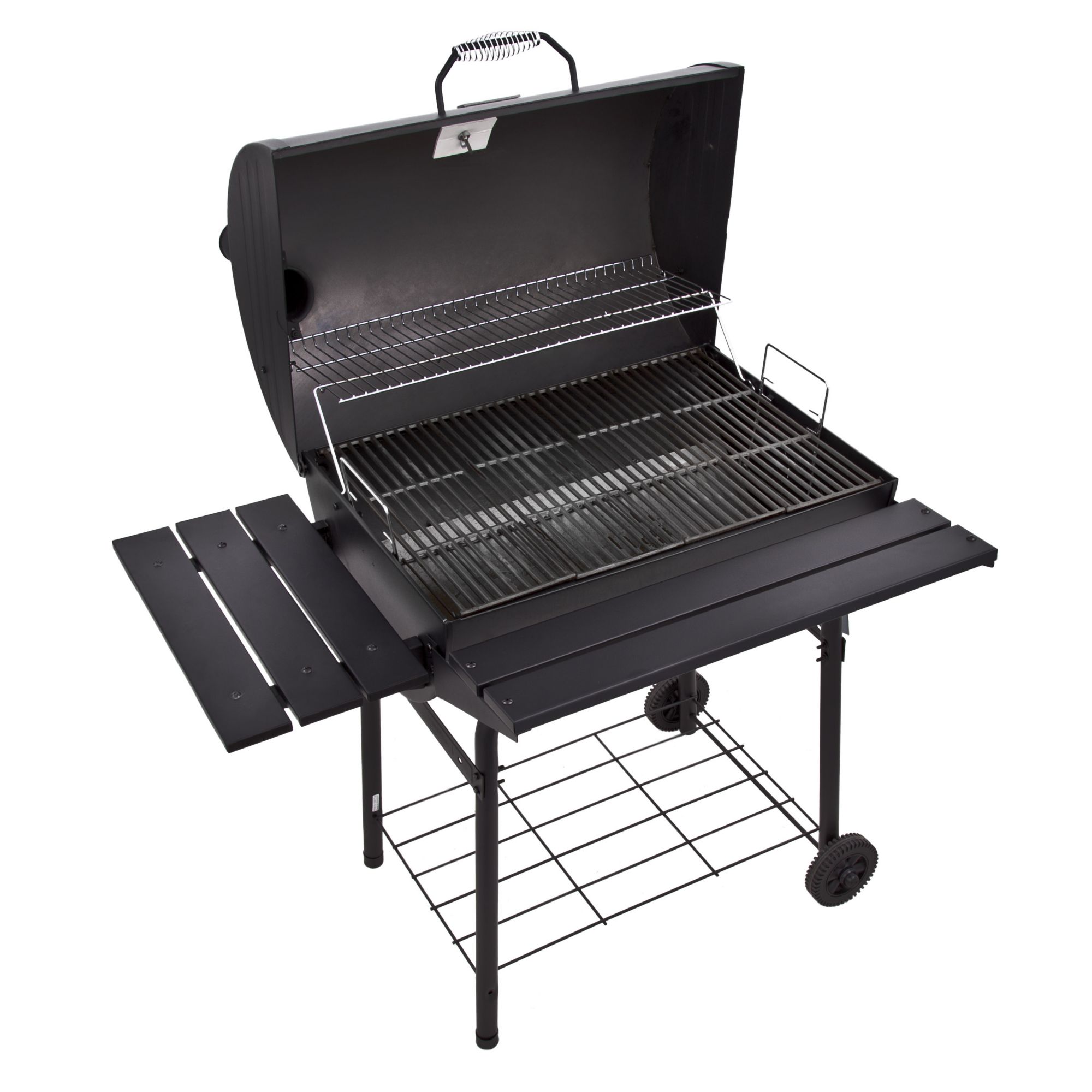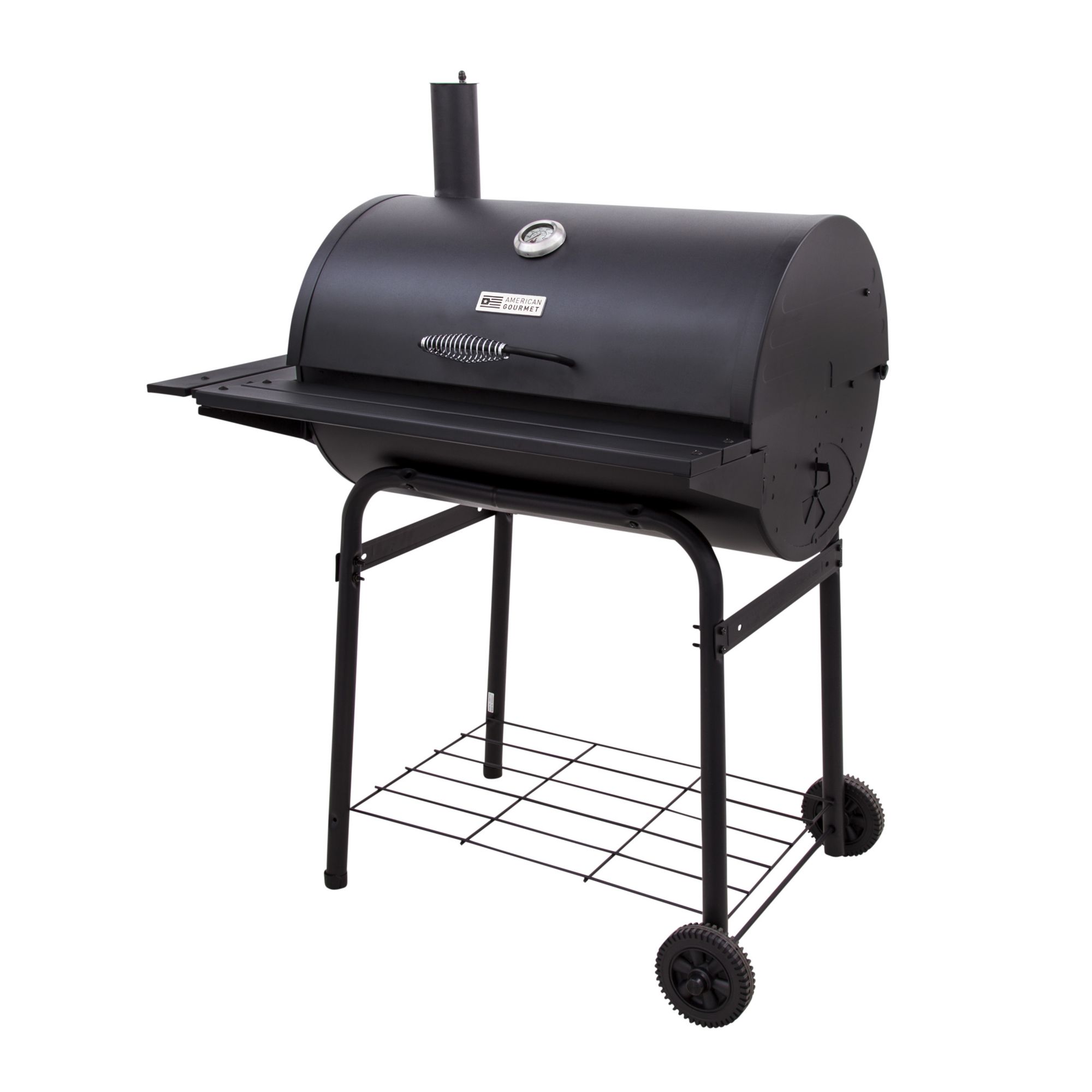 Adjustable height steel fire grates Multiple dampers offer easy heat and smoke control Top-mounted temperature gauge 840-sq.-in. of cooking space Cool-touch lid handle Full-length front shelf, three tool hooks and two folding side shelves Includes charcoal grill Warranty: 1 year grates, 1 year lid/firebox