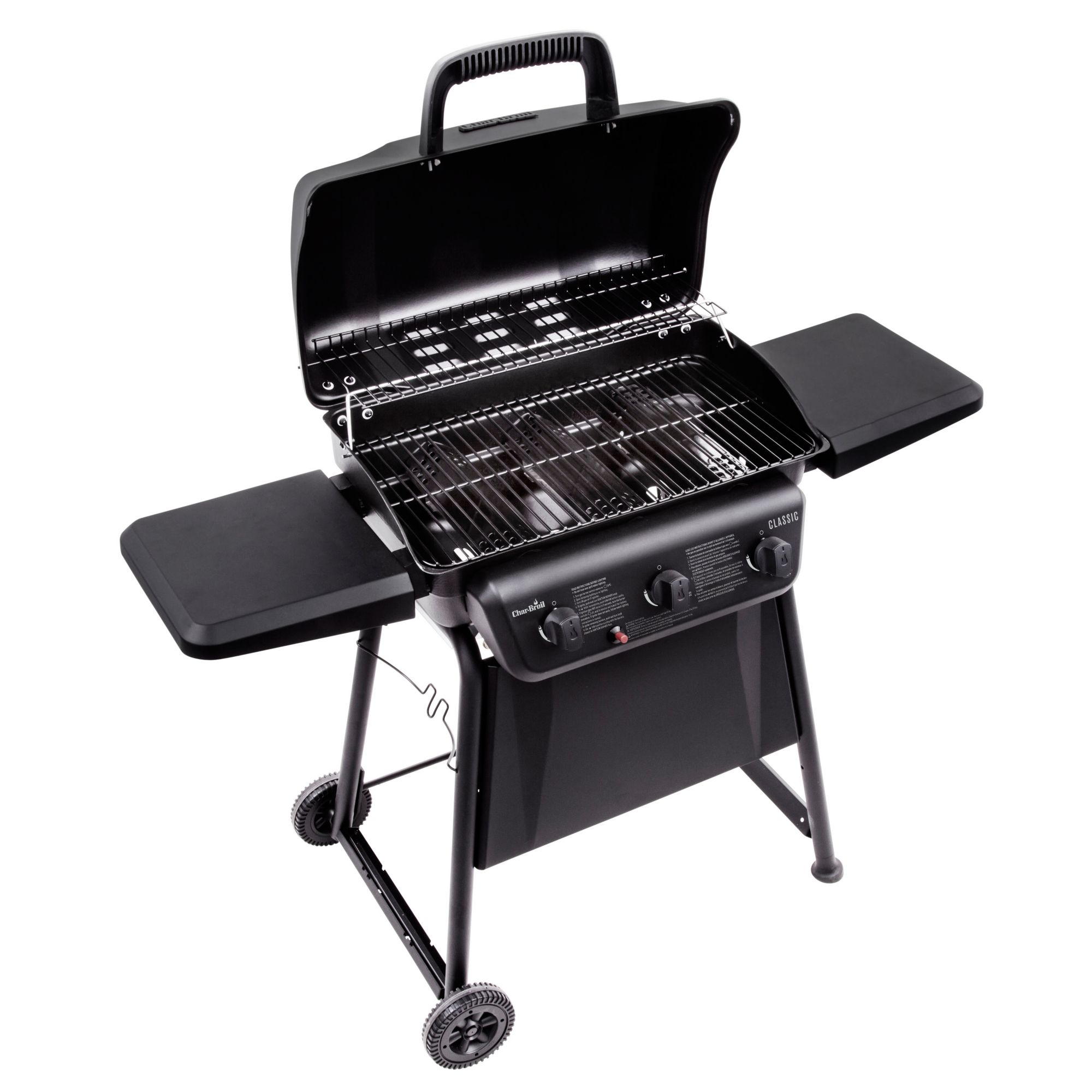The Classic Series 3-Burner Gas Grill by Char-Broil is ideal for small gatherings. This propane grill has 30,000 BTU's of cooking power, in-line stainless steel burners for even heat and a 360-sq.-in. porcelain-coated cooking grate to prevent food from sticking. The lid and firebox are constructed from porcelain-coated steel to stand up to the elements. A push button ignition ensures fast and reliable starts. The warming rack helps to keep your food warn and away from the direct heat. Two black metal side shelves to hold your tools and other cooking needs.